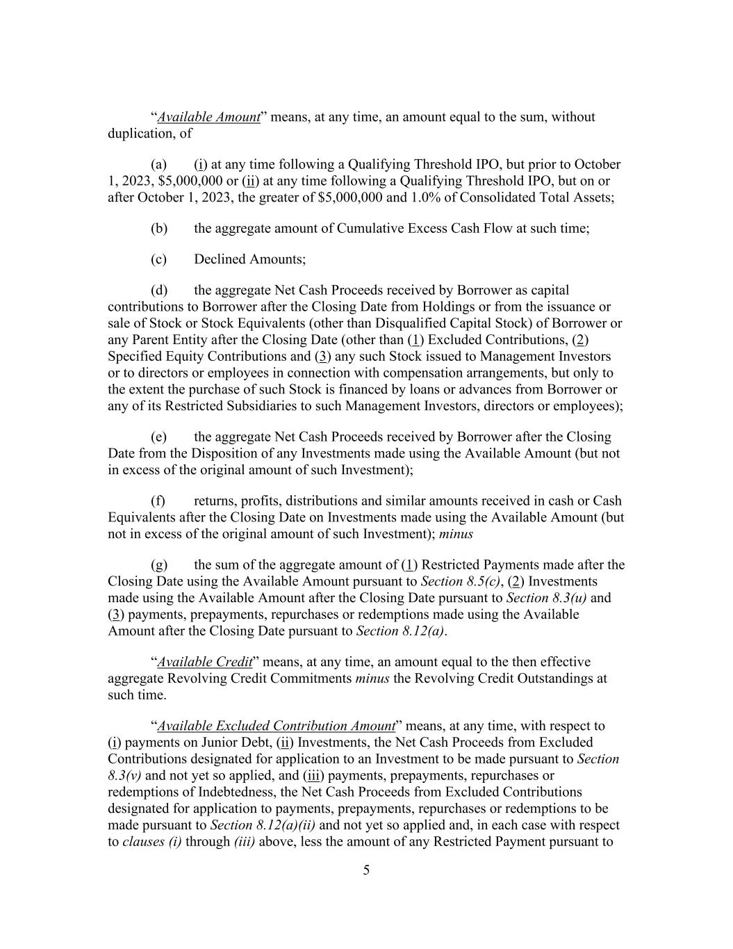 5 “Available Amount” means, at any time, an amount equal to the sum, without duplication, of (a) (i) at any time following a Qualifying Threshold IPO, but prior to October 1, 2023, $5,000,000 or (ii) at any time following a Qualifying Threshold IPO, but on or after October 1, 2023, the greater of $5,000,000 and 1.0% of Consolidated Total Assets; (b) the aggregate amount of Cumulative Excess Cash Flow at such time; (c) Declined Amounts; (d) the aggregate Net Cash Proceeds received by Borrower as capital contributions to Borrower after the Closing Date from Holdings or from the issuance or sale of Stock or Stock Equivalents (other than Disqualified Capital Stock) of Borrower or any Parent Entity after the Closing Date (other than (1) Excluded Contributions, (2) Specified Equity Contributions and (3) any such Stock issued to Management Investors or to directors or employees in connection with compensation arrangements, but only to the extent the purchase of such Stock is financed by loans or advances from Borrower or any of its Restricted Subsidiaries to such Management Investors, directors or employees); (e) the aggregate Net Cash Proceeds received by Borrower after the Closing Date from the Disposition of any Investments made using the Available Amount (but not in excess of the original amount of such Investment); (f) returns, profits, distributions and similar amounts received in cash or Cash Equivalents after the Closing Date on Investments made using the Available Amount (but not in excess of the original amount of such Investment); minus (g) the sum of the aggregate amount of (1) Restricted Payments made after the Closing Date using the Available Amount pursuant to Section 8.5(c), (2) Investments made using the Available Amount after the Closing Date pursuant to Section 8.3(u) and (3) payments, prepayments, repurchases or redemptions made using the Available Amount after the Closing Date pursuant to Section 8.12(a). “Available Credit” means, at any time, an amount equal to the then effective aggregate Revolving Credit Commitments minus the Revolving Credit Outstandings at such time. “Available Excluded Contribution Amount” means, at any time, with respect to (i) payments on Junior Debt, (ii) Investments, the Net Cash Proceeds from Excluded Contributions designated for application to an Investment to be made pursuant to Section 8.3(v) and not yet so applied, and (iii) payments, prepayments, repurchases or redemptions of Indebtedness, the Net Cash Proceeds from Excluded Contributions designated for application to payments, prepayments, repurchases or redemptions to be made pursuant to Section 8.12(a)(ii) and not yet so applied and, in each case with respect to clauses (i) through (iii) above, less the amount of any Restricted Payment pursuant to