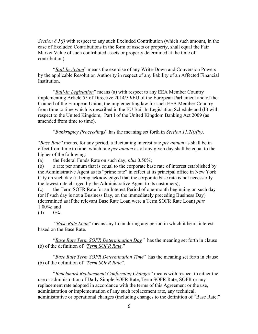 6 Section 8.5(j) with respect to any such Excluded Contribution (which such amount, in the case of Excluded Contributions in the form of assets or property, shall equal the Fair Market Value of such contributed assets or property determined at the time of contribution). “Bail-In Action” means the exercise of any Write-Down and Conversion Powers by the applicable Resolution Authority in respect of any liability of an Affected Financial Institution. “Bail-In Legislation” means (a) with respect to any EEA Member Country implementing Article 55 of Directive 2014/59/EU of the European Parliament and of the Council of the European Union, the implementing law for such EEA Member Country from time to time which is described in the EU Bail-In Legislation Schedule and (b) with respect to the United Kingdom, Part I of the United Kingdom Banking Act 2009 (as amended from time to time). “Bankruptcy Proceedings” has the meaning set forth in Section 11.2(l)(iv). “Base Rate” means, for any period, a fluctuating interest rate per annum as shall be in effect from time to time, which rate per annum as of any given day shall be equal to the higher of the following: (a) the Federal Funds Rate on such day, plus 0.50%; (b) a rate per annum that is equal to the corporate base rate of interest established by the Administrative Agent as its “prime rate” in effect at its principal office in New York City on such day (it being acknowledged that the corporate base rate is not necessarily the lowest rate charged by the Administrative Agent to its customers); (c) the Term SOFR Rate for an Interest Period of one-month beginning on such day (or if such day is not a Business Day, on the immediately preceding Business Day) (determined as if the relevant Base Rate Loan were a Term SOFR Rate Loan) plus 1.00%; and (d) 0%. “Base Rate Loan” means any Loan during any period in which it bears interest based on the Base Rate. “Base Rate Term SOFR Determination Day” has the meaning set forth in clause (b) of the definition of “Term SOFR Rate.” “Base Rate Term SOFR Determination Time” has the meaning set forth in clause (b) of the definition of “Term SOFR Rate”. “Benchmark Replacement Conforming Changes” means with respect to either the use or administration of Daily Simple SOFR Rate, Term SOFR Rate, SOFR or any replacement rate adopted in accordance with the terms of this Agreement or the use, administration or implementation of any such replacement rate, any technical, administrative or operational changes (including changes to the definition of “Base Rate,”