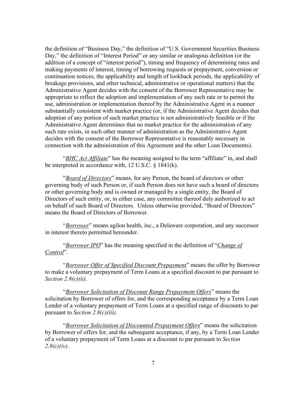 7 the definition of “Business Day,” the definition of “U.S. Government Securities Business Day,” the definition of “Interest Period” or any similar or analogous definition (or the addition of a concept of “interest period”), timing and frequency of determining rates and making payments of interest, timing of borrowing requests or prepayment, conversion or continuation notices, the applicability and length of lookback periods, the applicability of breakage provisions, and other technical, administrative or operational matters) that the Administrative Agent decides with the consent of the Borrower Representative may be appropriate to reflect the adoption and implementation of any such rate or to permit the use, administration or implementation thereof by the Administrative Agent in a manner substantially consistent with market practice (or, if the Administrative Agent decides that adoption of any portion of such market practice is not administratively feasible or if the Administrative Agent determines that no market practice for the administration of any such rate exists, in such other manner of administration as the Administrative Agent decides with the consent of the Borrower Representative is reasonably necessary in connection with the administration of this Agreement and the other Loan Documents). “BHC Act Affiliate” has the meaning assigned to the term “affiliate” in, and shall be interpreted in accordance with, 12 U.S.C. § 1841(k). “Board of Directors” means, for any Person, the board of directors or other governing body of such Person or, if such Person does not have such a board of directors or other governing body and is owned or managed by a single entity, the Board of Directors of such entity, or, in either case, any committee thereof duly authorized to act on behalf of such Board of Directors. Unless otherwise provided, “Board of Directors” means the Board of Directors of Borrower. “Borrower” means agilon health, inc., a Delaware corporation, and any successor in interest thereto permitted hereunder. “Borrower IPO” has the meaning specified in the definition of “Change of Control”. “Borrower Offer of Specified Discount Prepayment” means the offer by Borrower to make a voluntary prepayment of Term Loans at a specified discount to par pursuant to Section 2.8(c)(ii). “Borrower Solicitation of Discount Range Prepayment Offers” means the solicitation by Borrower of offers for, and the corresponding acceptance by a Term Loan Lender of a voluntary prepayment of Term Loans at a specified range of discounts to par pursuant to Section 2.8(c)(iii). “Borrower Solicitation of Discounted Prepayment Offers” means the solicitation by Borrower of offers for, and the subsequent acceptance, if any, by a Term Loan Lender of a voluntary prepayment of Term Loans at a discount to par pursuant to Section 2.8(c)(iv).