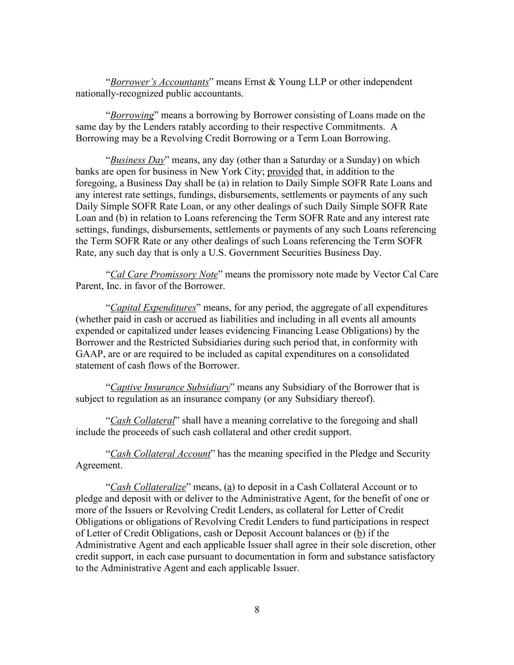 8 “Borrower’s Accountants” means Ernst & Young LLP or other independent nationally-recognized public accountants. “Borrowing” means a borrowing by Borrower consisting of Loans made on the same day by the Lenders ratably according to their respective Commitments. A Borrowing may be a Revolving Credit Borrowing or a Term Loan Borrowing. “Business Day” means, any day (other than a Saturday or a Sunday) on which banks are open for business in New York City; provided that, in addition to the foregoing, a Business Day shall be (a) in relation to Daily Simple SOFR Rate Loans and any interest rate settings, fundings, disbursements, settlements or payments of any such Daily Simple SOFR Rate Loan, or any other dealings of such Daily Simple SOFR Rate Loan and (b) in relation to Loans referencing the Term SOFR Rate and any interest rate settings, fundings, disbursements, settlements or payments of any such Loans referencing the Term SOFR Rate or any other dealings of such Loans referencing the Term SOFR Rate, any such day that is only a U.S. Government Securities Business Day. “Cal Care Promissory Note” means the promissory note made by Vector Cal Care Parent, Inc. in favor of the Borrower. “Capital Expenditures” means, for any period, the aggregate of all expenditures (whether paid in cash or accrued as liabilities and including in all events all amounts expended or capitalized under leases evidencing Financing Lease Obligations) by the Borrower and the Restricted Subsidiaries during such period that, in conformity with GAAP, are or are required to be included as capital expenditures on a consolidated statement of cash flows of the Borrower. “Captive Insurance Subsidiary” means any Subsidiary of the Borrower that is subject to regulation as an insurance company (or any Subsidiary thereof). “Cash Collateral” shall have a meaning correlative to the foregoing and shall include the proceeds of such cash collateral and other credit support. “Cash Collateral Account” has the meaning specified in the Pledge and Security Agreement. “Cash Collateralize” means, (a) to deposit in a Cash Collateral Account or to pledge and deposit with or deliver to the Administrative Agent, for the benefit of one or more of the Issuers or Revolving Credit Lenders, as collateral for Letter of Credit Obligations or obligations of Revolving Credit Lenders to fund participations in respect of Letter of Credit Obligations, cash or Deposit Account balances or (b) if the Administrative Agent and each applicable Issuer shall agree in their sole discretion, other credit support, in each case pursuant to documentation in form and substance satisfactory to the Administrative Agent and each applicable Issuer.