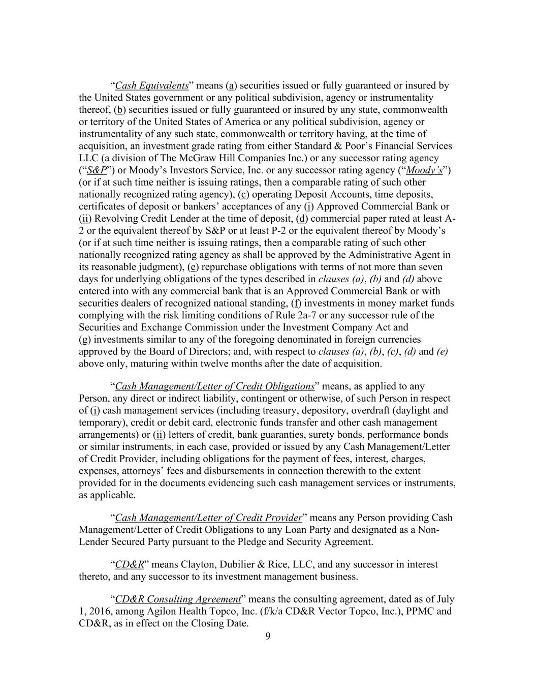 9 “Cash Equivalents” means (a) securities issued or fully guaranteed or insured by the United States government or any political subdivision, agency or instrumentality thereof, (b) securities issued or fully guaranteed or insured by any state, commonwealth or territory of the United States of America or any political subdivision, agency or instrumentality of any such state, commonwealth or territory having, at the time of acquisition, an investment grade rating from either Standard & Poor’s Financial Services LLC (a division of The McGraw Hill Companies Inc.) or any successor rating agency (“S&P”) or Moody’s Investors Service, Inc. or any successor rating agency (“Moody’s”) (or if at such time neither is issuing ratings, then a comparable rating of such other nationally recognized rating agency), (c) operating Deposit Accounts, time deposits, certificates of deposit or bankers’ acceptances of any (i) Approved Commercial Bank or (ii) Revolving Credit Lender at the time of deposit, (d) commercial paper rated at least A- 2 or the equivalent thereof by S&P or at least P-2 or the equivalent thereof by Moody’s (or if at such time neither is issuing ratings, then a comparable rating of such other nationally recognized rating agency as shall be approved by the Administrative Agent in its reasonable judgment), (e) repurchase obligations with terms of not more than seven days for underlying obligations of the types described in clauses (a), (b) and (d) above entered into with any commercial bank that is an Approved Commercial Bank or with securities dealers of recognized national standing, (f) investments in money market funds complying with the risk limiting conditions of Rule 2a-7 or any successor rule of the Securities and Exchange Commission under the Investment Company Act and (g) investments similar to any of the foregoing denominated in foreign currencies approved by the Board of Directors; and, with respect to clauses (a), (b), (c), (d) and (e) above only, maturing within twelve months after the date of acquisition. “Cash Management/Letter of Credit Obligations” means, as applied to any Person, any direct or indirect liability, contingent or otherwise, of such Person in respect of (i) cash management services (including treasury, depository, overdraft (daylight and temporary), credit or debit card, electronic funds transfer and other cash management arrangements) or (ii) letters of credit, bank guaranties, surety bonds, performance bonds or similar instruments, in each case, provided or issued by any Cash Management/Letter of Credit Provider, including obligations for the payment of fees, interest, charges, expenses, attorneys’ fees and disbursements in connection therewith to the extent provided for in the documents evidencing such cash management services or instruments, as applicable. “Cash Management/Letter of Credit Provider” means any Person providing Cash Management/Letter of Credit Obligations to any Loan Party and designated as a Non- Lender Secured Party pursuant to the Pledge and Security Agreement. “CD&R” means Clayton, Dubilier & Rice, LLC, and any successor in interest thereto, and any successor to its investment management business. “CD&R Consulting Agreement” means the consulting agreement, dated as of July 1, 2016, among Agilon Health Topco, Inc. (f/k/a CD&R Vector Topco, Inc.), PPMC and CD&R, as in effect on the Closing Date.