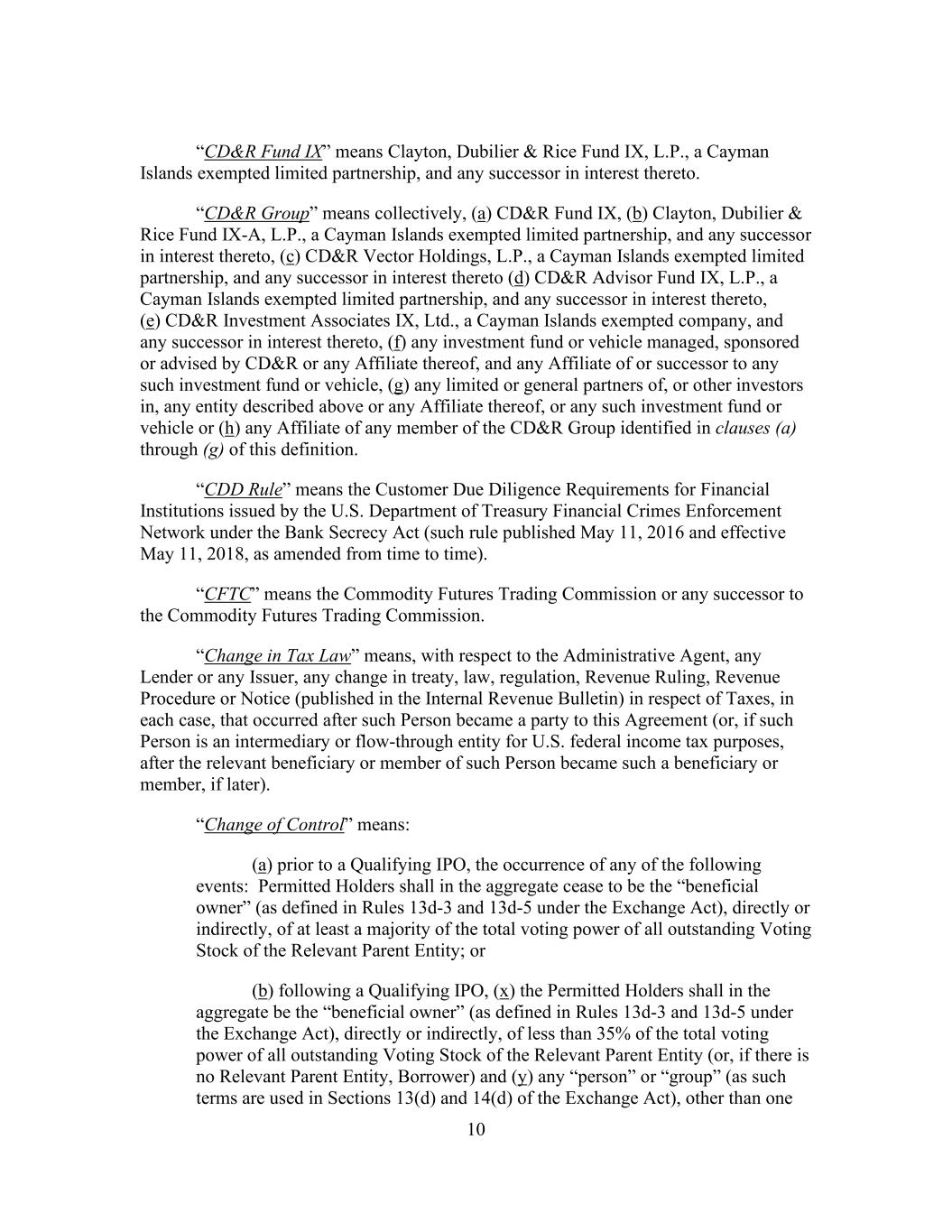 10 “CD&R Fund IX” means Clayton, Dubilier & Rice Fund IX, L.P., a Cayman Islands exempted limited partnership, and any successor in interest thereto. “CD&R Group” means collectively, (a) CD&R Fund IX, (b) Clayton, Dubilier & Rice Fund IX-A, L.P., a Cayman Islands exempted limited partnership, and any successor in interest thereto, (c) CD&R Vector Holdings, L.P., a Cayman Islands exempted limited partnership, and any successor in interest thereto (d) CD&R Advisor Fund IX, L.P., a Cayman Islands exempted limited partnership, and any successor in interest thereto, (e) CD&R Investment Associates IX, Ltd., a Cayman Islands exempted company, and any successor in interest thereto, (f) any investment fund or vehicle managed, sponsored or advised by CD&R or any Affiliate thereof, and any Affiliate of or successor to any such investment fund or vehicle, (g) any limited or general partners of, or other investors in, any entity described above or any Affiliate thereof, or any such investment fund or vehicle or (h) any Affiliate of any member of the CD&R Group identified in clauses (a) through (g) of this definition. “CDD Rule” means the Customer Due Diligence Requirements for Financial Institutions issued by the U.S. Department of Treasury Financial Crimes Enforcement Network under the Bank Secrecy Act (such rule published May 11, 2016 and effective May 11, 2018, as amended from time to time). “CFTC” means the Commodity Futures Trading Commission or any successor to the Commodity Futures Trading Commission. “Change in Tax Law” means, with respect to the Administrative Agent, any Lender or any Issuer, any change in treaty, law, regulation, Revenue Ruling, Revenue Procedure or Notice (published in the Internal Revenue Bulletin) in respect of Taxes, in each case, that occurred after such Person became a party to this Agreement (or, if such Person is an intermediary or flow-through entity for U.S. federal income tax purposes, after the relevant beneficiary or member of such Person became such a beneficiary or member, if later). “Change of Control” means: (a) prior to a Qualifying IPO, the occurrence of any of the following events: Permitted Holders shall in the aggregate cease to be the “beneficial owner” (as defined in Rules 13d-3 and 13d-5 under the Exchange Act), directly or indirectly, of at least a majority of the total voting power of all outstanding Voting Stock of the Relevant Parent Entity; or (b) following a Qualifying IPO, (x) the Permitted Holders shall in the aggregate be the “beneficial owner” (as defined in Rules 13d-3 and 13d-5 under the Exchange Act), directly or indirectly, of less than 35% of the total voting power of all outstanding Voting Stock of the Relevant Parent Entity (or, if there is no Relevant Parent Entity, Borrower) and (y) any “person” or “group” (as such terms are used in Sections 13(d) and 14(d) of the Exchange Act), other than one