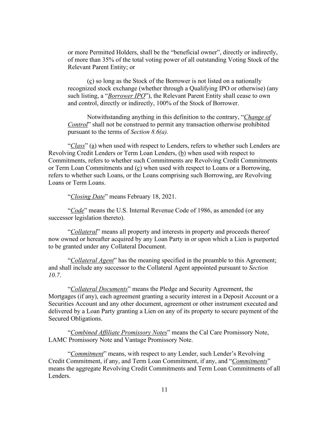 11 or more Permitted Holders, shall be the “beneficial owner”, directly or indirectly, of more than 35% of the total voting power of all outstanding Voting Stock of the Relevant Parent Entity; or (c) so long as the Stock of the Borrower is not listed on a nationally recognized stock exchange (whether through a Qualifying IPO or otherwise) (any such listing, a “Borrower IPO”), the Relevant Parent Entity shall cease to own and control, directly or indirectly, 100% of the Stock of Borrower. Notwithstanding anything in this definition to the contrary, “Change of Control” shall not be construed to permit any transaction otherwise prohibited pursuant to the terms of Section 8.6(a). “Class” (a) when used with respect to Lenders, refers to whether such Lenders are Revolving Credit Lenders or Term Loan Lenders, (b) when used with respect to Commitments, refers to whether such Commitments are Revolving Credit Commitments or Term Loan Commitments and (c) when used with respect to Loans or a Borrowing, refers to whether such Loans, or the Loans comprising such Borrowing, are Revolving Loans or Term Loans. “Closing Date” means February 18, 2021. “Code” means the U.S. Internal Revenue Code of 1986, as amended (or any successor legislation thereto). “Collateral” means all property and interests in property and proceeds thereof now owned or hereafter acquired by any Loan Party in or upon which a Lien is purported to be granted under any Collateral Document. “Collateral Agent” has the meaning specified in the preamble to this Agreement; and shall include any successor to the Collateral Agent appointed pursuant to Section 10.7. “Collateral Documents” means the Pledge and Security Agreement, the Mortgages (if any), each agreement granting a security interest in a Deposit Account or a Securities Account and any other document, agreement or other instrument executed and delivered by a Loan Party granting a Lien on any of its property to secure payment of the Secured Obligations. “Combined Affiliate Promissory Notes” means the Cal Care Promissory Note, LAMC Promissory Note and Vantage Promissory Note. “Commitment” means, with respect to any Lender, such Lender’s Revolving Credit Commitment, if any, and Term Loan Commitment, if any, and “Commitments” means the aggregate Revolving Credit Commitments and Term Loan Commitments of all Lenders.