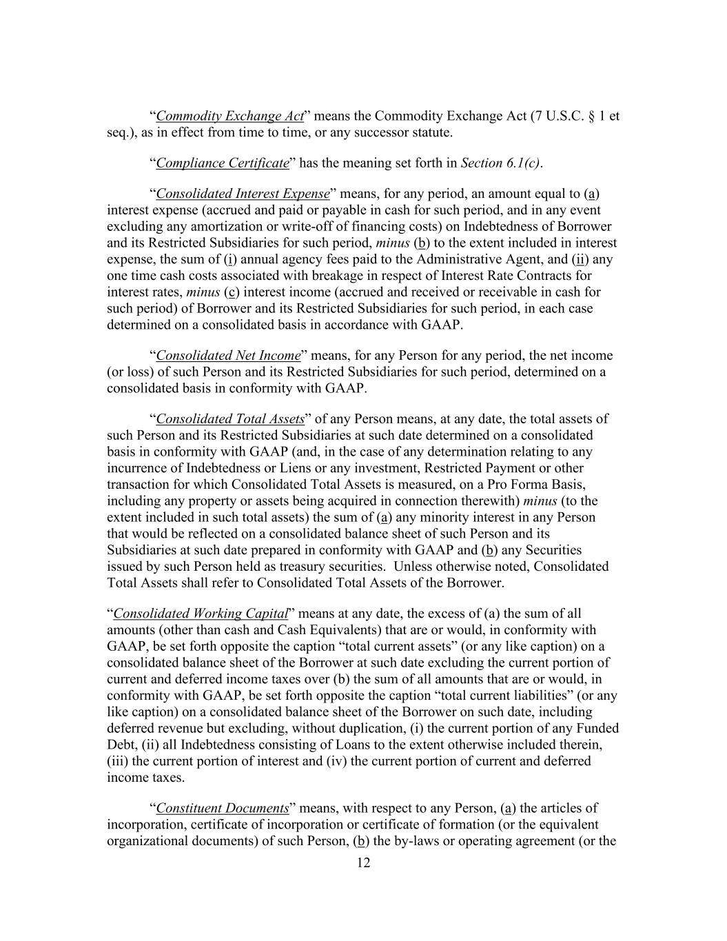 12 “Commodity Exchange Act” means the Commodity Exchange Act (7 U.S.C. § 1 et seq.), as in effect from time to time, or any successor statute. “Compliance Certificate” has the meaning set forth in Section 6.1(c). “Consolidated Interest Expense” means, for any period, an amount equal to (a) interest expense (accrued and paid or payable in cash for such period, and in any event excluding any amortization or write-off of financing costs) on Indebtedness of Borrower and its Restricted Subsidiaries for such period, minus (b) to the extent included in interest expense, the sum of (i) annual agency fees paid to the Administrative Agent, and (ii) any one time cash costs associated with breakage in respect of Interest Rate Contracts for interest rates, minus (c) interest income (accrued and received or receivable in cash for such period) of Borrower and its Restricted Subsidiaries for such period, in each case determined on a consolidated basis in accordance with GAAP. “Consolidated Net Income” means, for any Person for any period, the net income (or loss) of such Person and its Restricted Subsidiaries for such period, determined on a consolidated basis in conformity with GAAP. “Consolidated Total Assets” of any Person means, at any date, the total assets of such Person and its Restricted Subsidiaries at such date determined on a consolidated basis in conformity with GAAP (and, in the case of any determination relating to any incurrence of Indebtedness or Liens or any investment, Restricted Payment or other transaction for which Consolidated Total Assets is measured, on a Pro Forma Basis, including any property or assets being acquired in connection therewith) minus (to the extent included in such total assets) the sum of (a) any minority interest in any Person that would be reflected on a consolidated balance sheet of such Person and its Subsidiaries at such date prepared in conformity with GAAP and (b) any Securities issued by such Person held as treasury securities. Unless otherwise noted, Consolidated Total Assets shall refer to Consolidated Total Assets of the Borrower. “Consolidated Working Capital” means at any date, the excess of (a) the sum of all amounts (other than cash and Cash Equivalents) that are or would, in conformity with GAAP, be set forth opposite the caption “total current assets” (or any like caption) on a consolidated balance sheet of the Borrower at such date excluding the current portion of current and deferred income taxes over (b) the sum of all amounts that are or would, in conformity with GAAP, be set forth opposite the caption “total current liabilities” (or any like caption) on a consolidated balance sheet of the Borrower on such date, including deferred revenue but excluding, without duplication, (i) the current portion of any Funded Debt, (ii) all Indebtedness consisting of Loans to the extent otherwise included therein, (iii) the current portion of interest and (iv) the current portion of current and deferred income taxes. “Constituent Documents” means, with respect to any Person, (a) the articles of incorporation, certificate of incorporation or certificate of formation (or the equivalent organizational documents) of such Person, (b) the by-laws or operating agreement (or the