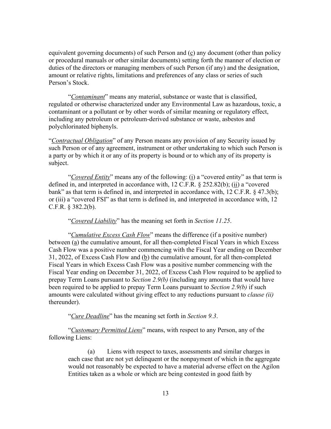 13 equivalent governing documents) of such Person and (c) any document (other than policy or procedural manuals or other similar documents) setting forth the manner of election or duties of the directors or managing members of such Person (if any) and the designation, amount or relative rights, limitations and preferences of any class or series of such Person’s Stock. “Contaminant” means any material, substance or waste that is classified, regulated or otherwise characterized under any Environmental Law as hazardous, toxic, a contaminant or a pollutant or by other words of similar meaning or regulatory effect, including any petroleum or petroleum-derived substance or waste, asbestos and polychlorinated biphenyls. “Contractual Obligation” of any Person means any provision of any Security issued by such Person or of any agreement, instrument or other undertaking to which such Person is a party or by which it or any of its property is bound or to which any of its property is subject. “Covered Entity” means any of the following: (i) a “covered entity” as that term is defined in, and interpreted in accordance with, 12 C.F.R. § 252.82(b); (ii) a “covered bank” as that term is defined in, and interpreted in accordance with, 12 C.F.R. § 47.3(b); or (iii) a “covered FSI” as that term is defined in, and interpreted in accordance with, 12 C.F.R. § 382.2(b). “Covered Liability” has the meaning set forth in Section 11.25. “Cumulative Excess Cash Flow” means the difference (if a positive number) between (a) the cumulative amount, for all then-completed Fiscal Years in which Excess Cash Flow was a positive number commencing with the Fiscal Year ending on December 31, 2022, of Excess Cash Flow and (b) the cumulative amount, for all then-completed Fiscal Years in which Excess Cash Flow was a positive number commencing with the Fiscal Year ending on December 31, 2022, of Excess Cash Flow required to be applied to prepay Term Loans pursuant to Section 2.9(b) (including any amounts that would have been required to be applied to prepay Term Loans pursuant to Section 2.9(b) if such amounts were calculated without giving effect to any reductions pursuant to clause (ii) thereunder). “Cure Deadline” has the meaning set forth in Section 9.3. “Customary Permitted Liens” means, with respect to any Person, any of the following Liens: (a) Liens with respect to taxes, assessments and similar charges in each case that are not yet delinquent or the nonpayment of which in the aggregate would not reasonably be expected to have a material adverse effect on the Agilon Entities taken as a whole or which are being contested in good faith by