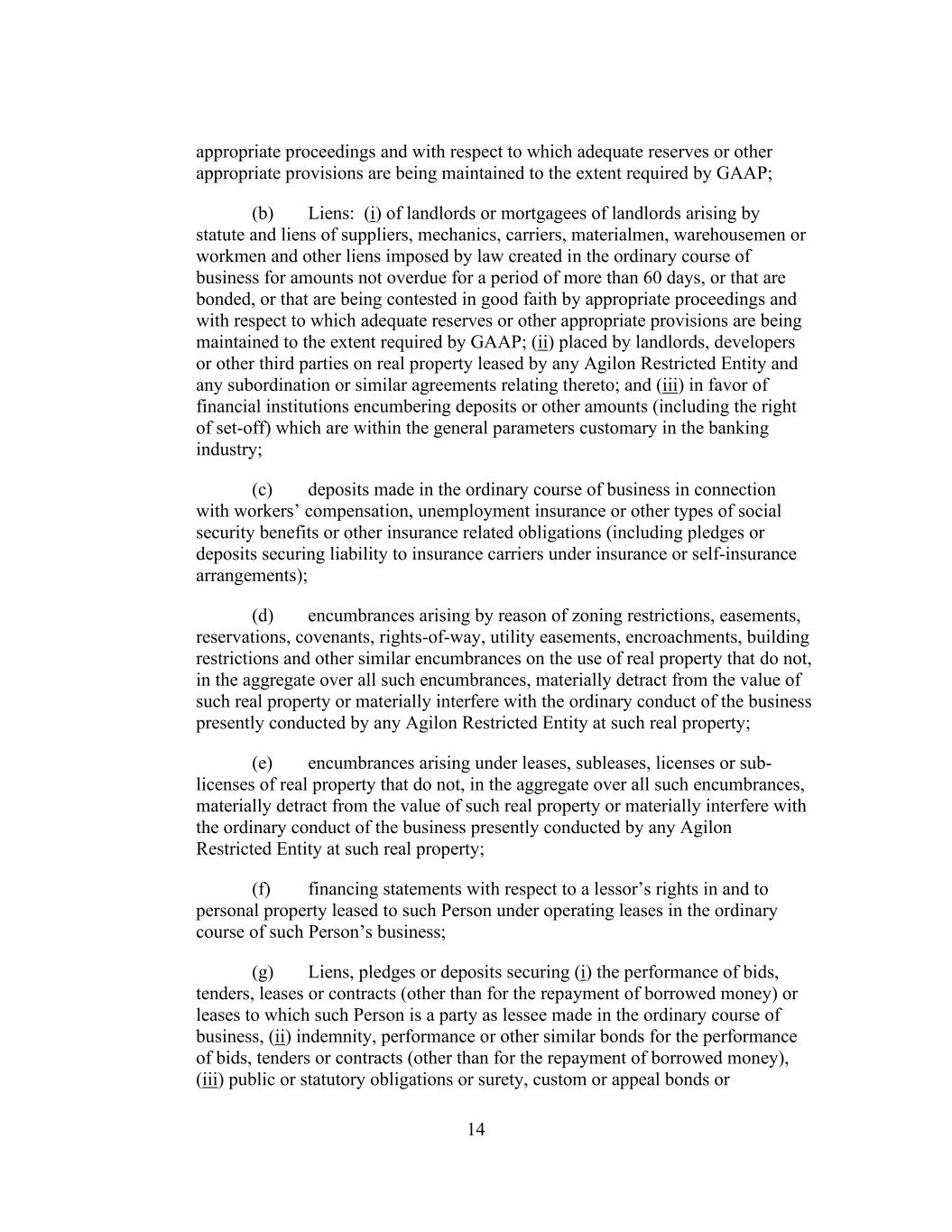 14 appropriate proceedings and with respect to which adequate reserves or other appropriate provisions are being maintained to the extent required by GAAP; (b) Liens: (i) of landlords or mortgagees of landlords arising by statute and liens of suppliers, mechanics, carriers, materialmen, warehousemen or workmen and other liens imposed by law created in the ordinary course of business for amounts not overdue for a period of more than 60 days, or that are bonded, or that are being contested in good faith by appropriate proceedings and with respect to which adequate reserves or other appropriate provisions are being maintained to the extent required by GAAP; (ii) placed by landlords, developers or other third parties on real property leased by any Agilon Restricted Entity and any subordination or similar agreements relating thereto; and (iii) in favor of financial institutions encumbering deposits or other amounts (including the right of set-off) which are within the general parameters customary in the banking industry; (c) deposits made in the ordinary course of business in connection with workers’ compensation, unemployment insurance or other types of social security benefits or other insurance related obligations (including pledges or deposits securing liability to insurance carriers under insurance or self-insurance arrangements); (d) encumbrances arising by reason of zoning restrictions, easements, reservations, covenants, rights-of-way, utility easements, encroachments, building restrictions and other similar encumbrances on the use of real property that do not, in the aggregate over all such encumbrances, materially detract from the value of such real property or materially interfere with the ordinary conduct of the business presently conducted by any Agilon Restricted Entity at such real property; (e) encumbrances arising under leases, subleases, licenses or sub- licenses of real property that do not, in the aggregate over all such encumbrances, materially detract from the value of such real property or materially interfere with the ordinary conduct of the business presently conducted by any Agilon Restricted Entity at such real property; (f) financing statements with respect to a lessor’s rights in and to personal property leased to such Person under operating leases in the ordinary course of such Person’s business; (g) Liens, pledges or deposits securing (i) the performance of bids, tenders, leases or contracts (other than for the repayment of borrowed money) or leases to which such Person is a party as lessee made in the ordinary course of business, (ii) indemnity, performance or other similar bonds for the performance of bids, tenders or contracts (other than for the repayment of borrowed money), (iii) public or statutory obligations or surety, custom or appeal bonds or