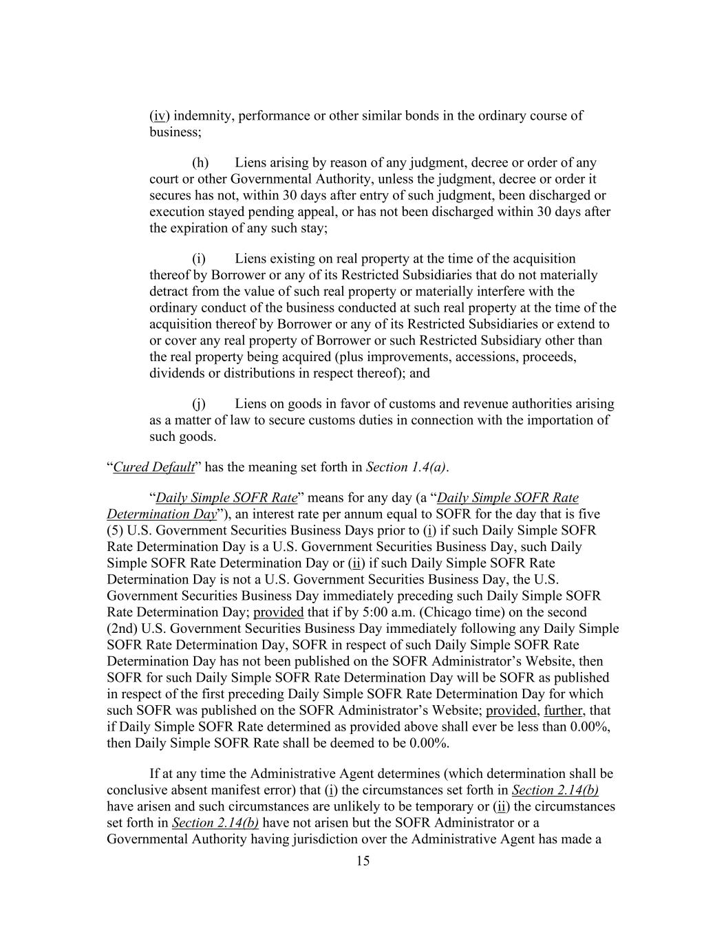 15 (iv) indemnity, performance or other similar bonds in the ordinary course of business; (h) Liens arising by reason of any judgment, decree or order of any court or other Governmental Authority, unless the judgment, decree or order it secures has not, within 30 days after entry of such judgment, been discharged or execution stayed pending appeal, or has not been discharged within 30 days after the expiration of any such stay; (i) Liens existing on real property at the time of the acquisition thereof by Borrower or any of its Restricted Subsidiaries that do not materially detract from the value of such real property or materially interfere with the ordinary conduct of the business conducted at such real property at the time of the acquisition thereof by Borrower or any of its Restricted Subsidiaries or extend to or cover any real property of Borrower or such Restricted Subsidiary other than the real property being acquired (plus improvements, accessions, proceeds, dividends or distributions in respect thereof); and (j) Liens on goods in favor of customs and revenue authorities arising as a matter of law to secure customs duties in connection with the importation of such goods. “Cured Default” has the meaning set forth in Section 1.4(a). “Daily Simple SOFR Rate” means for any day (a “Daily Simple SOFR Rate Determination Day”), an interest rate per annum equal to SOFR for the day that is five (5) U.S. Government Securities Business Days prior to (i) if such Daily Simple SOFR Rate Determination Day is a U.S. Government Securities Business Day, such Daily Simple SOFR Rate Determination Day or (ii) if such Daily Simple SOFR Rate Determination Day is not a U.S. Government Securities Business Day, the U.S. Government Securities Business Day immediately preceding such Daily Simple SOFR Rate Determination Day; provided that if by 5:00 a.m. (Chicago time) on the second (2nd) U.S. Government Securities Business Day immediately following any Daily Simple SOFR Rate Determination Day, SOFR in respect of such Daily Simple SOFR Rate Determination Day has not been published on the SOFR Administrator’s Website, then SOFR for such Daily Simple SOFR Rate Determination Day will be SOFR as published in respect of the first preceding Daily Simple SOFR Rate Determination Day for which such SOFR was published on the SOFR Administrator’s Website; provided, further, that if Daily Simple SOFR Rate determined as provided above shall ever be less than 0.00%, then Daily Simple SOFR Rate shall be deemed to be 0.00%. If at any time the Administrative Agent determines (which determination shall be conclusive absent manifest error) that (i) the circumstances set forth in Section 2.14(b) have arisen and such circumstances are unlikely to be temporary or (ii) the circumstances set forth in Section 2.14(b) have not arisen but the SOFR Administrator or a Governmental Authority having jurisdiction over the Administrative Agent has made a
