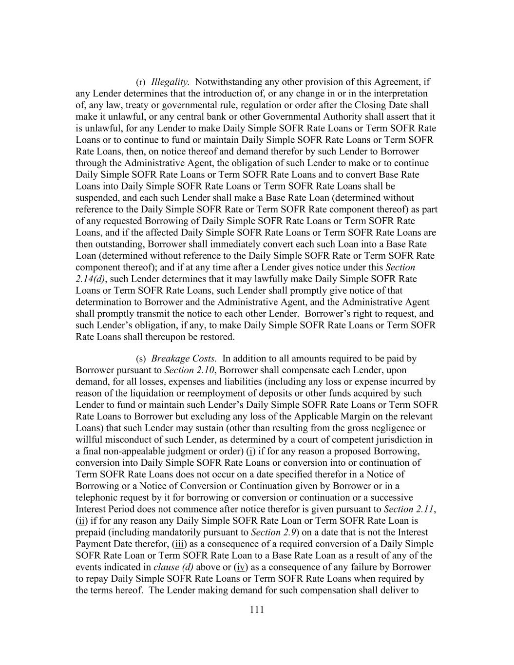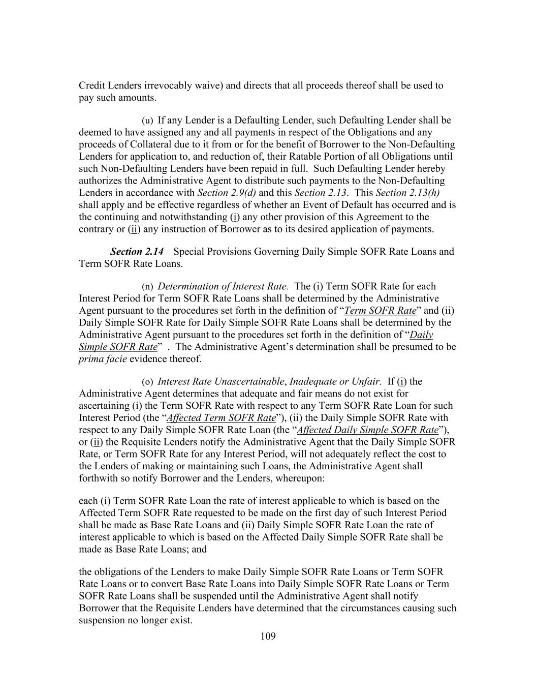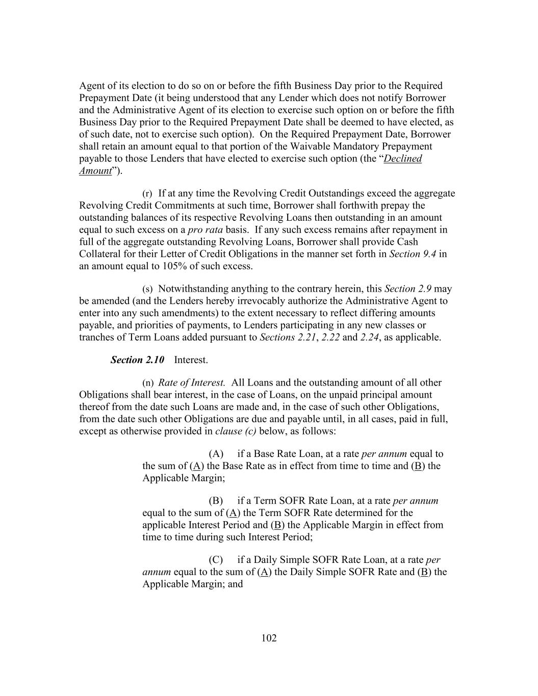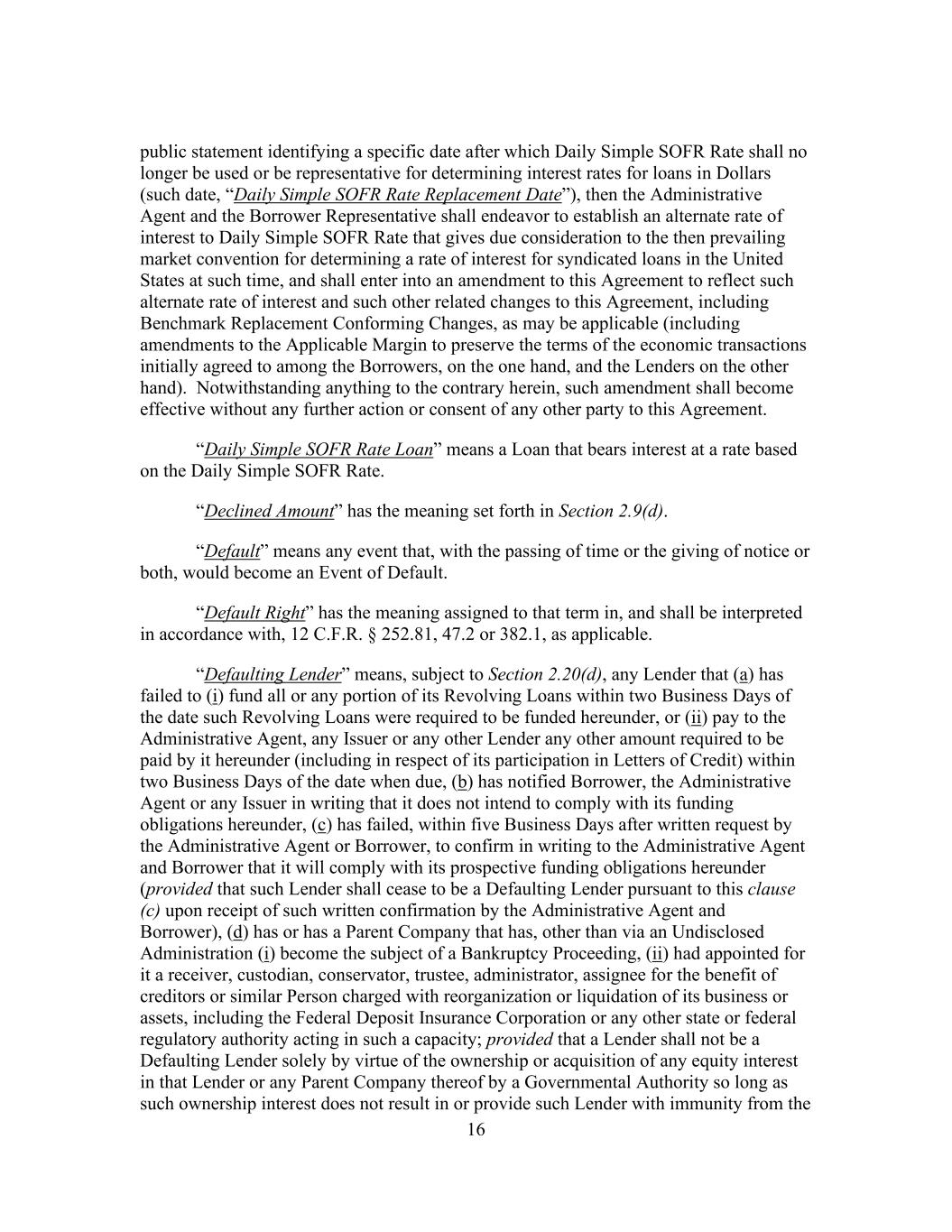 16 public statement identifying a specific date after which Daily Simple SOFR Rate shall no longer be used or be representative for determining interest rates for loans in Dollars (such date, “Daily Simple SOFR Rate Replacement Date”), then the Administrative Agent and the Borrower Representative shall endeavor to establish an alternate rate of interest to Daily Simple SOFR Rate that gives due consideration to the then prevailing market convention for determining a rate of interest for syndicated loans in the United States at such time, and shall enter into an amendment to this Agreement to reflect such alternate rate of interest and such other related changes to this Agreement, including Benchmark Replacement Conforming Changes, as may be applicable (including amendments to the Applicable Margin to preserve the terms of the economic transactions initially agreed to among the Borrowers, on the one hand, and the Lenders on the other hand). Notwithstanding anything to the contrary herein, such amendment shall become effective without any further action or consent of any other party to this Agreement. “Daily Simple SOFR Rate Loan” means a Loan that bears interest at a rate based on the Daily Simple SOFR Rate. “Declined Amount” has the meaning set forth in Section 2.9(d). “Default” means any event that, with the passing of time or the giving of notice or both, would become an Event of Default. “Default Right” has the meaning assigned to that term in, and shall be interpreted in accordance with, 12 C.F.R. § 252.81, 47.2 or 382.1, as applicable. “Defaulting Lender” means, subject to Section 2.20(d), any Lender that (a) has failed to (i) fund all or any portion of its Revolving Loans within two Business Days of the date such Revolving Loans were required to be funded hereunder, or (ii) pay to the Administrative Agent, any Issuer or any other Lender any other amount required to be paid by it hereunder (including in respect of its participation in Letters of Credit) within two Business Days of the date when due, (b) has notified Borrower, the Administrative Agent or any Issuer in writing that it does not intend to comply with its funding obligations hereunder, (c) has failed, within five Business Days after written request by the Administrative Agent or Borrower, to confirm in writing to the Administrative Agent and Borrower that it will comply with its prospective funding obligations hereunder (provided that such Lender shall cease to be a Defaulting Lender pursuant to this clause (c) upon receipt of such written confirmation by the Administrative Agent and Borrower), (d) has or has a Parent Company that has, other than via an Undisclosed Administration (i) become the subject of a Bankruptcy Proceeding, (ii) had appointed for it a receiver, custodian, conservator, trustee, administrator, assignee for the benefit of creditors or similar Person charged with reorganization or liquidation of its business or assets, including the Federal Deposit Insurance Corporation or any other state or federal regulatory authority acting in such a capacity; provided that a Lender shall not be a Defaulting Lender solely by virtue of the ownership or acquisition of any equity interest in that Lender or any Parent Company thereof by a Governmental Authority so long as such ownership interest does not result in or provide such Lender with immunity from the
