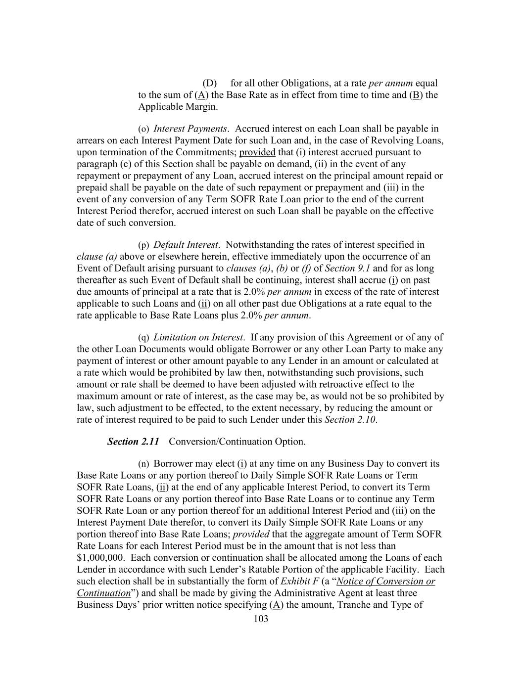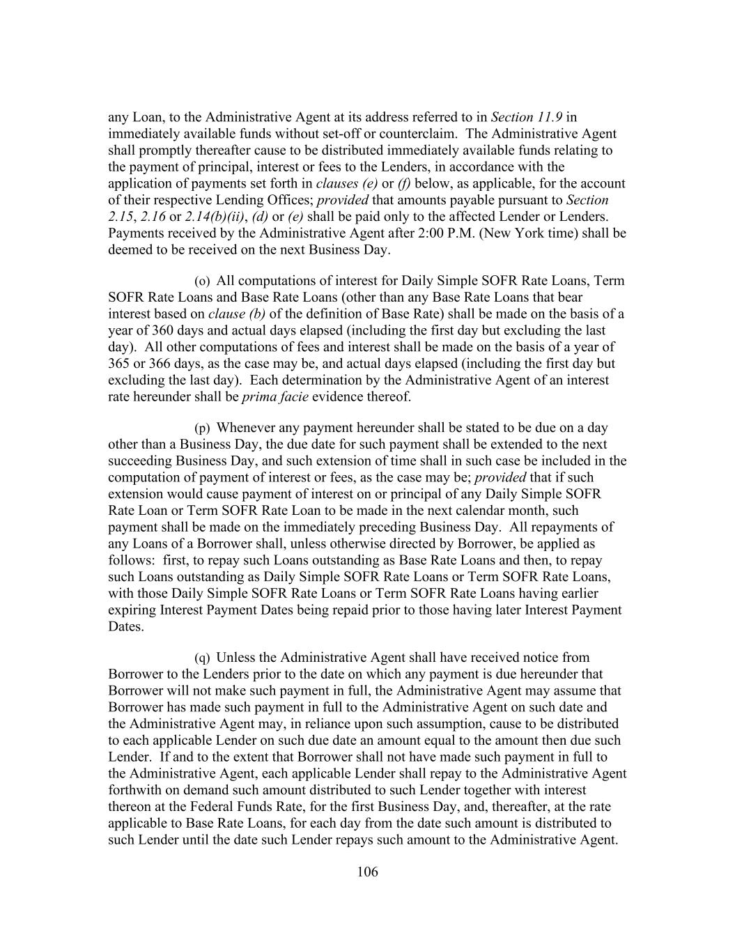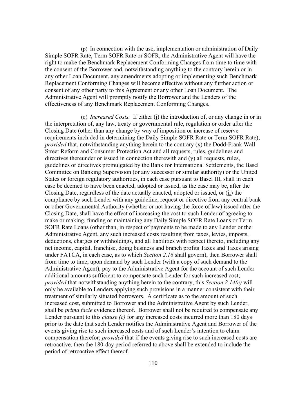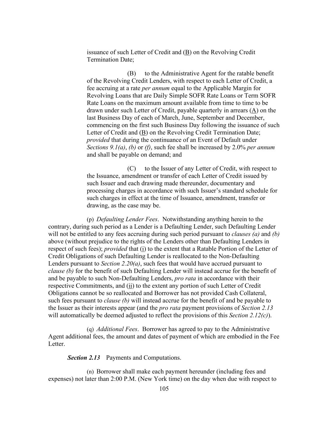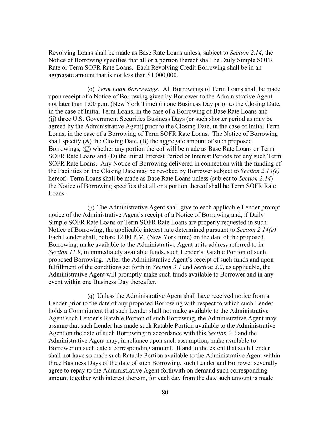 16 public statement identifying a specific date after which Daily Simple SOFR Rate shall no longer be used or be representative for determining interest rates for loans in Dollars (such date, “Daily Simple SOFR Rate Replacement Date”), then the Administrative Agent and the Borrower Representative shall endeavor to establish an alternate rate of interest to Daily Simple SOFR Rate that gives due consideration to the then prevailing market convention for determining a rate of interest for syndicated loans in the United States at such time, and shall enter into an amendment to this Agreement to reflect such alternate rate of interest and such other related changes to this Agreement, including Benchmark Replacement Conforming Changes, as may be applicable (including amendments to the Applicable Margin to preserve the terms of the economic transactions initially agreed to among the Borrowers, on the one hand, and the Lenders on the other hand). Notwithstanding anything to the contrary herein, such amendment shall become effective without any further action or consent of any other party to this Agreement. “Daily Simple SOFR Rate Loan” means a Loan that bears interest at a rate based on the Daily Simple SOFR Rate. “Declined Amount” has the meaning set forth in Section 2.9(d). “Default” means any event that, with the passing of time or the giving of notice or both, would become an Event of Default. “Default Right” has the meaning assigned to that term in, and shall be interpreted in accordance with, 12 C.F.R. § 252.81, 47.2 or 382.1, as applicable. “Defaulting Lender” means, subject to Section 2.20(d), any Lender that (a) has failed to (i) fund all or any portion of its Revolving Loans within two Business Days of the date such Revolving Loans were required to be funded hereunder, or (ii) pay to the Administrative Agent, any Issuer or any other Lender any other amount required to be paid by it hereunder (including in respect of its participation in Letters of Credit) within two Business Days of the date when due, (b) has notified Borrower, the Administrative Agent or any Issuer in writing that it does not intend to comply with its funding obligations hereunder, (c) has failed, within five Business Days after written request by the Administrative Agent or Borrower, to confirm in writing to the Administrative Agent and Borrower that it will comply with its prospective funding obligations hereunder (provided that such Lender shall cease to be a Defaulting Lender pursuant to this clause (c) upon receipt of such written confirmation by the Administrative Agent and Borrower), (d) has or has a Parent Company that has, other than via an Undisclosed Administration (i) become the subject of a Bankruptcy Proceeding, (ii) had appointed for it a receiver, custodian, conservator, trustee, administrator, assignee for the benefit of creditors or similar Person charged with reorganization or liquidation of its business or assets, including the Federal Deposit Insurance Corporation or any other state or federal regulatory authority acting in such a capacity; provided that a Lender shall not be a Defaulting Lender solely by virtue of the ownership or acquisition of any equity interest in that Lender or any Parent Company thereof by a Governmental Authority so long as such ownership interest does not result in or provide such Lender with immunity from the