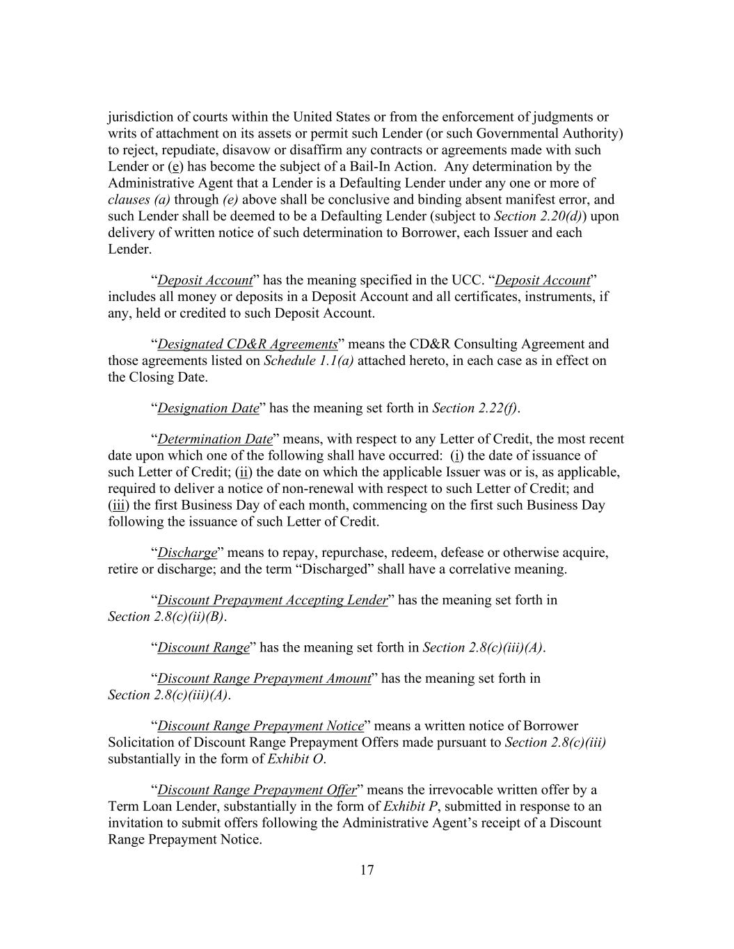 17 jurisdiction of courts within the United States or from the enforcement of judgments or writs of attachment on its assets or permit such Lender (or such Governmental Authority) to reject, repudiate, disavow or disaffirm any contracts or agreements made with such Lender or (e) has become the subject of a Bail-In Action. Any determination by the Administrative Agent that a Lender is a Defaulting Lender under any one or more of clauses (a) through (e) above shall be conclusive and binding absent manifest error, and such Lender shall be deemed to be a Defaulting Lender (subject to Section 2.20(d)) upon delivery of written notice of such determination to Borrower, each Issuer and each Lender. “Deposit Account” has the meaning specified in the UCC. “Deposit Account” includes all money or deposits in a Deposit Account and all certificates, instruments, if any, held or credited to such Deposit Account. “Designated CD&R Agreements” means the CD&R Consulting Agreement and those agreements listed on Schedule 1.1(a) attached hereto, in each case as in effect on the Closing Date. “Designation Date” has the meaning set forth in Section 2.22(f). “Determination Date” means, with respect to any Letter of Credit, the most recent date upon which one of the following shall have occurred: (i) the date of issuance of such Letter of Credit; (ii) the date on which the applicable Issuer was or is, as applicable, required to deliver a notice of non-renewal with respect to such Letter of Credit; and (iii) the first Business Day of each month, commencing on the first such Business Day following the issuance of such Letter of Credit. “Discharge” means to repay, repurchase, redeem, defease or otherwise acquire, retire or discharge; and the term “Discharged” shall have a correlative meaning. “Discount Prepayment Accepting Lender” has the meaning set forth in Section 2.8(c)(ii)(B). “Discount Range” has the meaning set forth in Section 2.8(c)(iii)(A). “Discount Range Prepayment Amount” has the meaning set forth in Section 2.8(c)(iii)(A). “Discount Range Prepayment Notice” means a written notice of Borrower Solicitation of Discount Range Prepayment Offers made pursuant to Section 2.8(c)(iii) substantially in the form of Exhibit O. “Discount Range Prepayment Offer” means the irrevocable written offer by a Term Loan Lender, substantially in the form of Exhibit P, submitted in response to an invitation to submit offers following the Administrative Agent’s receipt of a Discount Range Prepayment Notice.