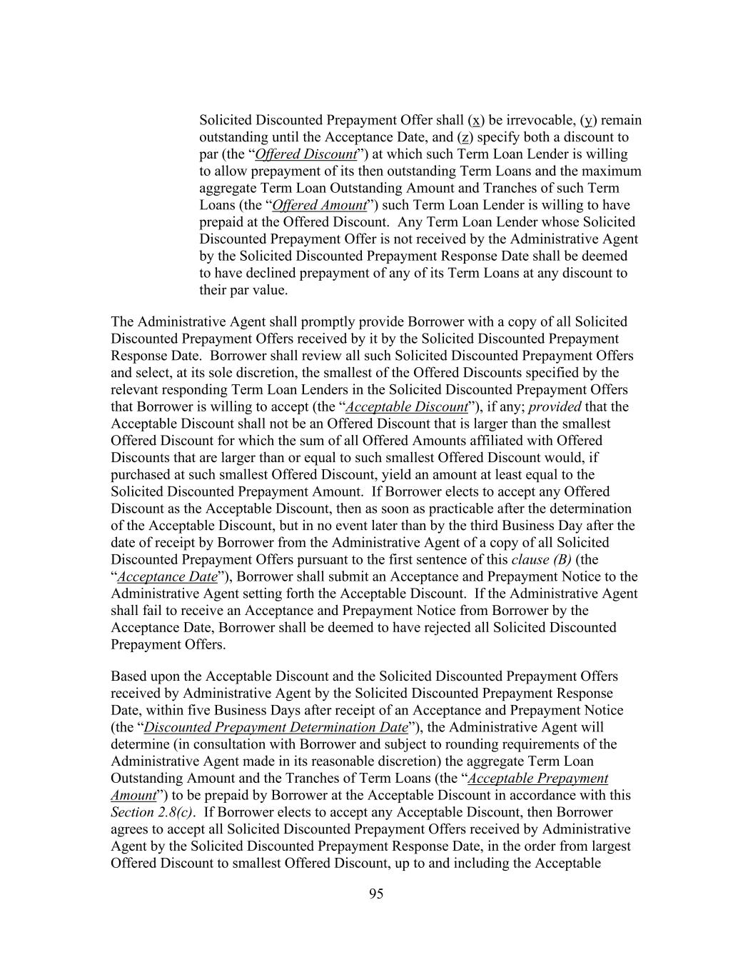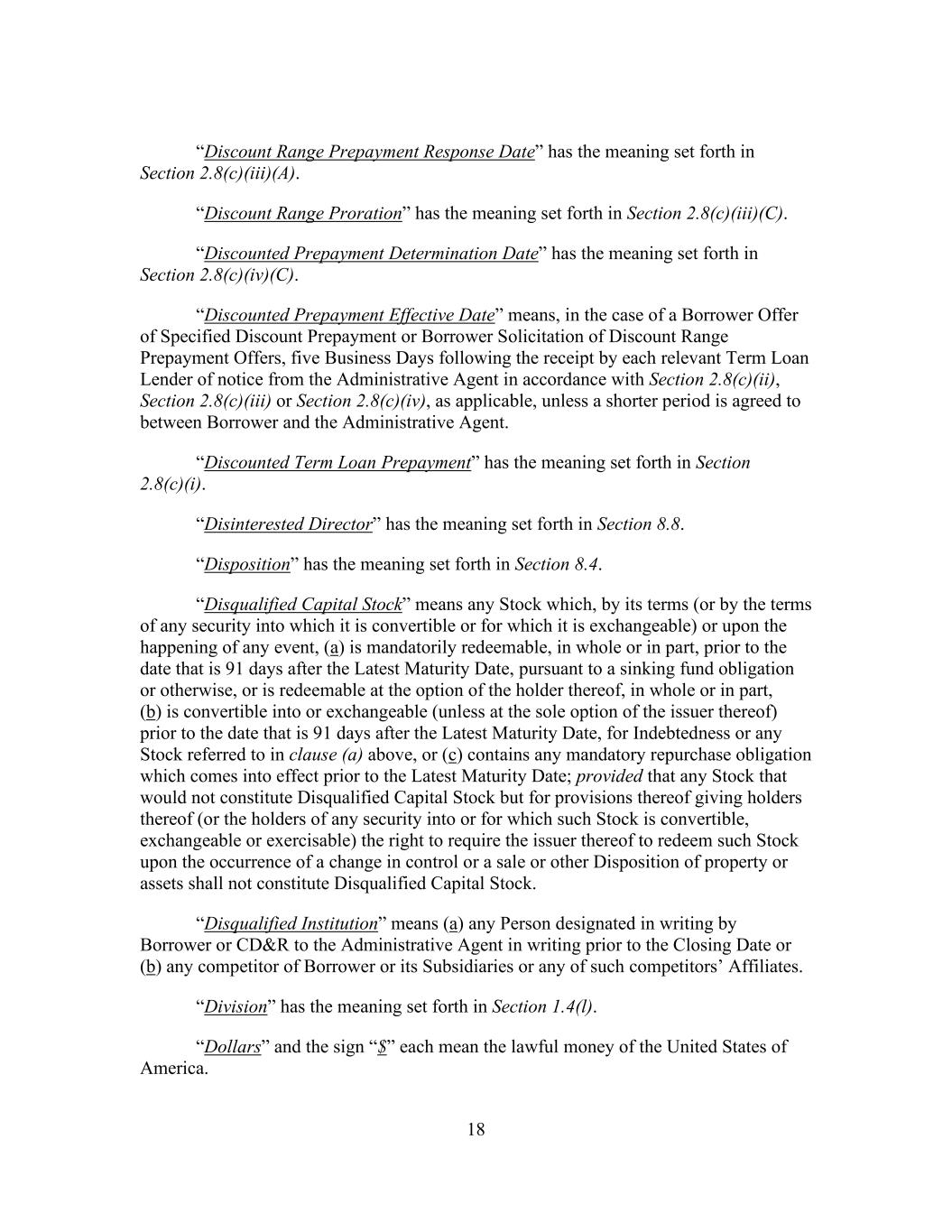 18 “Discount Range Prepayment Response Date” has the meaning set forth in Section 2.8(c)(iii)(A). “Discount Range Proration” has the meaning set forth in Section 2.8(c)(iii)(C). “Discounted Prepayment Determination Date” has the meaning set forth in Section 2.8(c)(iv)(C). “Discounted Prepayment Effective Date” means, in the case of a Borrower Offer of Specified Discount Prepayment or Borrower Solicitation of Discount Range Prepayment Offers, five Business Days following the receipt by each relevant Term Loan Lender of notice from the Administrative Agent in accordance with Section 2.8(c)(ii), Section 2.8(c)(iii) or Section 2.8(c)(iv), as applicable, unless a shorter period is agreed to between Borrower and the Administrative Agent. “Discounted Term Loan Prepayment” has the meaning set forth in Section 2.8(c)(i). “Disinterested Director” has the meaning set forth in Section 8.8. “Disposition” has the meaning set forth in Section 8.4. “Disqualified Capital Stock” means any Stock which, by its terms (or by the terms of any security into which it is convertible or for which it is exchangeable) or upon the happening of any event, (a) is mandatorily redeemable, in whole or in part, prior to the date that is 91 days after the Latest Maturity Date, pursuant to a sinking fund obligation or otherwise, or is redeemable at the option of the holder thereof, in whole or in part, (b) is convertible into or exchangeable (unless at the sole option of the issuer thereof) prior to the date that is 91 days after the Latest Maturity Date, for Indebtedness or any Stock referred to in clause (a) above, or (c) contains any mandatory repurchase obligation which comes into effect prior to the Latest Maturity Date; provided that any Stock that would not constitute Disqualified Capital Stock but for provisions thereof giving holders thereof (or the holders of any security into or for which such Stock is convertible, exchangeable or exercisable) the right to require the issuer thereof to redeem such Stock upon the occurrence of a change in control or a sale or other Disposition of property or assets shall not constitute Disqualified Capital Stock. “Disqualified Institution” means (a) any Person designated in writing by Borrower or CD&R to the Administrative Agent in writing prior to the Closing Date or (b) any competitor of Borrower or its Subsidiaries or any of such competitors’ Affiliates. “Division” has the meaning set forth in Section 1.4(l). “Dollars” and the sign “$” each mean the lawful money of the United States of America.