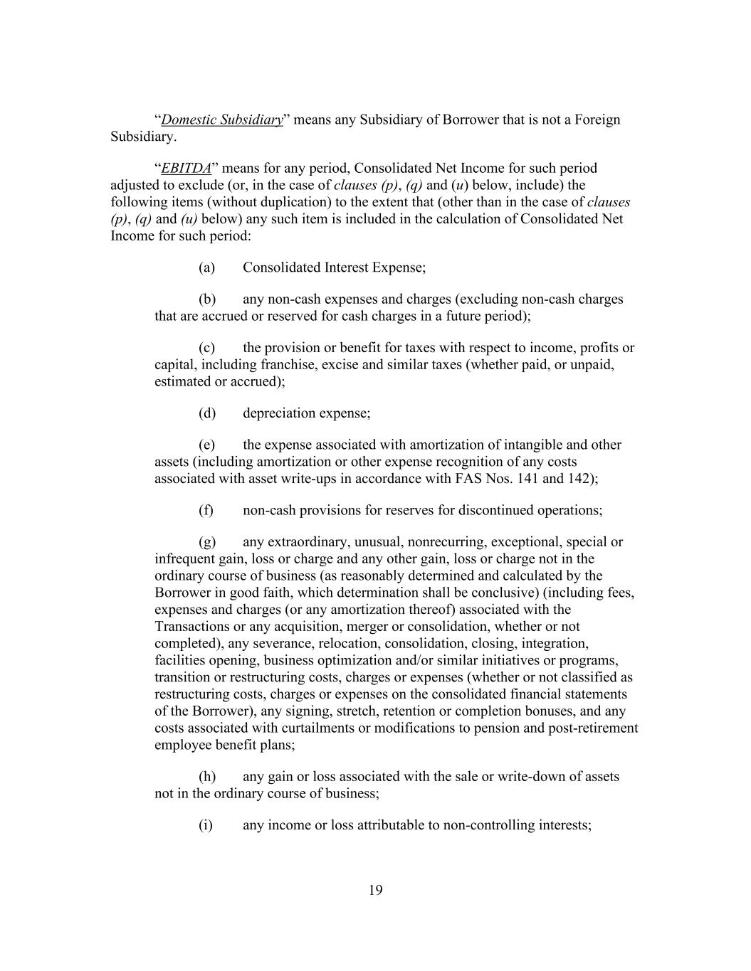 19 “Domestic Subsidiary” means any Subsidiary of Borrower that is not a Foreign Subsidiary. “EBITDA” means for any period, Consolidated Net Income for such period adjusted to exclude (or, in the case of clauses (p), (q) and (u) below, include) the following items (without duplication) to the extent that (other than in the case of clauses (p), (q) and (u) below) any such item is included in the calculation of Consolidated Net Income for such period: (a) Consolidated Interest Expense; (b) any non-cash expenses and charges (excluding non-cash charges that are accrued or reserved for cash charges in a future period); (c) the provision or benefit for taxes with respect to income, profits or capital, including franchise, excise and similar taxes (whether paid, or unpaid, estimated or accrued); (d) depreciation expense; (e) the expense associated with amortization of intangible and other assets (including amortization or other expense recognition of any costs associated with asset write-ups in accordance with FAS Nos. 141 and 142); (f) non-cash provisions for reserves for discontinued operations; (g) any extraordinary, unusual, nonrecurring, exceptional, special or infrequent gain, loss or charge and any other gain, loss or charge not in the ordinary course of business (as reasonably determined and calculated by the Borrower in good faith, which determination shall be conclusive) (including fees, expenses and charges (or any amortization thereof) associated with the Transactions or any acquisition, merger or consolidation, whether or not completed), any severance, relocation, consolidation, closing, integration, facilities opening, business optimization and/or similar initiatives or programs, transition or restructuring costs, charges or expenses (whether or not classified as restructuring costs, charges or expenses on the consolidated financial statements of the Borrower), any signing, stretch, retention or completion bonuses, and any costs associated with curtailments or modifications to pension and post-retirement employee benefit plans; (h) any gain or loss associated with the sale or write-down of assets not in the ordinary course of business; (i) any income or loss attributable to non-controlling interests;