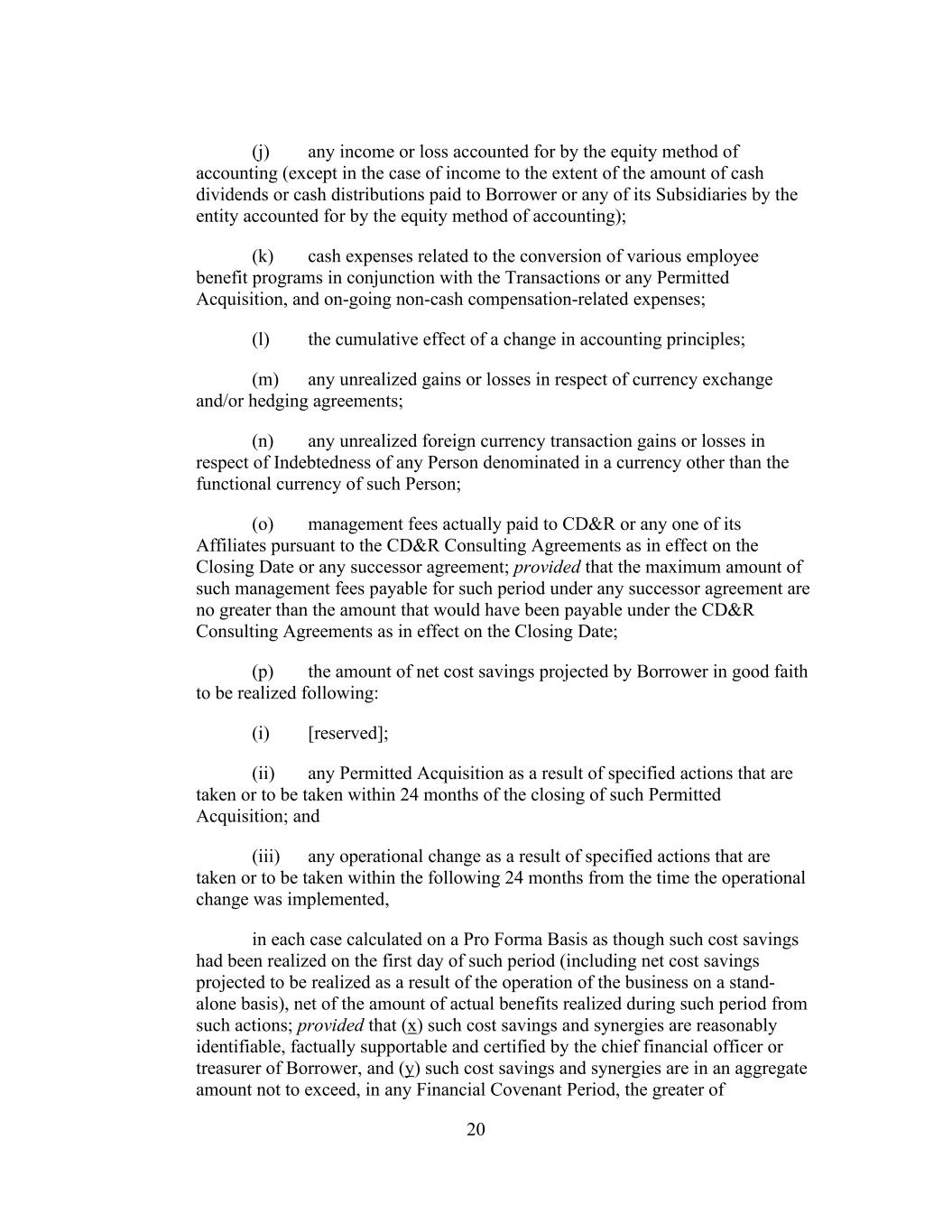 20 (j) any income or loss accounted for by the equity method of accounting (except in the case of income to the extent of the amount of cash dividends or cash distributions paid to Borrower or any of its Subsidiaries by the entity accounted for by the equity method of accounting); (k) cash expenses related to the conversion of various employee benefit programs in conjunction with the Transactions or any Permitted Acquisition, and on-going non-cash compensation-related expenses; (l) the cumulative effect of a change in accounting principles; (m) any unrealized gains or losses in respect of currency exchange and/or hedging agreements; (n) any unrealized foreign currency transaction gains or losses in respect of Indebtedness of any Person denominated in a currency other than the functional currency of such Person; (o) management fees actually paid to CD&R or any one of its Affiliates pursuant to the CD&R Consulting Agreements as in effect on the Closing Date or any successor agreement; provided that the maximum amount of such management fees payable for such period under any successor agreement are no greater than the amount that would have been payable under the CD&R Consulting Agreements as in effect on the Closing Date; (p) the amount of net cost savings projected by Borrower in good faith to be realized following: (i) [reserved]; (ii) any Permitted Acquisition as a result of specified actions that are taken or to be taken within 24 months of the closing of such Permitted Acquisition; and (iii) any operational change as a result of specified actions that are taken or to be taken within the following 24 months from the time the operational change was implemented, in each case calculated on a Pro Forma Basis as though such cost savings had been realized on the first day of such period (including net cost savings projected to be realized as a result of the operation of the business on a stand- alone basis), net of the amount of actual benefits realized during such period from such actions; provided that (x) such cost savings and synergies are reasonably identifiable, factually supportable and certified by the chief financial officer or treasurer of Borrower, and (y) such cost savings and synergies are in an aggregate amount not to exceed, in any Financial Covenant Period, the greater of