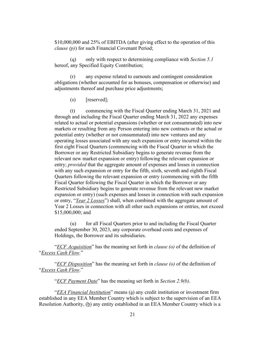 21 $10,000,000 and 25% of EBITDA (after giving effect to the operation of this clause (p)) for such Financial Covenant Period; (q) only with respect to determining compliance with Section 5.1 hereof, any Specified Equity Contribution; (r) any expense related to earnouts and contingent consideration obligations (whether accounted for as bonuses, compensation or otherwise) and adjustments thereof and purchase price adjustments; (s) [reserved]; (t) commencing with the Fiscal Quarter ending March 31, 2021 and through and including the Fiscal Quarter ending March 31, 2022 any expenses related to actual or potential expansions (whether or not consummated) into new markets or resulting from any Person entering into new contracts or the actual or potential entry (whether or not consummated) into new ventures and any operating losses associated with any such expansion or entry incurred within the first eight Fiscal Quarters (commencing with the Fiscal Quarter in which the Borrower or any Restricted Subsidiary begins to generate revenue from the relevant new market expansion or entry) following the relevant expansion or entry; provided that the aggregate amount of expenses and losses in connection with any such expansion or entry for the fifth, sixth, seventh and eighth Fiscal Quarters following the relevant expansion or entry (commencing with the fifth Fiscal Quarter following the Fiscal Quarter in which the Borrower or any Restricted Subsidiary begins to generate revenue from the relevant new market expansion or entry) (such expenses and losses in connection with such expansion or entry, “Year 2 Losses”) shall, when combined with the aggregate amount of Year 2 Losses in connection with all other such expansions or entries, not exceed $15,000,000; and (u) for all Fiscal Quarters prior to and including the Fiscal Quarter ended September 30, 2023, any corporate overhead costs and expenses of Holdings, the Borrower and its subsidiaries. “ECF Acquisition” has the meaning set forth in clause (o) of the definition of “Excess Cash Flow.” “ECF Disposition” has the meaning set forth in clause (o) of the definition of “Excess Cash Flow.” “ECF Payment Date” has the meaning set forth in Section 2.9(b). “EEA Financial Institution” means (a) any credit institution or investment firm established in any EEA Member Country which is subject to the supervision of an EEA Resolution Authority, (b) any entity established in an EEA Member Country which is a