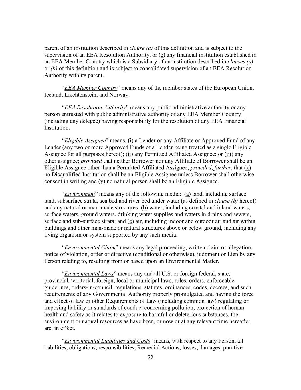 22 parent of an institution described in clause (a) of this definition and is subject to the supervision of an EEA Resolution Authority, or (c) any financial institution established in an EEA Member Country which is a Subsidiary of an institution described in clauses (a) or (b) of this definition and is subject to consolidated supervision of an EEA Resolution Authority with its parent. “EEA Member Country” means any of the member states of the European Union, Iceland, Liechtenstein, and Norway. “EEA Resolution Authority” means any public administrative authority or any person entrusted with public administrative authority of any EEA Member Country (including any delegee) having responsibility for the resolution of any EEA Financial Institution. “Eligible Assignee” means, (i) a Lender or any Affiliate or Approved Fund of any Lender (any two or more Approved Funds of a Lender being treated as a single Eligible Assignee for all purposes hereof); (ii) any Permitted Affiliated Assignee; or (iii) any other assignee; provided that neither Borrower nor any Affiliate of Borrower shall be an Eligible Assignee other than a Permitted Affiliated Assignee; provided, further, that (x) no Disqualified Institution shall be an Eligible Assignee unless Borrower shall otherwise consent in writing and (y) no natural person shall be an Eligible Assignee. “Environment” means any of the following media: (a) land, including surface land, subsurface strata, sea bed and river bed under water (as defined in clause (b) hereof) and any natural or man-made structures; (b) water, including coastal and inland waters, surface waters, ground waters, drinking water supplies and waters in drains and sewers, surface and sub-surface strata; and (c) air, including indoor and outdoor air and air within buildings and other man-made or natural structures above or below ground, including any living organism or system supported by any such media. “Environmental Claim” means any legal proceeding, written claim or allegation, notice of violation, order or directive (conditional or otherwise), judgment or Lien by any Person relating to, resulting from or based upon an Environmental Matter. “Environmental Laws” means any and all U.S. or foreign federal, state, provincial, territorial, foreign, local or municipal laws, rules, orders, enforceable guidelines, orders-in-council, regulations, statutes, ordinances, codes, decrees, and such requirements of any Governmental Authority properly promulgated and having the force and effect of law or other Requirements of Law (including common law) regulating or imposing liability or standards of conduct concerning pollution, protection of human health and safety as it relates to exposure to harmful or deleterious substances, the environment or natural resources as have been, or now or at any relevant time hereafter are, in effect. “Environmental Liabilities and Costs” means, with respect to any Person, all liabilities, obligations, responsibilities, Remedial Actions, losses, damages, punitive