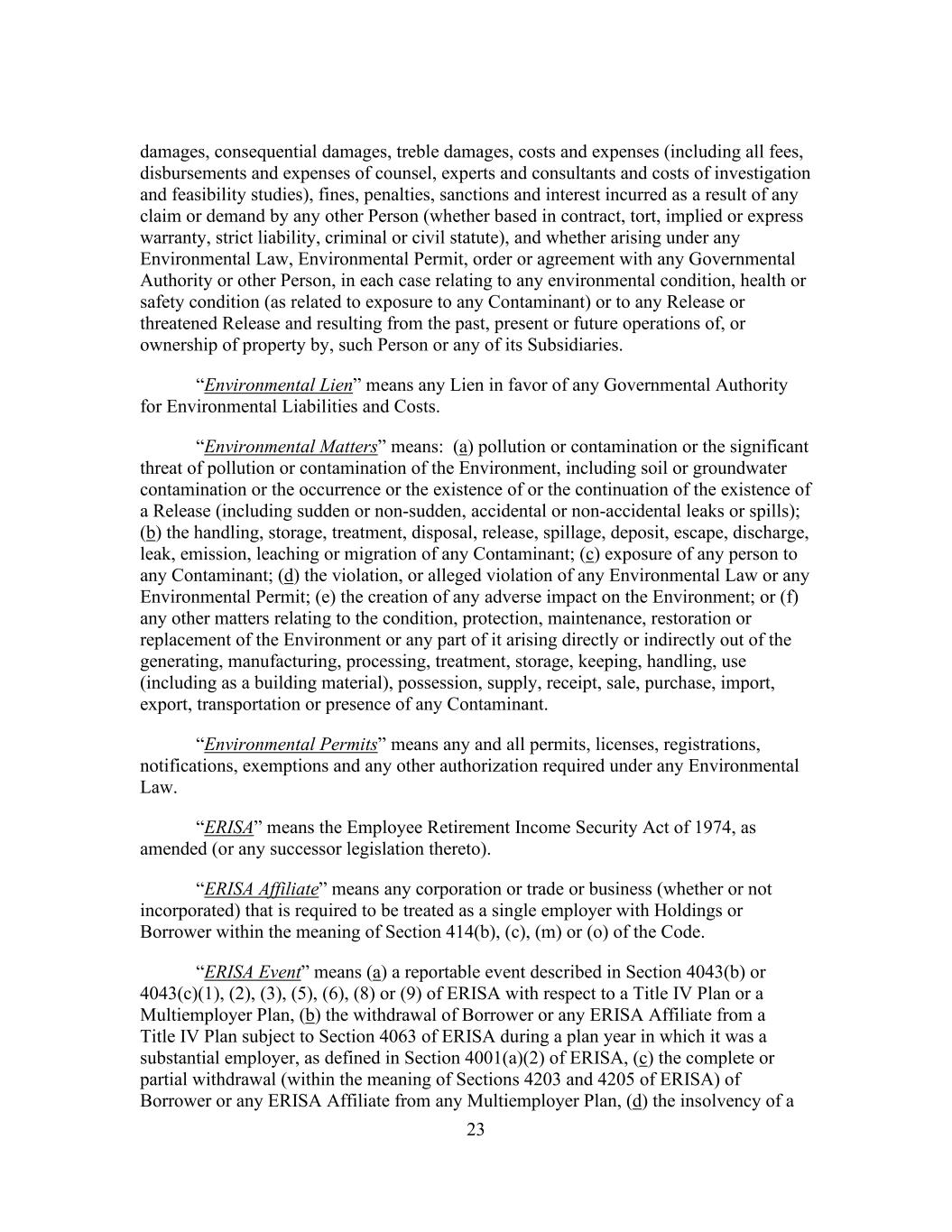 23 damages, consequential damages, treble damages, costs and expenses (including all fees, disbursements and expenses of counsel, experts and consultants and costs of investigation and feasibility studies), fines, penalties, sanctions and interest incurred as a result of any claim or demand by any other Person (whether based in contract, tort, implied or express warranty, strict liability, criminal or civil statute), and whether arising under any Environmental Law, Environmental Permit, order or agreement with any Governmental Authority or other Person, in each case relating to any environmental condition, health or safety condition (as related to exposure to any Contaminant) or to any Release or threatened Release and resulting from the past, present or future operations of, or ownership of property by, such Person or any of its Subsidiaries. “Environmental Lien” means any Lien in favor of any Governmental Authority for Environmental Liabilities and Costs. “Environmental Matters” means: (a) pollution or contamination or the significant threat of pollution or contamination of the Environment, including soil or groundwater contamination or the occurrence or the existence of or the continuation of the existence of a Release (including sudden or non-sudden, accidental or non-accidental leaks or spills); (b) the handling, storage, treatment, disposal, release, spillage, deposit, escape, discharge, leak, emission, leaching or migration of any Contaminant; (c) exposure of any person to any Contaminant; (d) the violation, or alleged violation of any Environmental Law or any Environmental Permit; (e) the creation of any adverse impact on the Environment; or (f) any other matters relating to the condition, protection, maintenance, restoration or replacement of the Environment or any part of it arising directly or indirectly out of the generating, manufacturing, processing, treatment, storage, keeping, handling, use (including as a building material), possession, supply, receipt, sale, purchase, import, export, transportation or presence of any Contaminant. “Environmental Permits” means any and all permits, licenses, registrations, notifications, exemptions and any other authorization required under any Environmental Law. “ERISA” means the Employee Retirement Income Security Act of 1974, as amended (or any successor legislation thereto). “ERISA Affiliate” means any corporation or trade or business (whether or not incorporated) that is required to be treated as a single employer with Holdings or Borrower within the meaning of Section 414(b), (c), (m) or (o) of the Code. “ERISA Event” means (a) a reportable event described in Section 4043(b) or 4043(c)(1), (2), (3), (5), (6), (8) or (9) of ERISA with respect to a Title IV Plan or a Multiemployer Plan, (b) the withdrawal of Borrower or any ERISA Affiliate from a Title IV Plan subject to Section 4063 of ERISA during a plan year in which it was a substantial employer, as defined in Section 4001(a)(2) of ERISA, (c) the complete or partial withdrawal (within the meaning of Sections 4203 and 4205 of ERISA) of Borrower or any ERISA Affiliate from any Multiemployer Plan, (d) the insolvency of a