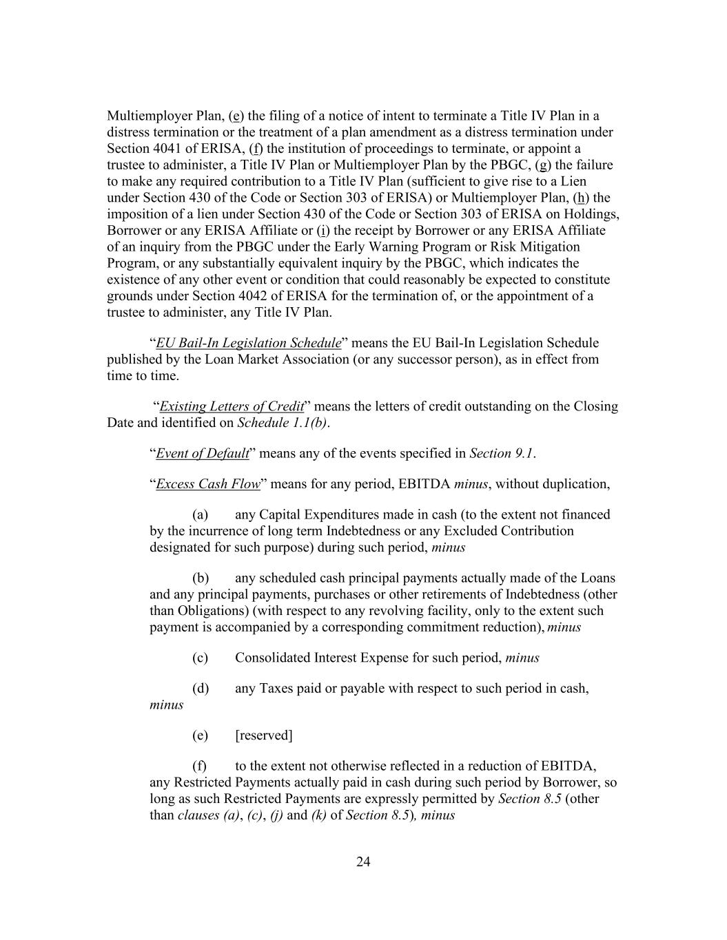 24 Multiemployer Plan, (e) the filing of a notice of intent to terminate a Title IV Plan in a distress termination or the treatment of a plan amendment as a distress termination under Section 4041 of ERISA, (f) the institution of proceedings to terminate, or appoint a trustee to administer, a Title IV Plan or Multiemployer Plan by the PBGC, (g) the failure to make any required contribution to a Title IV Plan (sufficient to give rise to a Lien under Section 430 of the Code or Section 303 of ERISA) or Multiemployer Plan, (h) the imposition of a lien under Section 430 of the Code or Section 303 of ERISA on Holdings, Borrower or any ERISA Affiliate or (i) the receipt by Borrower or any ERISA Affiliate of an inquiry from the PBGC under the Early Warning Program or Risk Mitigation Program, or any substantially equivalent inquiry by the PBGC, which indicates the existence of any other event or condition that could reasonably be expected to constitute grounds under Section 4042 of ERISA for the termination of, or the appointment of a trustee to administer, any Title IV Plan. “EU Bail-In Legislation Schedule” means the EU Bail-In Legislation Schedule published by the Loan Market Association (or any successor person), as in effect from time to time. “Existing Letters of Credit” means the letters of credit outstanding on the Closing Date and identified on Schedule 1.1(b). “Event of Default” means any of the events specified in Section 9.1. “Excess Cash Flow” means for any period, EBITDA minus, without duplication, (a) any Capital Expenditures made in cash (to the extent not financed by the incurrence of long term Indebtedness or any Excluded Contribution designated for such purpose) during such period, minus (b) any scheduled cash principal payments actually made of the Loans and any principal payments, purchases or other retirements of Indebtedness (other than Obligations) (with respect to any revolving facility, only to the extent such payment is accompanied by a corresponding commitment reduction), minus (c) Consolidated Interest Expense for such period, minus (d) any Taxes paid or payable with respect to such period in cash, minus (e) [reserved] (f) to the extent not otherwise reflected in a reduction of EBITDA, any Restricted Payments actually paid in cash during such period by Borrower, so long as such Restricted Payments are expressly permitted by Section 8.5 (other than clauses (a), (c), (j) and (k) of Section 8.5), minus