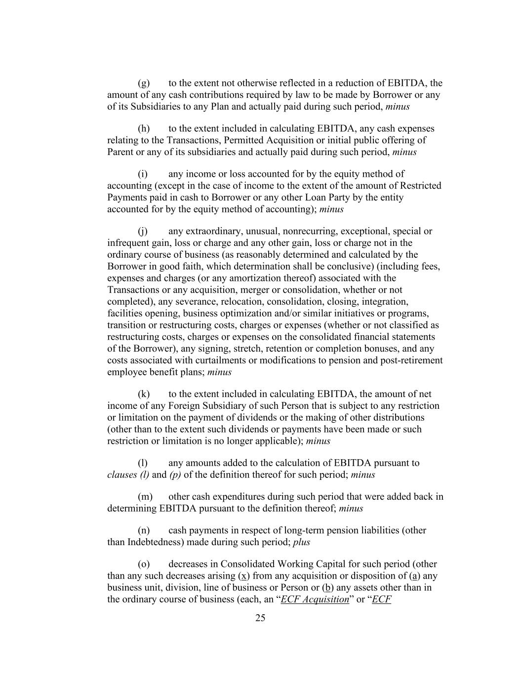 25 (g) to the extent not otherwise reflected in a reduction of EBITDA, the amount of any cash contributions required by law to be made by Borrower or any of its Subsidiaries to any Plan and actually paid during such period, minus (h) to the extent included in calculating EBITDA, any cash expenses relating to the Transactions, Permitted Acquisition or initial public offering of Parent or any of its subsidiaries and actually paid during such period, minus (i) any income or loss accounted for by the equity method of accounting (except in the case of income to the extent of the amount of Restricted Payments paid in cash to Borrower or any other Loan Party by the entity accounted for by the equity method of accounting); minus (j) any extraordinary, unusual, nonrecurring, exceptional, special or infrequent gain, loss or charge and any other gain, loss or charge not in the ordinary course of business (as reasonably determined and calculated by the Borrower in good faith, which determination shall be conclusive) (including fees, expenses and charges (or any amortization thereof) associated with the Transactions or any acquisition, merger or consolidation, whether or not completed), any severance, relocation, consolidation, closing, integration, facilities opening, business optimization and/or similar initiatives or programs, transition or restructuring costs, charges or expenses (whether or not classified as restructuring costs, charges or expenses on the consolidated financial statements of the Borrower), any signing, stretch, retention or completion bonuses, and any costs associated with curtailments or modifications to pension and post-retirement employee benefit plans; minus (k) to the extent included in calculating EBITDA, the amount of net income of any Foreign Subsidiary of such Person that is subject to any restriction or limitation on the payment of dividends or the making of other distributions (other than to the extent such dividends or payments have been made or such restriction or limitation is no longer applicable); minus (l) any amounts added to the calculation of EBITDA pursuant to clauses (l) and (p) of the definition thereof for such period; minus (m) other cash expenditures during such period that were added back in determining EBITDA pursuant to the definition thereof; minus (n) cash payments in respect of long-term pension liabilities (other than Indebtedness) made during such period; plus (o) decreases in Consolidated Working Capital for such period (other than any such decreases arising (x) from any acquisition or disposition of (a) any business unit, division, line of business or Person or (b) any assets other than in the ordinary course of business (each, an “ECF Acquisition” or “ECF