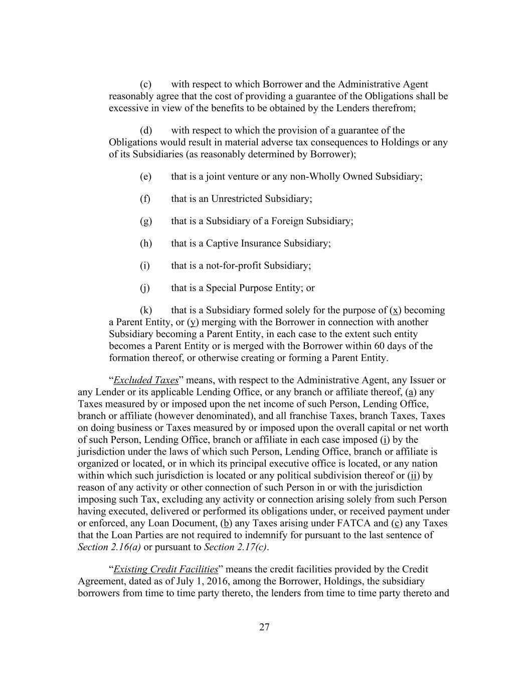 27 (c) with respect to which Borrower and the Administrative Agent reasonably agree that the cost of providing a guarantee of the Obligations shall be excessive in view of the benefits to be obtained by the Lenders therefrom; (d) with respect to which the provision of a guarantee of the Obligations would result in material adverse tax consequences to Holdings or any of its Subsidiaries (as reasonably determined by Borrower); (e) that is a joint venture or any non-Wholly Owned Subsidiary; (f) that is an Unrestricted Subsidiary; (g) that is a Subsidiary of a Foreign Subsidiary; (h) that is a Captive Insurance Subsidiary; (i) that is a not-for-profit Subsidiary; (j) that is a Special Purpose Entity; or (k) that is a Subsidiary formed solely for the purpose of (x) becoming a Parent Entity, or (y) merging with the Borrower in connection with another Subsidiary becoming a Parent Entity, in each case to the extent such entity becomes a Parent Entity or is merged with the Borrower within 60 days of the formation thereof, or otherwise creating or forming a Parent Entity. “Excluded Taxes” means, with respect to the Administrative Agent, any Issuer or any Lender or its applicable Lending Office, or any branch or affiliate thereof, (a) any Taxes measured by or imposed upon the net income of such Person, Lending Office, branch or affiliate (however denominated), and all franchise Taxes, branch Taxes, Taxes on doing business or Taxes measured by or imposed upon the overall capital or net worth of such Person, Lending Office, branch or affiliate in each case imposed (i) by the jurisdiction under the laws of which such Person, Lending Office, branch or affiliate is organized or located, or in which its principal executive office is located, or any nation within which such jurisdiction is located or any political subdivision thereof or (ii) by reason of any activity or other connection of such Person in or with the jurisdiction imposing such Tax, excluding any activity or connection arising solely from such Person having executed, delivered or performed its obligations under, or received payment under or enforced, any Loan Document, (b) any Taxes arising under FATCA and (c) any Taxes that the Loan Parties are not required to indemnify for pursuant to the last sentence of Section 2.16(a) or pursuant to Section 2.17(c). “Existing Credit Facilities” means the credit facilities provided by the Credit Agreement, dated as of July 1, 2016, among the Borrower, Holdings, the subsidiary borrowers from time to time party thereto, the lenders from time to time party thereto and