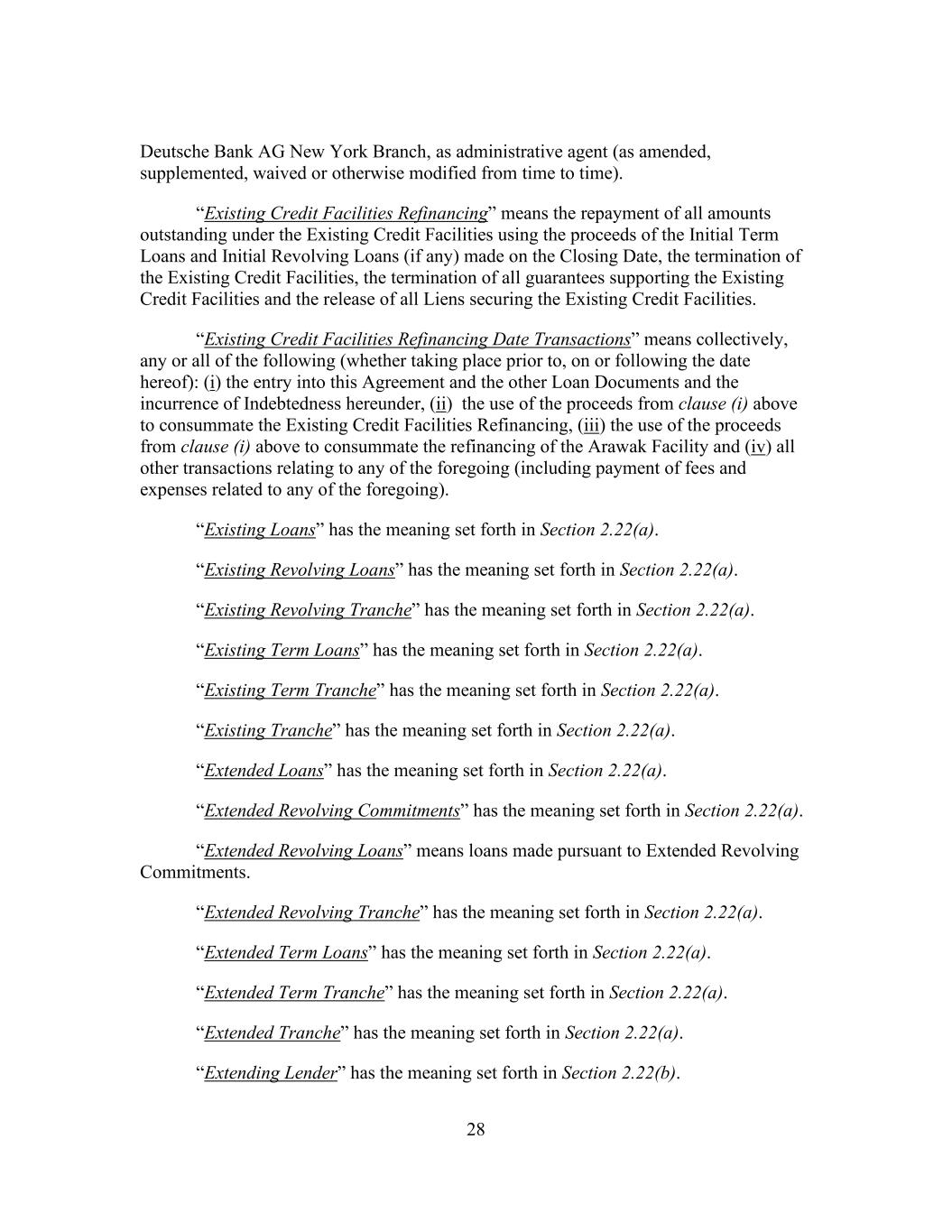 28 Deutsche Bank AG New York Branch, as administrative agent (as amended, supplemented, waived or otherwise modified from time to time). “Existing Credit Facilities Refinancing” means the repayment of all amounts outstanding under the Existing Credit Facilities using the proceeds of the Initial Term Loans and Initial Revolving Loans (if any) made on the Closing Date, the termination of the Existing Credit Facilities, the termination of all guarantees supporting the Existing Credit Facilities and the release of all Liens securing the Existing Credit Facilities. “Existing Credit Facilities Refinancing Date Transactions” means collectively, any or all of the following (whether taking place prior to, on or following the date hereof): (i) the entry into this Agreement and the other Loan Documents and the incurrence of Indebtedness hereunder, (ii) the use of the proceeds from clause (i) above to consummate the Existing Credit Facilities Refinancing, (iii) the use of the proceeds from clause (i) above to consummate the refinancing of the Arawak Facility and (iv) all other transactions relating to any of the foregoing (including payment of fees and expenses related to any of the foregoing). “Existing Loans” has the meaning set forth in Section 2.22(a). “Existing Revolving Loans” has the meaning set forth in Section 2.22(a). “Existing Revolving Tranche” has the meaning set forth in Section 2.22(a). “Existing Term Loans” has the meaning set forth in Section 2.22(a). “Existing Term Tranche” has the meaning set forth in Section 2.22(a). “Existing Tranche” has the meaning set forth in Section 2.22(a). “Extended Loans” has the meaning set forth in Section 2.22(a). “Extended Revolving Commitments” has the meaning set forth in Section 2.22(a). “Extended Revolving Loans” means loans made pursuant to Extended Revolving Commitments. “Extended Revolving Tranche” has the meaning set forth in Section 2.22(a). “Extended Term Loans” has the meaning set forth in Section 2.22(a). “Extended Term Tranche” has the meaning set forth in Section 2.22(a). “Extended Tranche” has the meaning set forth in Section 2.22(a). “Extending Lender” has the meaning set forth in Section 2.22(b).