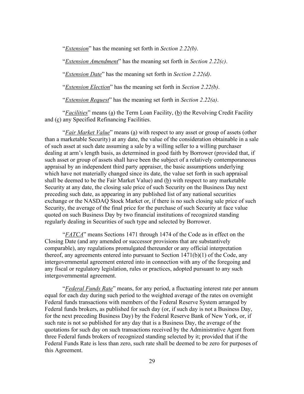 29 “Extension” has the meaning set forth in Section 2.22(b). “Extension Amendment” has the meaning set forth in Section 2.22(c). “Extension Date” has the meaning set forth in Section 2.22(d). “Extension Election” has the meaning set forth in Section 2.22(b). “Extension Request” has the meaning set forth in Section 2.22(a). “Facilities” means (a) the Term Loan Facility, (b) the Revolving Credit Facility and (c) any Specified Refinancing Facilities. “Fair Market Value” means (a) with respect to any asset or group of assets (other than a marketable Security) at any date, the value of the consideration obtainable in a sale of such asset at such date assuming a sale by a willing seller to a willing purchaser dealing at arm’s length basis, as determined in good faith by Borrower (provided that, if such asset or group of assets shall have been the subject of a relatively contemporaneous appraisal by an independent third party appraiser, the basic assumptions underlying which have not materially changed since its date, the value set forth in such appraisal shall be deemed to be the Fair Market Value) and (b) with respect to any marketable Security at any date, the closing sale price of such Security on the Business Day next preceding such date, as appearing in any published list of any national securities exchange or the NASDAQ Stock Market or, if there is no such closing sale price of such Security, the average of the final price for the purchase of such Security at face value quoted on such Business Day by two financial institutions of recognized standing regularly dealing in Securities of such type and selected by Borrower. “FATCA” means Sections 1471 through 1474 of the Code as in effect on the Closing Date (and any amended or successor provisions that are substantively comparable), any regulations promulgated thereunder or any official interpretation thereof, any agreements entered into pursuant to Section 1471(b)(1) of the Code, any intergovernmental agreement entered into in connection with any of the foregoing and any fiscal or regulatory legislation, rules or practices, adopted pursuant to any such intergovernmental agreement. “Federal Funds Rate” means, for any period, a fluctuating interest rate per annum equal for each day during such period to the weighted average of the rates on overnight Federal funds transactions with members of the Federal Reserve System arranged by Federal funds brokers, as published for such day (or, if such day is not a Business Day, for the next preceding Business Day) by the Federal Reserve Bank of New York, or, if such rate is not so published for any day that is a Business Day, the average of the quotations for such day on such transactions received by the Administrative Agent from three Federal funds brokers of recognized standing selected by it; provided that if the Federal Funds Rate is less than zero, such rate shall be deemed to be zero for purposes of this Agreement.