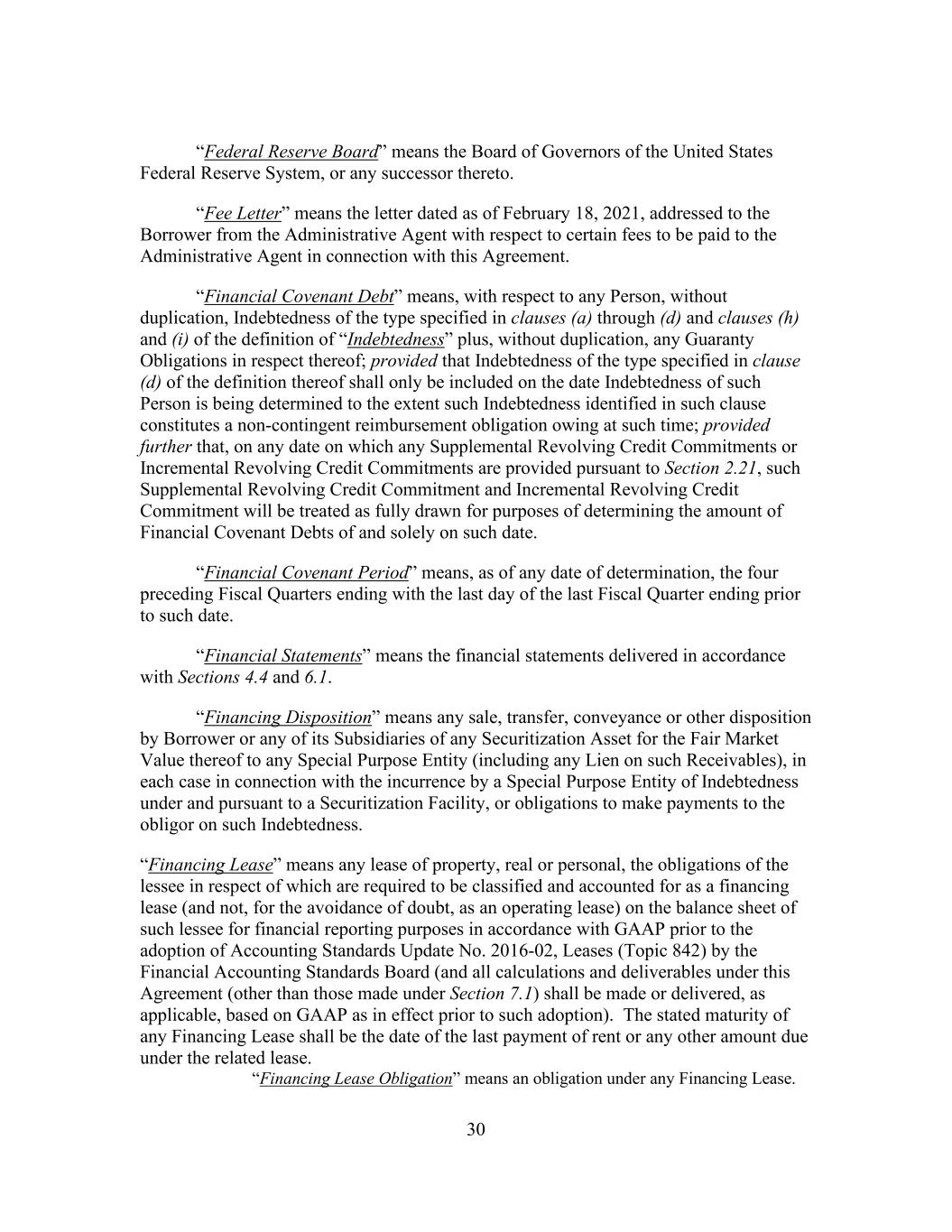 30 “Federal Reserve Board” means the Board of Governors of the United States Federal Reserve System, or any successor thereto. “Fee Letter” means the letter dated as of February 18, 2021, addressed to the Borrower from the Administrative Agent with respect to certain fees to be paid to the Administrative Agent in connection with this Agreement. “Financial Covenant Debt” means, with respect to any Person, without duplication, Indebtedness of the type specified in clauses (a) through (d) and clauses (h) and (i) of the definition of “Indebtedness” plus, without duplication, any Guaranty Obligations in respect thereof; provided that Indebtedness of the type specified in clause (d) of the definition thereof shall only be included on the date Indebtedness of such Person is being determined to the extent such Indebtedness identified in such clause constitutes a non-contingent reimbursement obligation owing at such time; provided further that, on any date on which any Supplemental Revolving Credit Commitments or Incremental Revolving Credit Commitments are provided pursuant to Section 2.21, such Supplemental Revolving Credit Commitment and Incremental Revolving Credit Commitment will be treated as fully drawn for purposes of determining the amount of Financial Covenant Debts of and solely on such date. “Financial Covenant Period” means, as of any date of determination, the four preceding Fiscal Quarters ending with the last day of the last Fiscal Quarter ending prior to such date. “Financial Statements” means the financial statements delivered in accordance with Sections 4.4 and 6.1. “Financing Disposition” means any sale, transfer, conveyance or other disposition by Borrower or any of its Subsidiaries of any Securitization Asset for the Fair Market Value thereof to any Special Purpose Entity (including any Lien on such Receivables), in each case in connection with the incurrence by a Special Purpose Entity of Indebtedness under and pursuant to a Securitization Facility, or obligations to make payments to the obligor on such Indebtedness. “Financing Lease” means any lease of property, real or personal, the obligations of the lessee in respect of which are required to be classified and accounted for as a financing lease (and not, for the avoidance of doubt, as an operating lease) on the balance sheet of such lessee for financial reporting purposes in accordance with GAAP prior to the adoption of Accounting Standards Update No. 2016-02, Leases (Topic 842) by the Financial Accounting Standards Board (and all calculations and deliverables under this Agreement (other than those made under Section 7.1) shall be made or delivered, as applicable, based on GAAP as in effect prior to such adoption). The stated maturity of any Financing Lease shall be the date of the last payment of rent or any other amount due under the related lease. “Financing Lease Obligation” means an obligation under any Financing Lease.