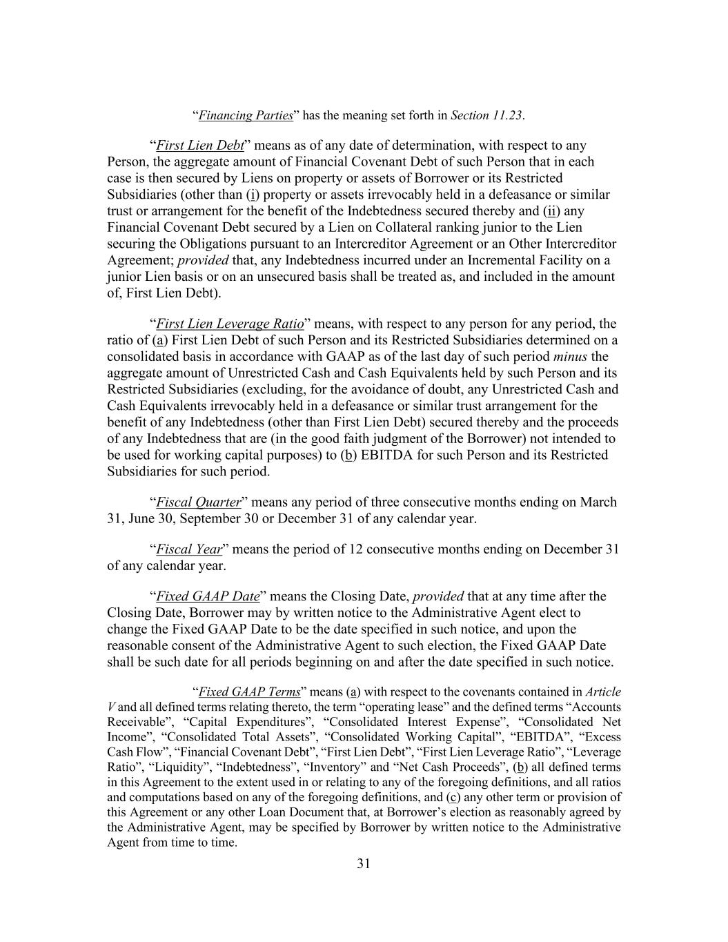 31 “Financing Parties” has the meaning set forth in Section 11.23. “First Lien Debt” means as of any date of determination, with respect to any Person, the aggregate amount of Financial Covenant Debt of such Person that in each case is then secured by Liens on property or assets of Borrower or its Restricted Subsidiaries (other than (i) property or assets irrevocably held in a defeasance or similar trust or arrangement for the benefit of the Indebtedness secured thereby and (ii) any Financial Covenant Debt secured by a Lien on Collateral ranking junior to the Lien securing the Obligations pursuant to an Intercreditor Agreement or an Other Intercreditor Agreement; provided that, any Indebtedness incurred under an Incremental Facility on a junior Lien basis or on an unsecured basis shall be treated as, and included in the amount of, First Lien Debt). “First Lien Leverage Ratio” means, with respect to any person for any period, the ratio of (a) First Lien Debt of such Person and its Restricted Subsidiaries determined on a consolidated basis in accordance with GAAP as of the last day of such period minus the aggregate amount of Unrestricted Cash and Cash Equivalents held by such Person and its Restricted Subsidiaries (excluding, for the avoidance of doubt, any Unrestricted Cash and Cash Equivalents irrevocably held in a defeasance or similar trust arrangement for the benefit of any Indebtedness (other than First Lien Debt) secured thereby and the proceeds of any Indebtedness that are (in the good faith judgment of the Borrower) not intended to be used for working capital purposes) to (b) EBITDA for such Person and its Restricted Subsidiaries for such period. “Fiscal Quarter” means any period of three consecutive months ending on March 31, June 30, September 30 or December 31 of any calendar year. “Fiscal Year” means the period of 12 consecutive months ending on December 31 of any calendar year. “Fixed GAAP Date” means the Closing Date, provided that at any time after the Closing Date, Borrower may by written notice to the Administrative Agent elect to change the Fixed GAAP Date to be the date specified in such notice, and upon the reasonable consent of the Administrative Agent to such election, the Fixed GAAP Date shall be such date for all periods beginning on and after the date specified in such notice. “Fixed GAAP Terms” means (a) with respect to the covenants contained in Article V and all defined terms relating thereto, the term “operating lease” and the defined terms “Accounts Receivable”, “Capital Expenditures”, “Consolidated Interest Expense”, “Consolidated Net Income”, “Consolidated Total Assets”, “Consolidated Working Capital”, “EBITDA”, “Excess Cash Flow”, “Financial Covenant Debt”, “First Lien Debt”, “First Lien Leverage Ratio”, “Leverage Ratio”, “Liquidity”, “Indebtedness”, “Inventory” and “Net Cash Proceeds”, (b) all defined terms in this Agreement to the extent used in or relating to any of the foregoing definitions, and all ratios and computations based on any of the foregoing definitions, and (c) any other term or provision of this Agreement or any other Loan Document that, at Borrower’s election as reasonably agreed by the Administrative Agent, may be specified by Borrower by written notice to the Administrative Agent from time to time.
