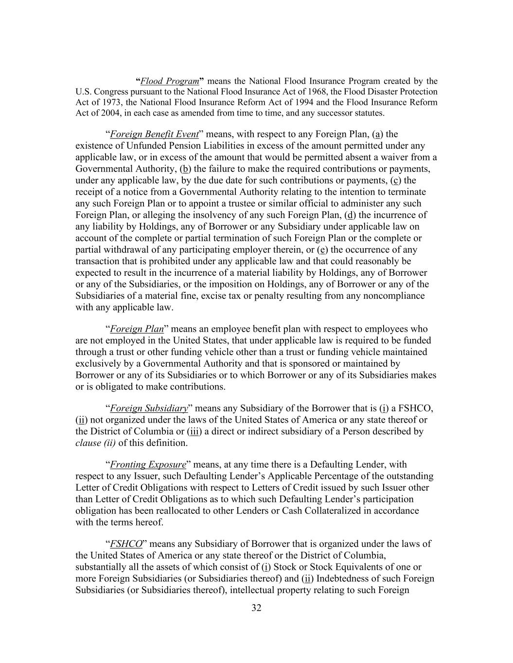 32 “Flood Program” means the National Flood Insurance Program created by the U.S. Congress pursuant to the National Flood Insurance Act of 1968, the Flood Disaster Protection Act of 1973, the National Flood Insurance Reform Act of 1994 and the Flood Insurance Reform Act of 2004, in each case as amended from time to time, and any successor statutes. “Foreign Benefit Event” means, with respect to any Foreign Plan, (a) the existence of Unfunded Pension Liabilities in excess of the amount permitted under any applicable law, or in excess of the amount that would be permitted absent a waiver from a Governmental Authority, (b) the failure to make the required contributions or payments, under any applicable law, by the due date for such contributions or payments, (c) the receipt of a notice from a Governmental Authority relating to the intention to terminate any such Foreign Plan or to appoint a trustee or similar official to administer any such Foreign Plan, or alleging the insolvency of any such Foreign Plan, (d) the incurrence of any liability by Holdings, any of Borrower or any Subsidiary under applicable law on account of the complete or partial termination of such Foreign Plan or the complete or partial withdrawal of any participating employer therein, or (e) the occurrence of any transaction that is prohibited under any applicable law and that could reasonably be expected to result in the incurrence of a material liability by Holdings, any of Borrower or any of the Subsidiaries, or the imposition on Holdings, any of Borrower or any of the Subsidiaries of a material fine, excise tax or penalty resulting from any noncompliance with any applicable law. “Foreign Plan” means an employee benefit plan with respect to employees who are not employed in the United States, that under applicable law is required to be funded through a trust or other funding vehicle other than a trust or funding vehicle maintained exclusively by a Governmental Authority and that is sponsored or maintained by Borrower or any of its Subsidiaries or to which Borrower or any of its Subsidiaries makes or is obligated to make contributions. “Foreign Subsidiary” means any Subsidiary of the Borrower that is (i) a FSHCO, (ii) not organized under the laws of the United States of America or any state thereof or the District of Columbia or (iii) a direct or indirect subsidiary of a Person described by clause (ii) of this definition. “Fronting Exposure” means, at any time there is a Defaulting Lender, with respect to any Issuer, such Defaulting Lender’s Applicable Percentage of the outstanding Letter of Credit Obligations with respect to Letters of Credit issued by such Issuer other than Letter of Credit Obligations as to which such Defaulting Lender’s participation obligation has been reallocated to other Lenders or Cash Collateralized in accordance with the terms hereof. “FSHCO” means any Subsidiary of Borrower that is organized under the laws of the United States of America or any state thereof or the District of Columbia, substantially all the assets of which consist of (i) Stock or Stock Equivalents of one or more Foreign Subsidiaries (or Subsidiaries thereof) and (ii) Indebtedness of such Foreign Subsidiaries (or Subsidiaries thereof), intellectual property relating to such Foreign