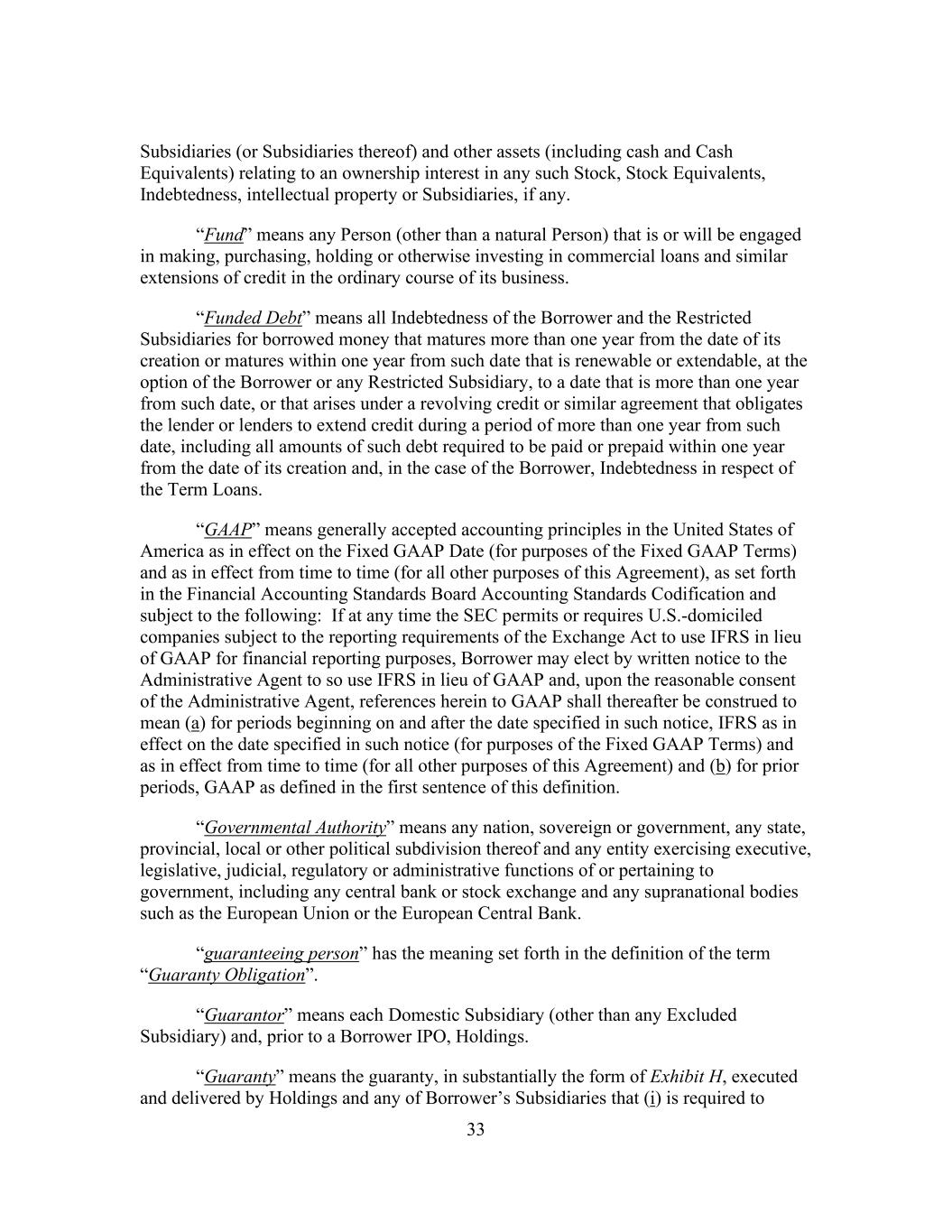 33 Subsidiaries (or Subsidiaries thereof) and other assets (including cash and Cash Equivalents) relating to an ownership interest in any such Stock, Stock Equivalents, Indebtedness, intellectual property or Subsidiaries, if any. “Fund” means any Person (other than a natural Person) that is or will be engaged in making, purchasing, holding or otherwise investing in commercial loans and similar extensions of credit in the ordinary course of its business. “Funded Debt” means all Indebtedness of the Borrower and the Restricted Subsidiaries for borrowed money that matures more than one year from the date of its creation or matures within one year from such date that is renewable or extendable, at the option of the Borrower or any Restricted Subsidiary, to a date that is more than one year from such date, or that arises under a revolving credit or similar agreement that obligates the lender or lenders to extend credit during a period of more than one year from such date, including all amounts of such debt required to be paid or prepaid within one year from the date of its creation and, in the case of the Borrower, Indebtedness in respect of the Term Loans. “GAAP” means generally accepted accounting principles in the United States of America as in effect on the Fixed GAAP Date (for purposes of the Fixed GAAP Terms) and as in effect from time to time (for all other purposes of this Agreement), as set forth in the Financial Accounting Standards Board Accounting Standards Codification and subject to the following: If at any time the SEC permits or requires U.S.-domiciled companies subject to the reporting requirements of the Exchange Act to use IFRS in lieu of GAAP for financial reporting purposes, Borrower may elect by written notice to the Administrative Agent to so use IFRS in lieu of GAAP and, upon the reasonable consent of the Administrative Agent, references herein to GAAP shall thereafter be construed to mean (a) for periods beginning on and after the date specified in such notice, IFRS as in effect on the date specified in such notice (for purposes of the Fixed GAAP Terms) and as in effect from time to time (for all other purposes of this Agreement) and (b) for prior periods, GAAP as defined in the first sentence of this definition. “Governmental Authority” means any nation, sovereign or government, any state, provincial, local or other political subdivision thereof and any entity exercising executive, legislative, judicial, regulatory or administrative functions of or pertaining to government, including any central bank or stock exchange and any supranational bodies such as the European Union or the European Central Bank. “guaranteeing person” has the meaning set forth in the definition of the term “Guaranty Obligation”. “Guarantor” means each Domestic Subsidiary (other than any Excluded Subsidiary) and, prior to a Borrower IPO, Holdings. “Guaranty” means the guaranty, in substantially the form of Exhibit H, executed and delivered by Holdings and any of Borrower’s Subsidiaries that (i) is required to