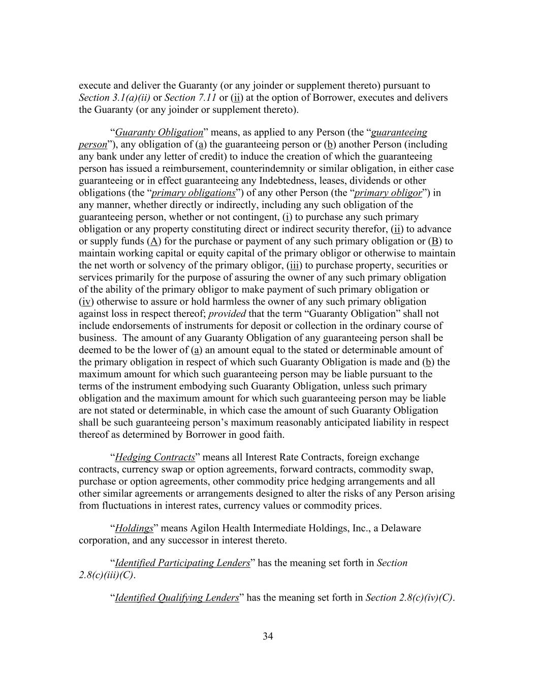 34 execute and deliver the Guaranty (or any joinder or supplement thereto) pursuant to Section 3.1(a)(ii) or Section 7.11 or (ii) at the option of Borrower, executes and delivers the Guaranty (or any joinder or supplement thereto). “Guaranty Obligation” means, as applied to any Person (the “guaranteeing person”), any obligation of (a) the guaranteeing person or (b) another Person (including any bank under any letter of credit) to induce the creation of which the guaranteeing person has issued a reimbursement, counterindemnity or similar obligation, in either case guaranteeing or in effect guaranteeing any Indebtedness, leases, dividends or other obligations (the “primary obligations”) of any other Person (the “primary obligor”) in any manner, whether directly or indirectly, including any such obligation of the guaranteeing person, whether or not contingent, (i) to purchase any such primary obligation or any property constituting direct or indirect security therefor, (ii) to advance or supply funds (A) for the purchase or payment of any such primary obligation or (B) to maintain working capital or equity capital of the primary obligor or otherwise to maintain the net worth or solvency of the primary obligor, (iii) to purchase property, securities or services primarily for the purpose of assuring the owner of any such primary obligation of the ability of the primary obligor to make payment of such primary obligation or (iv) otherwise to assure or hold harmless the owner of any such primary obligation against loss in respect thereof; provided that the term “Guaranty Obligation” shall not include endorsements of instruments for deposit or collection in the ordinary course of business. The amount of any Guaranty Obligation of any guaranteeing person shall be deemed to be the lower of (a) an amount equal to the stated or determinable amount of the primary obligation in respect of which such Guaranty Obligation is made and (b) the maximum amount for which such guaranteeing person may be liable pursuant to the terms of the instrument embodying such Guaranty Obligation, unless such primary obligation and the maximum amount for which such guaranteeing person may be liable are not stated or determinable, in which case the amount of such Guaranty Obligation shall be such guaranteeing person’s maximum reasonably anticipated liability in respect thereof as determined by Borrower in good faith. “Hedging Contracts” means all Interest Rate Contracts, foreign exchange contracts, currency swap or option agreements, forward contracts, commodity swap, purchase or option agreements, other commodity price hedging arrangements and all other similar agreements or arrangements designed to alter the risks of any Person arising from fluctuations in interest rates, currency values or commodity prices. “Holdings” means Agilon Health Intermediate Holdings, Inc., a Delaware corporation, and any successor in interest thereto. “Identified Participating Lenders” has the meaning set forth in Section 2.8(c)(iii)(C). “Identified Qualifying Lenders” has the meaning set forth in Section 2.8(c)(iv)(C).