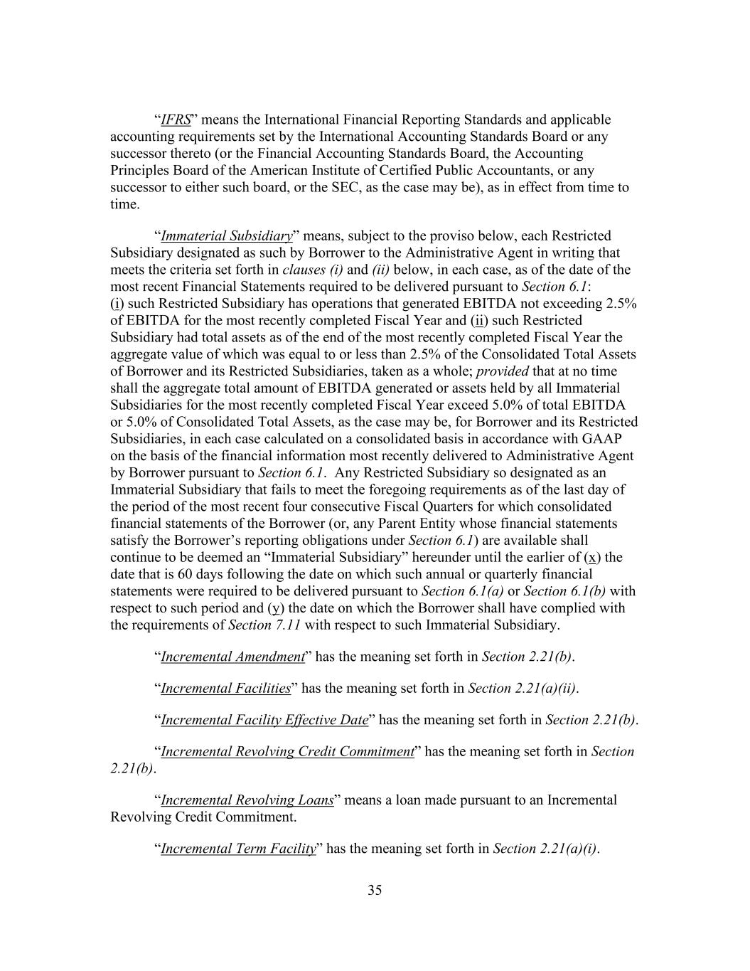 35 “IFRS” means the International Financial Reporting Standards and applicable accounting requirements set by the International Accounting Standards Board or any successor thereto (or the Financial Accounting Standards Board, the Accounting Principles Board of the American Institute of Certified Public Accountants, or any successor to either such board, or the SEC, as the case may be), as in effect from time to time. “Immaterial Subsidiary” means, subject to the proviso below, each Restricted Subsidiary designated as such by Borrower to the Administrative Agent in writing that meets the criteria set forth in clauses (i) and (ii) below, in each case, as of the date of the most recent Financial Statements required to be delivered pursuant to Section 6.1: (i) such Restricted Subsidiary has operations that generated EBITDA not exceeding 2.5% of EBITDA for the most recently completed Fiscal Year and (ii) such Restricted Subsidiary had total assets as of the end of the most recently completed Fiscal Year the aggregate value of which was equal to or less than 2.5% of the Consolidated Total Assets of Borrower and its Restricted Subsidiaries, taken as a whole; provided that at no time shall the aggregate total amount of EBITDA generated or assets held by all Immaterial Subsidiaries for the most recently completed Fiscal Year exceed 5.0% of total EBITDA or 5.0% of Consolidated Total Assets, as the case may be, for Borrower and its Restricted Subsidiaries, in each case calculated on a consolidated basis in accordance with GAAP on the basis of the financial information most recently delivered to Administrative Agent by Borrower pursuant to Section 6.1. Any Restricted Subsidiary so designated as an Immaterial Subsidiary that fails to meet the foregoing requirements as of the last day of the period of the most recent four consecutive Fiscal Quarters for which consolidated financial statements of the Borrower (or, any Parent Entity whose financial statements satisfy the Borrower’s reporting obligations under Section 6.1) are available shall continue to be deemed an “Immaterial Subsidiary” hereunder until the earlier of (x) the date that is 60 days following the date on which such annual or quarterly financial statements were required to be delivered pursuant to Section 6.1(a) or Section 6.1(b) with respect to such period and (y) the date on which the Borrower shall have complied with the requirements of Section 7.11 with respect to such Immaterial Subsidiary. “Incremental Amendment” has the meaning set forth in Section 2.21(b). “Incremental Facilities” has the meaning set forth in Section 2.21(a)(ii). “Incremental Facility Effective Date” has the meaning set forth in Section 2.21(b). “Incremental Revolving Credit Commitment” has the meaning set forth in Section 2.21(b). “Incremental Revolving Loans” means a loan made pursuant to an Incremental Revolving Credit Commitment. “Incremental Term Facility” has the meaning set forth in Section 2.21(a)(i).