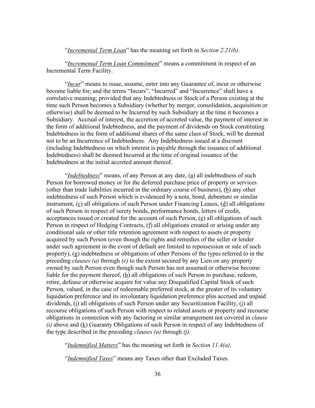 36 “Incremental Term Loan” has the meaning set forth in Section 2.21(b). “Incremental Term Loan Commitment” means a commitment in respect of an Incremental Term Facility. “Incur” means to issue, assume, enter into any Guarantee of, incur or otherwise become liable for; and the terms “Incurs”, “Incurred” and “Incurrence” shall have a correlative meaning; provided that any Indebtedness or Stock of a Person existing at the time such Person becomes a Subsidiary (whether by merger, consolidation, acquisition or otherwise) shall be deemed to be Incurred by such Subsidiary at the time it becomes a Subsidiary. Accrual of interest, the accretion of accreted value, the payment of interest in the form of additional Indebtedness, and the payment of dividends on Stock constituting Indebtedness in the form of additional shares of the same class of Stock, will be deemed not to be an Incurrence of Indebtedness. Any Indebtedness issued at a discount (including Indebtedness on which interest is payable through the issuance of additional Indebtedness) shall be deemed Incurred at the time of original issuance of the Indebtedness at the initial accreted amount thereof. “Indebtedness” means, of any Person at any date, (a) all indebtedness of such Person for borrowed money or for the deferred purchase price of property or services (other than trade liabilities incurred in the ordinary course of business), (b) any other indebtedness of such Person which is evidenced by a note, bond, debenture or similar instrument, (c) all obligations of such Person under Financing Leases, (d) all obligations of such Person in respect of surety bonds, performance bonds, letters of credit, acceptances issued or created for the account of such Person, (e) all obligations of such Person in respect of Hedging Contracts, (f) all obligations created or arising under any conditional sale or other title retention agreement with respect to assets or property acquired by such Person (even though the rights and remedies of the seller or lender under such agreement in the event of default are limited to repossession or sale of such property), (g) indebtedness or obligations of other Persons of the types referred to in the preceding clauses (a) through (e) to the extent secured by any Lien on any property owned by such Person even though such Person has not assumed or otherwise become liable for the payment thereof, (h) all obligations of such Person to purchase, redeem, retire, defease or otherwise acquire for value any Disqualified Capital Stock of such Person, valued, in the case of redeemable preferred stock, at the greater of its voluntary liquidation preference and its involuntary liquidation preference plus accrued and unpaid dividends, (i) all obligations of such Person under any Securitization Facility, (j) all recourse obligations of such Person with respect to related assets or property and recourse obligations in connection with any factoring or similar arrangement not covered in clause (i) above and (k) Guaranty Obligations of such Person in respect of any Indebtedness of the type described in the preceding clauses (a) through (j). “Indemnified Matters” has the meaning set forth in Section 11.4(a). “Indemnified Taxes” means any Taxes other than Excluded Taxes.