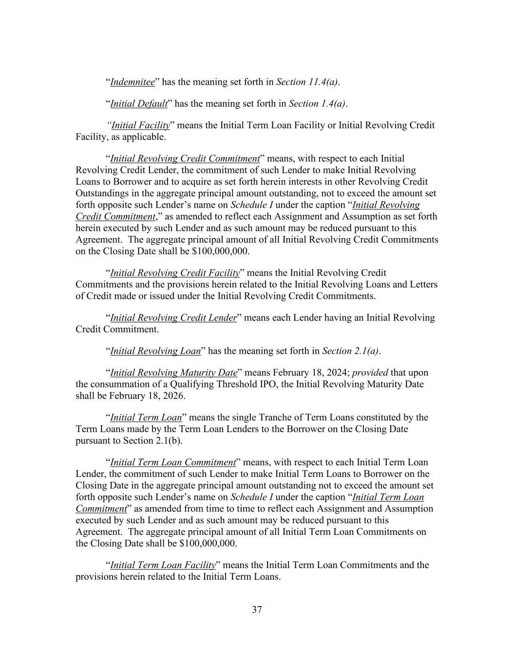 37 “Indemnitee” has the meaning set forth in Section 11.4(a). “Initial Default” has the meaning set forth in Section 1.4(a). “Initial Facility” means the Initial Term Loan Facility or Initial Revolving Credit Facility, as applicable. “Initial Revolving Credit Commitment” means, with respect to each Initial Revolving Credit Lender, the commitment of such Lender to make Initial Revolving Loans to Borrower and to acquire as set forth herein interests in other Revolving Credit Outstandings in the aggregate principal amount outstanding, not to exceed the amount set forth opposite such Lender’s name on Schedule I under the caption “Initial Revolving Credit Commitment,” as amended to reflect each Assignment and Assumption as set forth herein executed by such Lender and as such amount may be reduced pursuant to this Agreement. The aggregate principal amount of all Initial Revolving Credit Commitments on the Closing Date shall be $100,000,000. “Initial Revolving Credit Facility” means the Initial Revolving Credit Commitments and the provisions herein related to the Initial Revolving Loans and Letters of Credit made or issued under the Initial Revolving Credit Commitments. “Initial Revolving Credit Lender” means each Lender having an Initial Revolving Credit Commitment. “Initial Revolving Loan” has the meaning set forth in Section 2.1(a). “Initial Revolving Maturity Date” means February 18, 2024; provided that upon the consummation of a Qualifying Threshold IPO, the Initial Revolving Maturity Date shall be February 18, 2026. “Initial Term Loan” means the single Tranche of Term Loans constituted by the Term Loans made by the Term Loan Lenders to the Borrower on the Closing Date pursuant to Section 2.1(b). “Initial Term Loan Commitment” means, with respect to each Initial Term Loan Lender, the commitment of such Lender to make Initial Term Loans to Borrower on the Closing Date in the aggregate principal amount outstanding not to exceed the amount set forth opposite such Lender’s name on Schedule I under the caption “Initial Term Loan Commitment” as amended from time to time to reflect each Assignment and Assumption executed by such Lender and as such amount may be reduced pursuant to this Agreement. The aggregate principal amount of all Initial Term Loan Commitments on the Closing Date shall be $100,000,000. “Initial Term Loan Facility” means the Initial Term Loan Commitments and the provisions herein related to the Initial Term Loans.