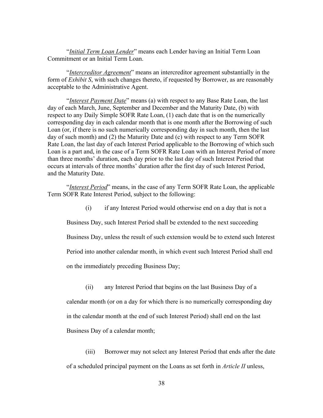 38 “Initial Term Loan Lender” means each Lender having an Initial Term Loan Commitment or an Initial Term Loan. “Intercreditor Agreement” means an intercreditor agreement substantially in the form of Exhibit S, with such changes thereto, if requested by Borrower, as are reasonably acceptable to the Administrative Agent. “Interest Payment Date” means (a) with respect to any Base Rate Loan, the last day of each March, June, September and December and the Maturity Date, (b) with respect to any Daily Simple SOFR Rate Loan, (1) each date that is on the numerically corresponding day in each calendar month that is one month after the Borrowing of such Loan (or, if there is no such numerically corresponding day in such month, then the last day of such month) and (2) the Maturity Date and (c) with respect to any Term SOFR Rate Loan, the last day of each Interest Period applicable to the Borrowing of which such Loan is a part and, in the case of a Term SOFR Rate Loan with an Interest Period of more than three months’ duration, each day prior to the last day of such Interest Period that occurs at intervals of three months’ duration after the first day of such Interest Period, and the Maturity Date. “Interest Period” means, in the case of any Term SOFR Rate Loan, the applicable Term SOFR Rate Interest Period, subject to the following: (i) if any Interest Period would otherwise end on a day that is not a Business Day, such Interest Period shall be extended to the next succeeding Business Day, unless the result of such extension would be to extend such Interest Period into another calendar month, in which event such Interest Period shall end on the immediately preceding Business Day; (ii) any Interest Period that begins on the last Business Day of a calendar month (or on a day for which there is no numerically corresponding day in the calendar month at the end of such Interest Period) shall end on the last Business Day of a calendar month; (iii) Borrower may not select any Interest Period that ends after the date of a scheduled principal payment on the Loans as set forth in Article II unless,
