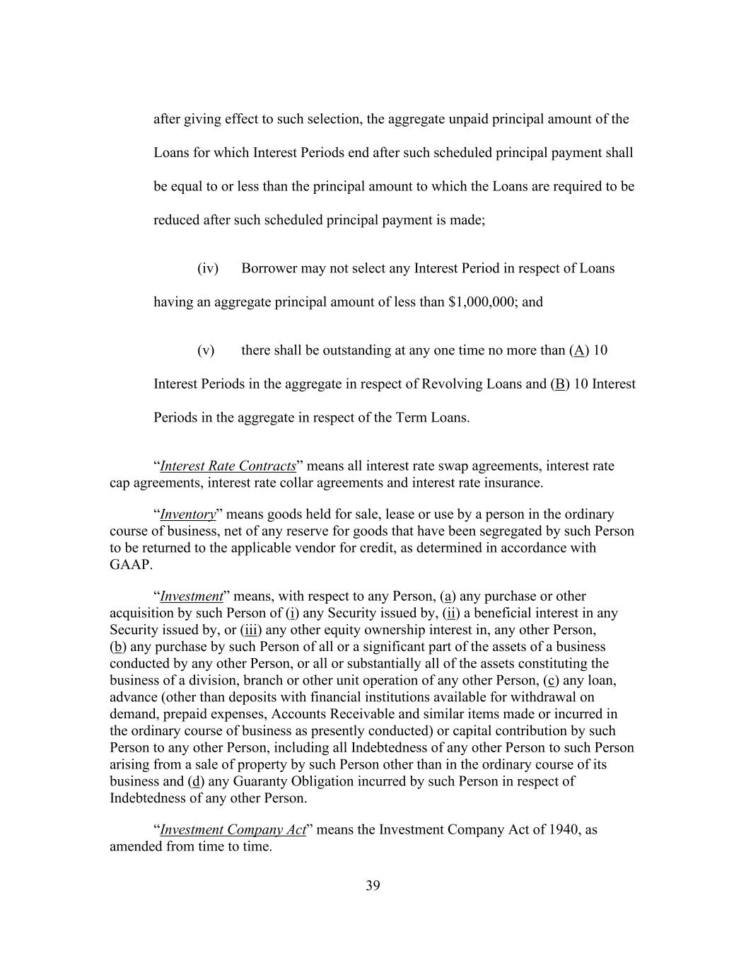 39 after giving effect to such selection, the aggregate unpaid principal amount of the Loans for which Interest Periods end after such scheduled principal payment shall be equal to or less than the principal amount to which the Loans are required to be reduced after such scheduled principal payment is made; (iv) Borrower may not select any Interest Period in respect of Loans having an aggregate principal amount of less than $1,000,000; and (v) there shall be outstanding at any one time no more than (A) 10 Interest Periods in the aggregate in respect of Revolving Loans and (B) 10 Interest Periods in the aggregate in respect of the Term Loans. “Interest Rate Contracts” means all interest rate swap agreements, interest rate cap agreements, interest rate collar agreements and interest rate insurance. “Inventory” means goods held for sale, lease or use by a person in the ordinary course of business, net of any reserve for goods that have been segregated by such Person to be returned to the applicable vendor for credit, as determined in accordance with GAAP. “Investment” means, with respect to any Person, (a) any purchase or other acquisition by such Person of (i) any Security issued by, (ii) a beneficial interest in any Security issued by, or (iii) any other equity ownership interest in, any other Person, (b) any purchase by such Person of all or a significant part of the assets of a business conducted by any other Person, or all or substantially all of the assets constituting the business of a division, branch or other unit operation of any other Person, (c) any loan, advance (other than deposits with financial institutions available for withdrawal on demand, prepaid expenses, Accounts Receivable and similar items made or incurred in the ordinary course of business as presently conducted) or capital contribution by such Person to any other Person, including all Indebtedness of any other Person to such Person arising from a sale of property by such Person other than in the ordinary course of its business and (d) any Guaranty Obligation incurred by such Person in respect of Indebtedness of any other Person. “Investment Company Act” means the Investment Company Act of 1940, as amended from time to time.