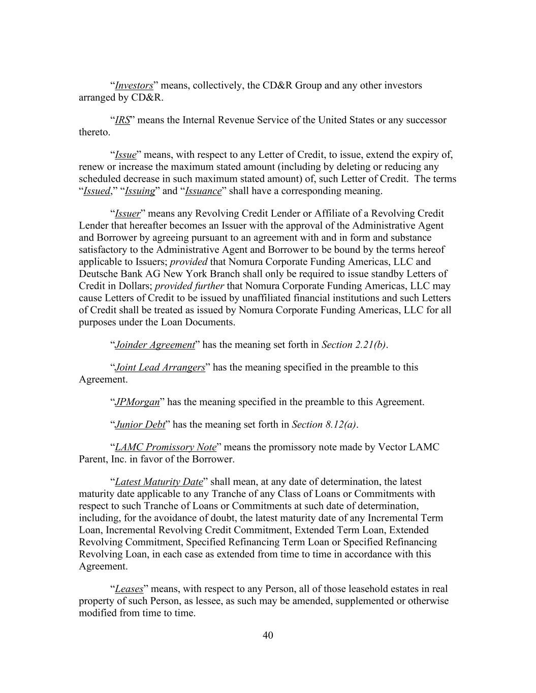40 “Investors” means, collectively, the CD&R Group and any other investors arranged by CD&R. “IRS” means the Internal Revenue Service of the United States or any successor thereto. “Issue” means, with respect to any Letter of Credit, to issue, extend the expiry of, renew or increase the maximum stated amount (including by deleting or reducing any scheduled decrease in such maximum stated amount) of, such Letter of Credit. The terms “Issued,” “Issuing” and “Issuance” shall have a corresponding meaning. “Issuer” means any Revolving Credit Lender or Affiliate of a Revolving Credit Lender that hereafter becomes an Issuer with the approval of the Administrative Agent and Borrower by agreeing pursuant to an agreement with and in form and substance satisfactory to the Administrative Agent and Borrower to be bound by the terms hereof applicable to Issuers; provided that Nomura Corporate Funding Americas, LLC and Deutsche Bank AG New York Branch shall only be required to issue standby Letters of Credit in Dollars; provided further that Nomura Corporate Funding Americas, LLC may cause Letters of Credit to be issued by unaffiliated financial institutions and such Letters of Credit shall be treated as issued by Nomura Corporate Funding Americas, LLC for all purposes under the Loan Documents. “Joinder Agreement” has the meaning set forth in Section 2.21(b). “Joint Lead Arrangers” has the meaning specified in the preamble to this Agreement. “JPMorgan” has the meaning specified in the preamble to this Agreement. “Junior Debt” has the meaning set forth in Section 8.12(a). “LAMC Promissory Note” means the promissory note made by Vector LAMC Parent, Inc. in favor of the Borrower. “Latest Maturity Date” shall mean, at any date of determination, the latest maturity date applicable to any Tranche of any Class of Loans or Commitments with respect to such Tranche of Loans or Commitments at such date of determination, including, for the avoidance of doubt, the latest maturity date of any Incremental Term Loan, Incremental Revolving Credit Commitment, Extended Term Loan, Extended Revolving Commitment, Specified Refinancing Term Loan or Specified Refinancing Revolving Loan, in each case as extended from time to time in accordance with this Agreement. “Leases” means, with respect to any Person, all of those leasehold estates in real property of such Person, as lessee, as such may be amended, supplemented or otherwise modified from time to time.