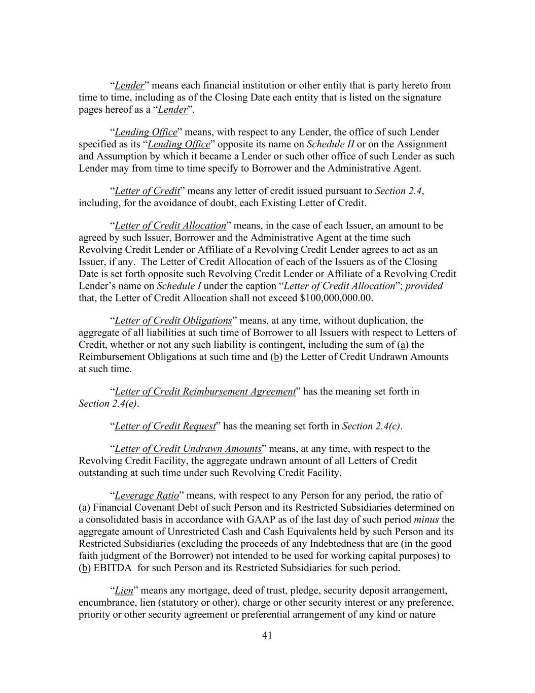 41 “Lender” means each financial institution or other entity that is party hereto from time to time, including as of the Closing Date each entity that is listed on the signature pages hereof as a “Lender”. “Lending Office” means, with respect to any Lender, the office of such Lender specified as its “Lending Office” opposite its name on Schedule II or on the Assignment and Assumption by which it became a Lender or such other office of such Lender as such Lender may from time to time specify to Borrower and the Administrative Agent. “Letter of Credit” means any letter of credit issued pursuant to Section 2.4, including, for the avoidance of doubt, each Existing Letter of Credit. “Letter of Credit Allocation” means, in the case of each Issuer, an amount to be agreed by such Issuer, Borrower and the Administrative Agent at the time such Revolving Credit Lender or Affiliate of a Revolving Credit Lender agrees to act as an Issuer, if any. The Letter of Credit Allocation of each of the Issuers as of the Closing Date is set forth opposite such Revolving Credit Lender or Affiliate of a Revolving Credit Lender’s name on Schedule I under the caption “Letter of Credit Allocation”; provided that, the Letter of Credit Allocation shall not exceed $100,000,000.00. “Letter of Credit Obligations” means, at any time, without duplication, the aggregate of all liabilities at such time of Borrower to all Issuers with respect to Letters of Credit, whether or not any such liability is contingent, including the sum of (a) the Reimbursement Obligations at such time and (b) the Letter of Credit Undrawn Amounts at such time. “Letter of Credit Reimbursement Agreement” has the meaning set forth in Section 2.4(e). “Letter of Credit Request” has the meaning set forth in Section 2.4(c). “Letter of Credit Undrawn Amounts” means, at any time, with respect to the Revolving Credit Facility, the aggregate undrawn amount of all Letters of Credit outstanding at such time under such Revolving Credit Facility. “Leverage Ratio” means, with respect to any Person for any period, the ratio of (a) Financial Covenant Debt of such Person and its Restricted Subsidiaries determined on a consolidated basis in accordance with GAAP as of the last day of such period minus the aggregate amount of Unrestricted Cash and Cash Equivalents held by such Person and its Restricted Subsidiaries (excluding the proceeds of any Indebtedness that are (in the good faith judgment of the Borrower) not intended to be used for working capital purposes) to (b) EBITDA for such Person and its Restricted Subsidiaries for such period. “Lien” means any mortgage, deed of trust, pledge, security deposit arrangement, encumbrance, lien (statutory or other), charge or other security interest or any preference, priority or other security agreement or preferential arrangement of any kind or nature