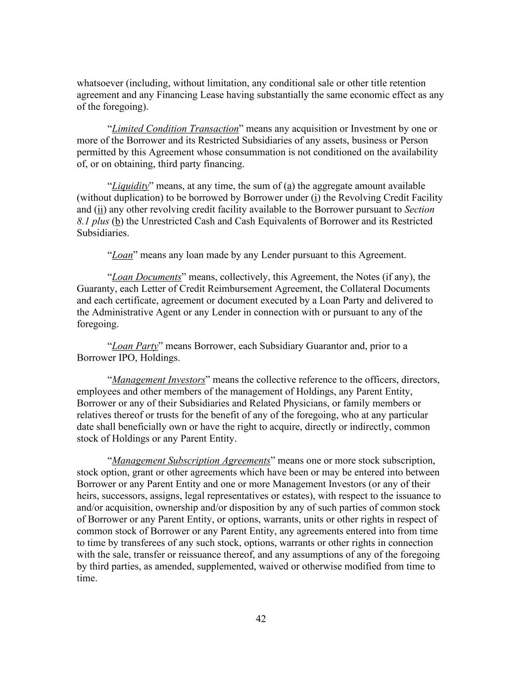 42 whatsoever (including, without limitation, any conditional sale or other title retention agreement and any Financing Lease having substantially the same economic effect as any of the foregoing). “Limited Condition Transaction” means any acquisition or Investment by one or more of the Borrower and its Restricted Subsidiaries of any assets, business or Person permitted by this Agreement whose consummation is not conditioned on the availability of, or on obtaining, third party financing. “Liquidity” means, at any time, the sum of (a) the aggregate amount available (without duplication) to be borrowed by Borrower under (i) the Revolving Credit Facility and (ii) any other revolving credit facility available to the Borrower pursuant to Section 8.1 plus (b) the Unrestricted Cash and Cash Equivalents of Borrower and its Restricted Subsidiaries. “Loan” means any loan made by any Lender pursuant to this Agreement. “Loan Documents” means, collectively, this Agreement, the Notes (if any), the Guaranty, each Letter of Credit Reimbursement Agreement, the Collateral Documents and each certificate, agreement or document executed by a Loan Party and delivered to the Administrative Agent or any Lender in connection with or pursuant to any of the foregoing. “Loan Party” means Borrower, each Subsidiary Guarantor and, prior to a Borrower IPO, Holdings. “Management Investors” means the collective reference to the officers, directors, employees and other members of the management of Holdings, any Parent Entity, Borrower or any of their Subsidiaries and Related Physicians, or family members or relatives thereof or trusts for the benefit of any of the foregoing, who at any particular date shall beneficially own or have the right to acquire, directly or indirectly, common stock of Holdings or any Parent Entity. “Management Subscription Agreements” means one or more stock subscription, stock option, grant or other agreements which have been or may be entered into between Borrower or any Parent Entity and one or more Management Investors (or any of their heirs, successors, assigns, legal representatives or estates), with respect to the issuance to and/or acquisition, ownership and/or disposition by any of such parties of common stock of Borrower or any Parent Entity, or options, warrants, units or other rights in respect of common stock of Borrower or any Parent Entity, any agreements entered into from time to time by transferees of any such stock, options, warrants or other rights in connection with the sale, transfer or reissuance thereof, and any assumptions of any of the foregoing by third parties, as amended, supplemented, waived or otherwise modified from time to time.
