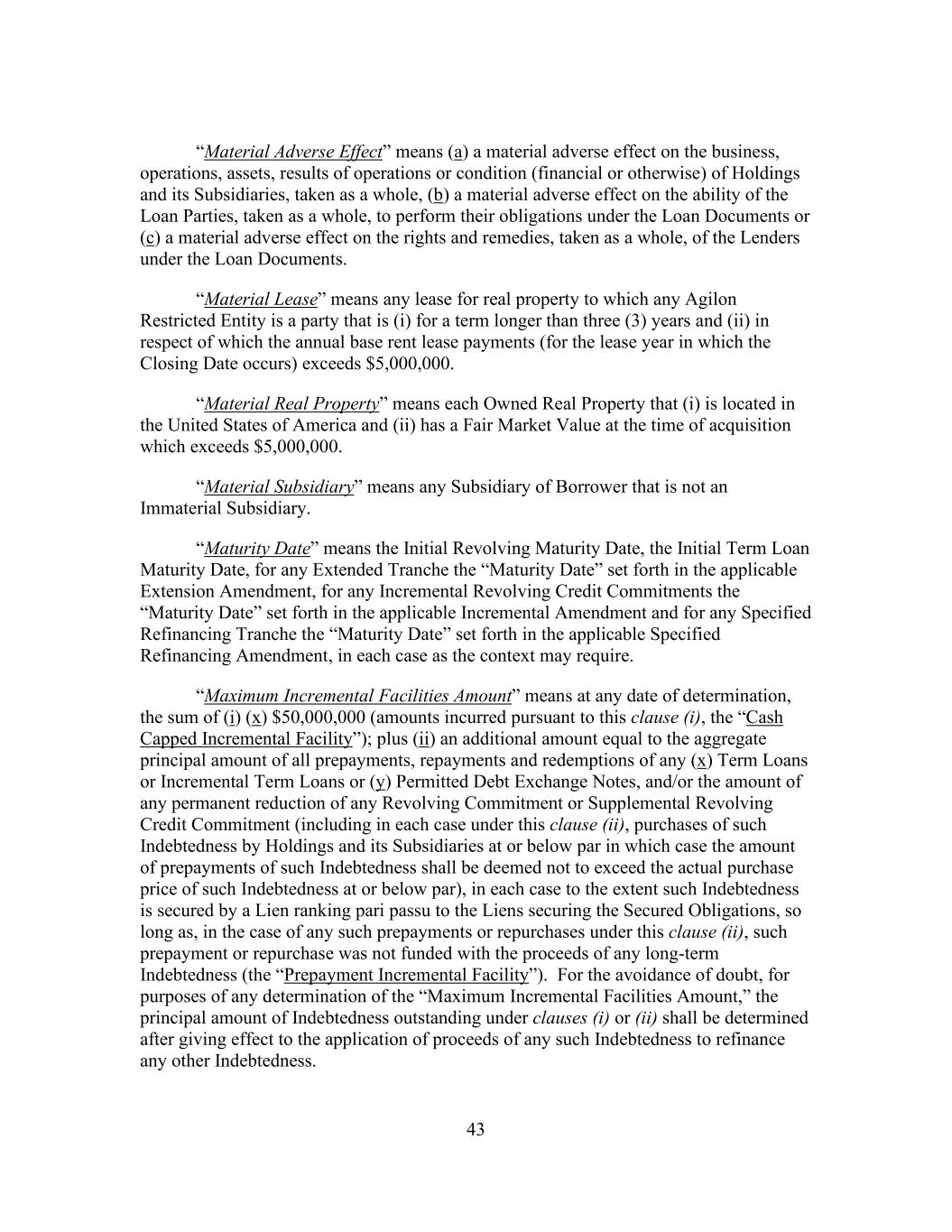 43 “Material Adverse Effect” means (a) a material adverse effect on the business, operations, assets, results of operations or condition (financial or otherwise) of Holdings and its Subsidiaries, taken as a whole, (b) a material adverse effect on the ability of the Loan Parties, taken as a whole, to perform their obligations under the Loan Documents or (c) a material adverse effect on the rights and remedies, taken as a whole, of the Lenders under the Loan Documents. “Material Lease” means any lease for real property to which any Agilon Restricted Entity is a party that is (i) for a term longer than three (3) years and (ii) in respect of which the annual base rent lease payments (for the lease year in which the Closing Date occurs) exceeds $5,000,000. “Material Real Property” means each Owned Real Property that (i) is located in the United States of America and (ii) has a Fair Market Value at the time of acquisition which exceeds $5,000,000. “Material Subsidiary” means any Subsidiary of Borrower that is not an Immaterial Subsidiary. “Maturity Date” means the Initial Revolving Maturity Date, the Initial Term Loan Maturity Date, for any Extended Tranche the “Maturity Date” set forth in the applicable Extension Amendment, for any Incremental Revolving Credit Commitments the “Maturity Date” set forth in the applicable Incremental Amendment and for any Specified Refinancing Tranche the “Maturity Date” set forth in the applicable Specified Refinancing Amendment, in each case as the context may require. “Maximum Incremental Facilities Amount” means at any date of determination, the sum of (i) (x) $50,000,000 (amounts incurred pursuant to this clause (i), the “Cash Capped Incremental Facility”); plus (ii) an additional amount equal to the aggregate principal amount of all prepayments, repayments and redemptions of any (x) Term Loans or Incremental Term Loans or (y) Permitted Debt Exchange Notes, and/or the amount of any permanent reduction of any Revolving Commitment or Supplemental Revolving Credit Commitment (including in each case under this clause (ii), purchases of such Indebtedness by Holdings and its Subsidiaries at or below par in which case the amount of prepayments of such Indebtedness shall be deemed not to exceed the actual purchase price of such Indebtedness at or below par), in each case to the extent such Indebtedness is secured by a Lien ranking pari passu to the Liens securing the Secured Obligations, so long as, in the case of any such prepayments or repurchases under this clause (ii), such prepayment or repurchase was not funded with the proceeds of any long-term Indebtedness (the “Prepayment Incremental Facility”). For the avoidance of doubt, for purposes of any determination of the “Maximum Incremental Facilities Amount,” the principal amount of Indebtedness outstanding under clauses (i) or (ii) shall be determined after giving effect to the application of proceeds of any such Indebtedness to refinance any other Indebtedness.
