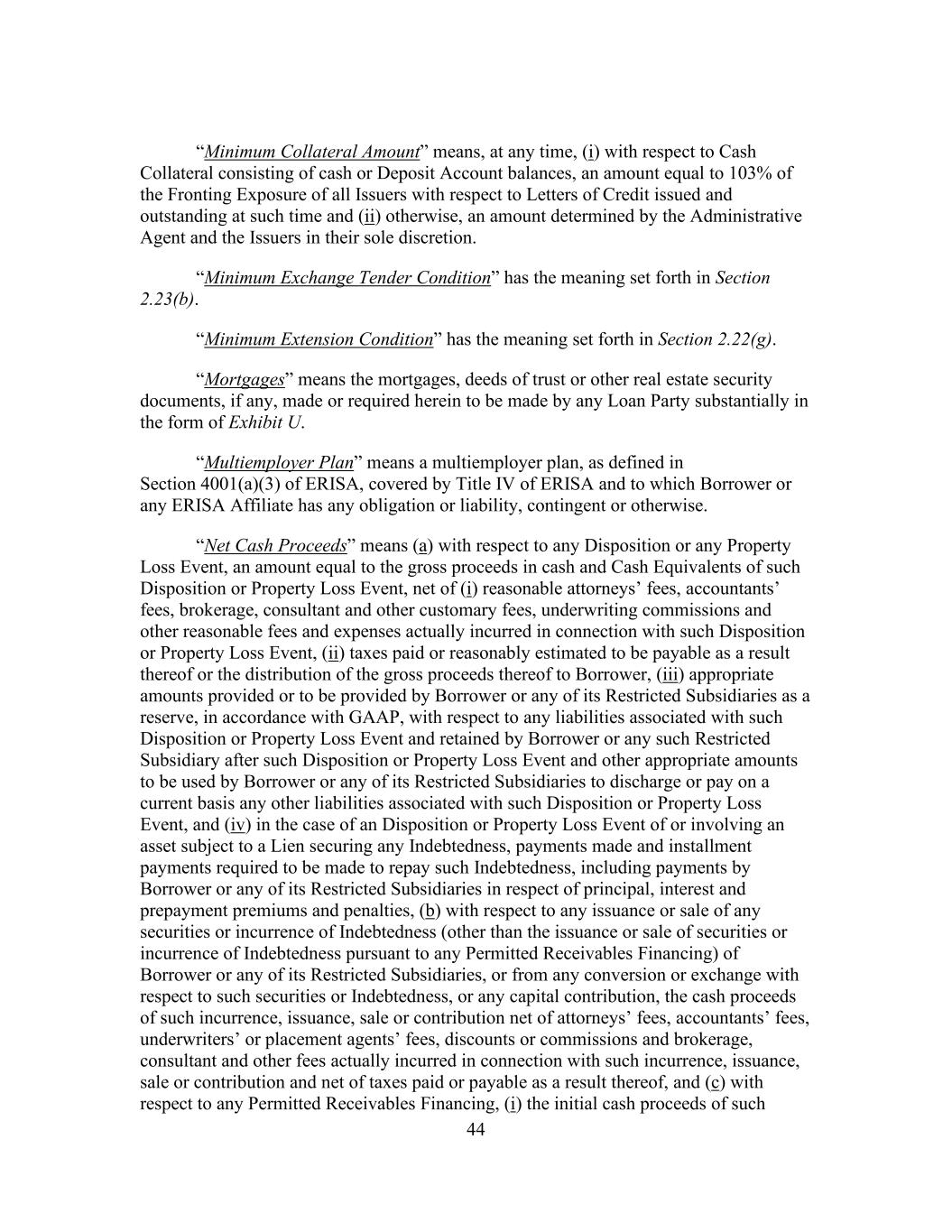 44 “Minimum Collateral Amount” means, at any time, (i) with respect to Cash Collateral consisting of cash or Deposit Account balances, an amount equal to 103% of the Fronting Exposure of all Issuers with respect to Letters of Credit issued and outstanding at such time and (ii) otherwise, an amount determined by the Administrative Agent and the Issuers in their sole discretion. “Minimum Exchange Tender Condition” has the meaning set forth in Section 2.23(b). “Minimum Extension Condition” has the meaning set forth in Section 2.22(g). “Mortgages” means the mortgages, deeds of trust or other real estate security documents, if any, made or required herein to be made by any Loan Party substantially in the form of Exhibit U. “Multiemployer Plan” means a multiemployer plan, as defined in Section 4001(a)(3) of ERISA, covered by Title IV of ERISA and to which Borrower or any ERISA Affiliate has any obligation or liability, contingent or otherwise. “Net Cash Proceeds” means (a) with respect to any Disposition or any Property Loss Event, an amount equal to the gross proceeds in cash and Cash Equivalents of such Disposition or Property Loss Event, net of (i) reasonable attorneys’ fees, accountants’ fees, brokerage, consultant and other customary fees, underwriting commissions and other reasonable fees and expenses actually incurred in connection with such Disposition or Property Loss Event, (ii) taxes paid or reasonably estimated to be payable as a result thereof or the distribution of the gross proceeds thereof to Borrower, (iii) appropriate amounts provided or to be provided by Borrower or any of its Restricted Subsidiaries as a reserve, in accordance with GAAP, with respect to any liabilities associated with such Disposition or Property Loss Event and retained by Borrower or any such Restricted Subsidiary after such Disposition or Property Loss Event and other appropriate amounts to be used by Borrower or any of its Restricted Subsidiaries to discharge or pay on a current basis any other liabilities associated with such Disposition or Property Loss Event, and (iv) in the case of an Disposition or Property Loss Event of or involving an asset subject to a Lien securing any Indebtedness, payments made and installment payments required to be made to repay such Indebtedness, including payments by Borrower or any of its Restricted Subsidiaries in respect of principal, interest and prepayment premiums and penalties, (b) with respect to any issuance or sale of any securities or incurrence of Indebtedness (other than the issuance or sale of securities or incurrence of Indebtedness pursuant to any Permitted Receivables Financing) of Borrower or any of its Restricted Subsidiaries, or from any conversion or exchange with respect to such securities or Indebtedness, or any capital contribution, the cash proceeds of such incurrence, issuance, sale or contribution net of attorneys’ fees, accountants’ fees, underwriters’ or placement agents’ fees, discounts or commissions and brokerage, consultant and other fees actually incurred in connection with such incurrence, issuance, sale or contribution and net of taxes paid or payable as a result thereof, and (c) with respect to any Permitted Receivables Financing, (i) the initial cash proceeds of such