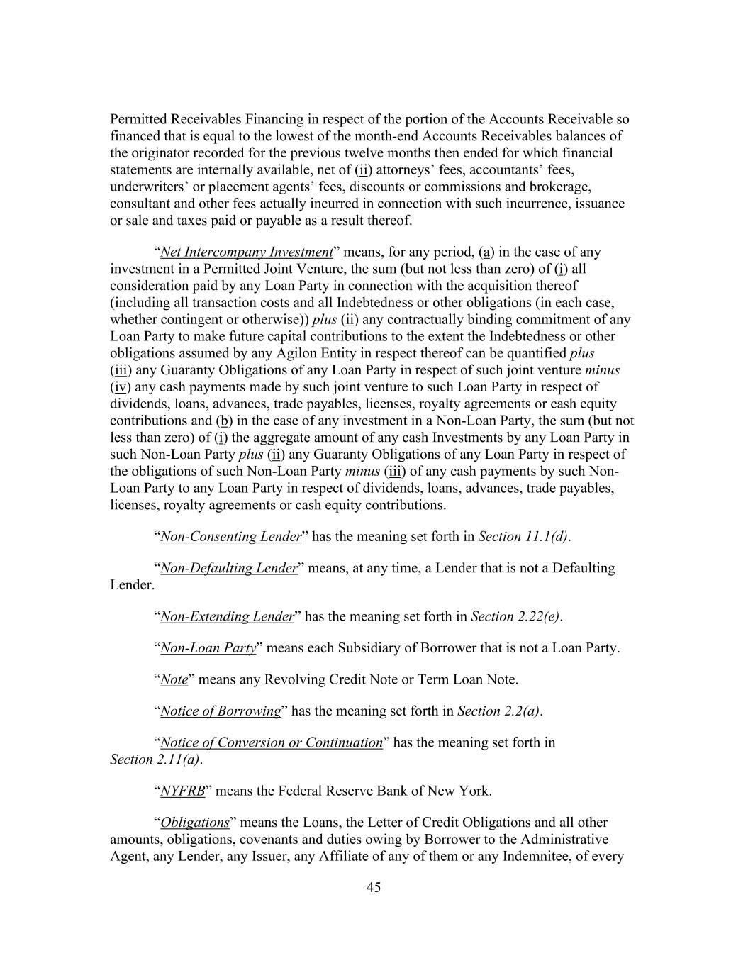 45 Permitted Receivables Financing in respect of the portion of the Accounts Receivable so financed that is equal to the lowest of the month-end Accounts Receivables balances of the originator recorded for the previous twelve months then ended for which financial statements are internally available, net of (ii) attorneys’ fees, accountants’ fees, underwriters’ or placement agents’ fees, discounts or commissions and brokerage, consultant and other fees actually incurred in connection with such incurrence, issuance or sale and taxes paid or payable as a result thereof. “Net Intercompany Investment” means, for any period, (a) in the case of any investment in a Permitted Joint Venture, the sum (but not less than zero) of (i) all consideration paid by any Loan Party in connection with the acquisition thereof (including all transaction costs and all Indebtedness or other obligations (in each case, whether contingent or otherwise)) plus (ii) any contractually binding commitment of any Loan Party to make future capital contributions to the extent the Indebtedness or other obligations assumed by any Agilon Entity in respect thereof can be quantified plus (iii) any Guaranty Obligations of any Loan Party in respect of such joint venture minus (iv) any cash payments made by such joint venture to such Loan Party in respect of dividends, loans, advances, trade payables, licenses, royalty agreements or cash equity contributions and (b) in the case of any investment in a Non-Loan Party, the sum (but not less than zero) of (i) the aggregate amount of any cash Investments by any Loan Party in such Non-Loan Party plus (ii) any Guaranty Obligations of any Loan Party in respect of the obligations of such Non-Loan Party minus (iii) of any cash payments by such Non- Loan Party to any Loan Party in respect of dividends, loans, advances, trade payables, licenses, royalty agreements or cash equity contributions. “Non-Consenting Lender” has the meaning set forth in Section 11.1(d). “Non-Defaulting Lender” means, at any time, a Lender that is not a Defaulting Lender. “Non-Extending Lender” has the meaning set forth in Section 2.22(e). “Non-Loan Party” means each Subsidiary of Borrower that is not a Loan Party. “Note” means any Revolving Credit Note or Term Loan Note. “Notice of Borrowing” has the meaning set forth in Section 2.2(a). “Notice of Conversion or Continuation” has the meaning set forth in Section 2.11(a). “NYFRB” means the Federal Reserve Bank of New York. “Obligations” means the Loans, the Letter of Credit Obligations and all other amounts, obligations, covenants and duties owing by Borrower to the Administrative Agent, any Lender, any Issuer, any Affiliate of any of them or any Indemnitee, of every