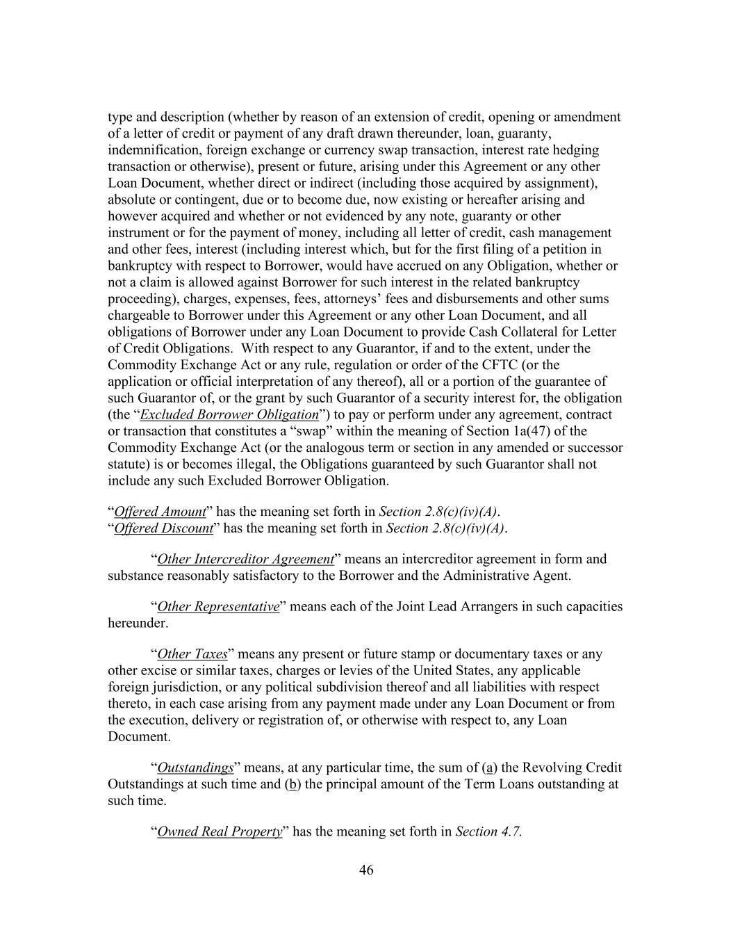 46 type and description (whether by reason of an extension of credit, opening or amendment of a letter of credit or payment of any draft drawn thereunder, loan, guaranty, indemnification, foreign exchange or currency swap transaction, interest rate hedging transaction or otherwise), present or future, arising under this Agreement or any other Loan Document, whether direct or indirect (including those acquired by assignment), absolute or contingent, due or to become due, now existing or hereafter arising and however acquired and whether or not evidenced by any note, guaranty or other instrument or for the payment of money, including all letter of credit, cash management and other fees, interest (including interest which, but for the first filing of a petition in bankruptcy with respect to Borrower, would have accrued on any Obligation, whether or not a claim is allowed against Borrower for such interest in the related bankruptcy proceeding), charges, expenses, fees, attorneys’ fees and disbursements and other sums chargeable to Borrower under this Agreement or any other Loan Document, and all obligations of Borrower under any Loan Document to provide Cash Collateral for Letter of Credit Obligations. With respect to any Guarantor, if and to the extent, under the Commodity Exchange Act or any rule, regulation or order of the CFTC (or the application or official interpretation of any thereof), all or a portion of the guarantee of such Guarantor of, or the grant by such Guarantor of a security interest for, the obligation (the “Excluded Borrower Obligation”) to pay or perform under any agreement, contract or transaction that constitutes a “swap” within the meaning of Section 1a(47) of the Commodity Exchange Act (or the analogous term or section in any amended or successor statute) is or becomes illegal, the Obligations guaranteed by such Guarantor shall not include any such Excluded Borrower Obligation. “Offered Amount” has the meaning set forth in Section 2.8(c)(iv)(A). “Offered Discount” has the meaning set forth in Section 2.8(c)(iv)(A). “Other Intercreditor Agreement” means an intercreditor agreement in form and substance reasonably satisfactory to the Borrower and the Administrative Agent. “Other Representative” means each of the Joint Lead Arrangers in such capacities hereunder. “Other Taxes” means any present or future stamp or documentary taxes or any other excise or similar taxes, charges or levies of the United States, any applicable foreign jurisdiction, or any political subdivision thereof and all liabilities with respect thereto, in each case arising from any payment made under any Loan Document or from the execution, delivery or registration of, or otherwise with respect to, any Loan Document. “Outstandings” means, at any particular time, the sum of (a) the Revolving Credit Outstandings at such time and (b) the principal amount of the Term Loans outstanding at such time. “Owned Real Property” has the meaning set forth in Section 4.7.