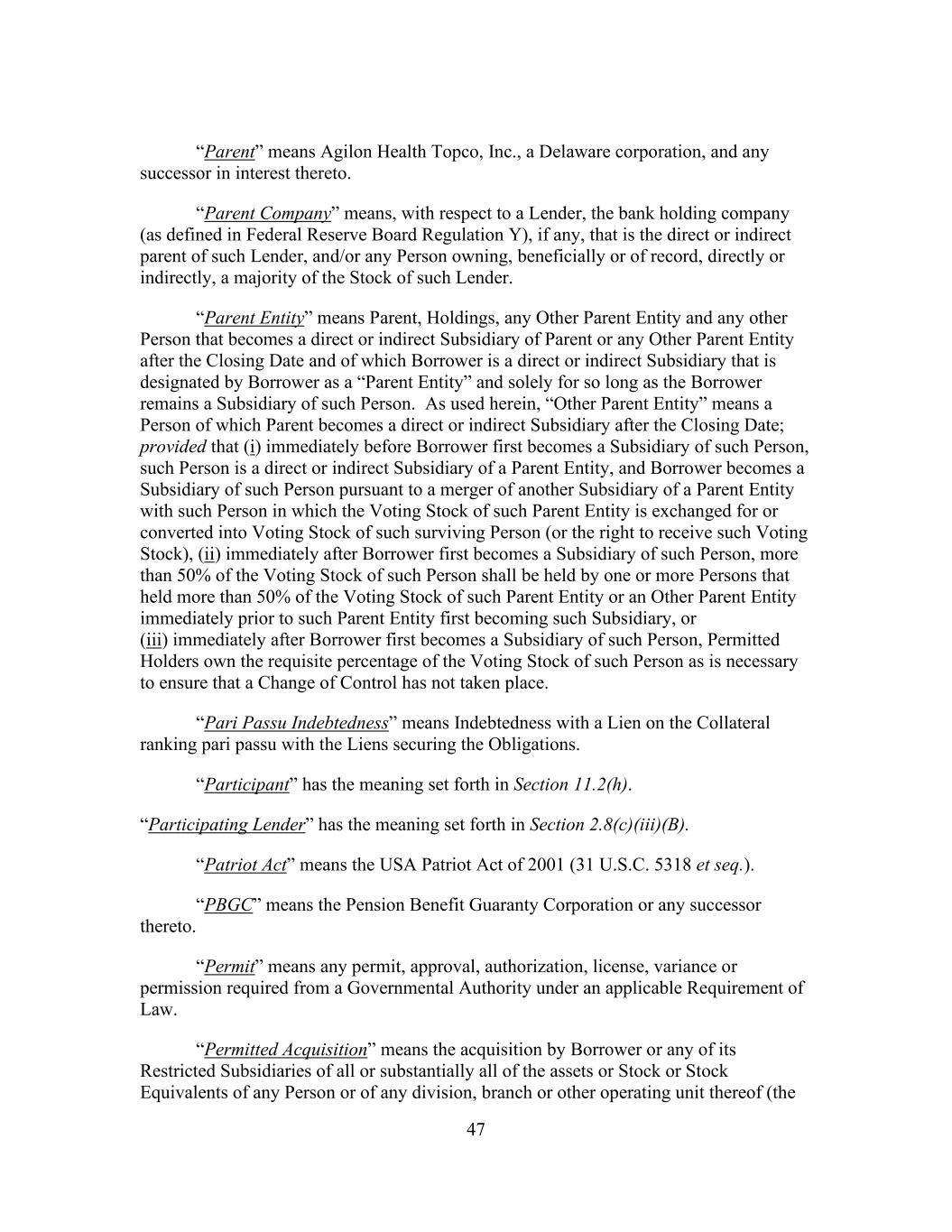 47 “Parent” means Agilon Health Topco, Inc., a Delaware corporation, and any successor in interest thereto. “Parent Company” means, with respect to a Lender, the bank holding company (as defined in Federal Reserve Board Regulation Y), if any, that is the direct or indirect parent of such Lender, and/or any Person owning, beneficially or of record, directly or indirectly, a majority of the Stock of such Lender. “Parent Entity” means Parent, Holdings, any Other Parent Entity and any other Person that becomes a direct or indirect Subsidiary of Parent or any Other Parent Entity after the Closing Date and of which Borrower is a direct or indirect Subsidiary that is designated by Borrower as a “Parent Entity” and solely for so long as the Borrower remains a Subsidiary of such Person. As used herein, “Other Parent Entity” means a Person of which Parent becomes a direct or indirect Subsidiary after the Closing Date; provided that (i) immediately before Borrower first becomes a Subsidiary of such Person, such Person is a direct or indirect Subsidiary of a Parent Entity, and Borrower becomes a Subsidiary of such Person pursuant to a merger of another Subsidiary of a Parent Entity with such Person in which the Voting Stock of such Parent Entity is exchanged for or converted into Voting Stock of such surviving Person (or the right to receive such Voting Stock), (ii) immediately after Borrower first becomes a Subsidiary of such Person, more than 50% of the Voting Stock of such Person shall be held by one or more Persons that held more than 50% of the Voting Stock of such Parent Entity or an Other Parent Entity immediately prior to such Parent Entity first becoming such Subsidiary, or (iii) immediately after Borrower first becomes a Subsidiary of such Person, Permitted Holders own the requisite percentage of the Voting Stock of such Person as is necessary to ensure that a Change of Control has not taken place. “Pari Passu Indebtedness” means Indebtedness with a Lien on the Collateral ranking pari passu with the Liens securing the Obligations. “Participant” has the meaning set forth in Section 11.2(h). “Participating Lender” has the meaning set forth in Section 2.8(c)(iii)(B). “Patriot Act” means the USA Patriot Act of 2001 (31 U.S.C. 5318 et seq.). “PBGC” means the Pension Benefit Guaranty Corporation or any successor thereto. “Permit” means any permit, approval, authorization, license, variance or permission required from a Governmental Authority under an applicable Requirement of Law. “Permitted Acquisition” means the acquisition by Borrower or any of its Restricted Subsidiaries of all or substantially all of the assets or Stock or Stock Equivalents of any Person or of any division, branch or other operating unit thereof (the