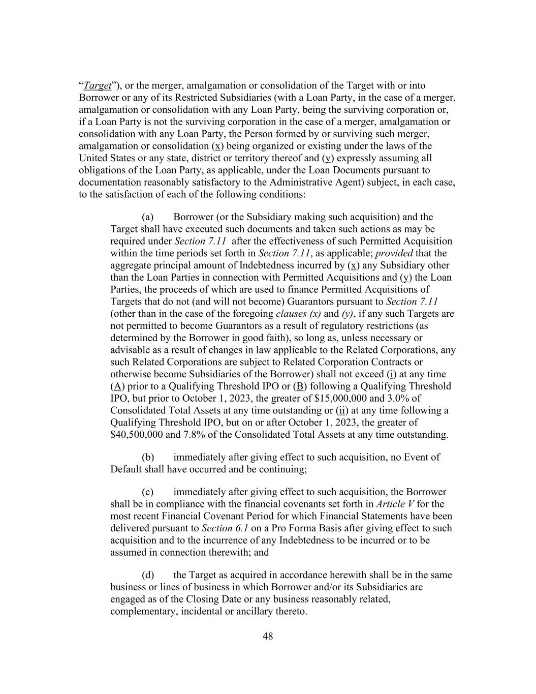 48 “Target”), or the merger, amalgamation or consolidation of the Target with or into Borrower or any of its Restricted Subsidiaries (with a Loan Party, in the case of a merger, amalgamation or consolidation with any Loan Party, being the surviving corporation or, if a Loan Party is not the surviving corporation in the case of a merger, amalgamation or consolidation with any Loan Party, the Person formed by or surviving such merger, amalgamation or consolidation (x) being organized or existing under the laws of the United States or any state, district or territory thereof and (y) expressly assuming all obligations of the Loan Party, as applicable, under the Loan Documents pursuant to documentation reasonably satisfactory to the Administrative Agent) subject, in each case, to the satisfaction of each of the following conditions: (a) Borrower (or the Subsidiary making such acquisition) and the Target shall have executed such documents and taken such actions as may be required under Section 7.11 after the effectiveness of such Permitted Acquisition within the time periods set forth in Section 7.11, as applicable; provided that the aggregate principal amount of Indebtedness incurred by (x) any Subsidiary other than the Loan Parties in connection with Permitted Acquisitions and (y) the Loan Parties, the proceeds of which are used to finance Permitted Acquisitions of Targets that do not (and will not become) Guarantors pursuant to Section 7.11 (other than in the case of the foregoing clauses (x) and (y), if any such Targets are not permitted to become Guarantors as a result of regulatory restrictions (as determined by the Borrower in good faith), so long as, unless necessary or advisable as a result of changes in law applicable to the Related Corporations, any such Related Corporations are subject to Related Corporation Contracts or otherwise become Subsidiaries of the Borrower) shall not exceed (i) at any time (A) prior to a Qualifying Threshold IPO or (B) following a Qualifying Threshold IPO, but prior to October 1, 2023, the greater of $15,000,000 and 3.0% of Consolidated Total Assets at any time outstanding or (ii) at any time following a Qualifying Threshold IPO, but on or after October 1, 2023, the greater of $40,500,000 and 7.8% of the Consolidated Total Assets at any time outstanding. (b) immediately after giving effect to such acquisition, no Event of Default shall have occurred and be continuing; (c) immediately after giving effect to such acquisition, the Borrower shall be in compliance with the financial covenants set forth in Article V for the most recent Financial Covenant Period for which Financial Statements have been delivered pursuant to Section 6.1 on a Pro Forma Basis after giving effect to such acquisition and to the incurrence of any Indebtedness to be incurred or to be assumed in connection therewith; and (d) the Target as acquired in accordance herewith shall be in the same business or lines of business in which Borrower and/or its Subsidiaries are engaged as of the Closing Date or any business reasonably related, complementary, incidental or ancillary thereto.