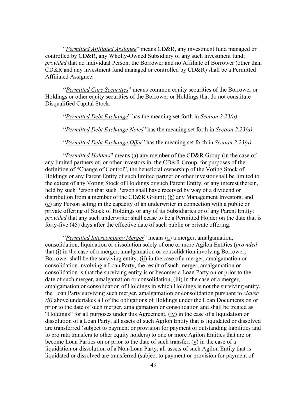 49 “Permitted Affiliated Assignee” means CD&R, any investment fund managed or controlled by CD&R, any Wholly-Owned Subsidiary of any such investment fund; provided that no individual Person, the Borrower and no Affiliate of Borrower (other than CD&R and any investment fund managed or controlled by CD&R) shall be a Permitted Affiliated Assignee. “Permitted Cure Securities” means common equity securities of the Borrower or Holdings or other equity securities of the Borrower or Holdings that do not constitute Disqualified Capital Stock. “Permitted Debt Exchange” has the meaning set forth in Section 2.23(a). “Permitted Debt Exchange Notes” has the meaning set forth in Section 2.23(a). “Permitted Debt Exchange Offer” has the meaning set forth in Section 2.23(a). “Permitted Holders” means (a) any member of the CD&R Group (in the case of any limited partners of, or other investors in, the CD&R Group, for purposes of the definition of “Change of Control”, the beneficial ownership of the Voting Stock of Holdings or any Parent Entity of such limited partner or other investor shall be limited to the extent of any Voting Stock of Holdings or such Parent Entity, or any interest therein, held by such Person that such Person shall have received by way of a dividend or distribution from a member of the CD&R Group); (b) any Management Investors; and (c) any Person acting in the capacity of an underwriter in connection with a public or private offering of Stock of Holdings or any of its Subsidiaries or of any Parent Entity; provided that any such underwriter shall cease to be a Permitted Holder on the date that is forty-five (45) days after the effective date of such public or private offering. “Permitted Intercompany Merger” means (a) a merger, amalgamation, consolidation, liquidation or dissolution solely of one or more Agilon Entities (provided that (i) in the case of a merger, amalgamation or consolidation involving Borrower, Borrower shall be the surviving entity, (ii) in the case of a merger, amalgamation or consolidation involving a Loan Party, the result of such merger, amalgamation or consolidation is that the surviving entity is or becomes a Loan Party on or prior to the date of such merger, amalgamation or consolidation, (iii) in the case of a merger, amalgamation or consolidation of Holdings in which Holdings is not the surviving entity, the Loan Party surviving such merger, amalgamation or consolidation pursuant to clause (ii) above undertakes all of the obligations of Holdings under the Loan Documents on or prior to the date of such merger, amalgamation or consolidation and shall be treated as “Holdings” for all purposes under this Agreement, (iv) in the case of a liquidation or dissolution of a Loan Party, all assets of such Agilon Entity that is liquidated or dissolved are transferred (subject to payment or provision for payment of outstanding liabilities and to pro rata transfers to other equity holders) to one or more Agilon Entities that are or become Loan Parties on or prior to the date of such transfer, (v) in the case of a liquidation or dissolution of a Non-Loan Party, all assets of such Agilon Entity that is liquidated or dissolved are transferred (subject to payment or provision for payment of