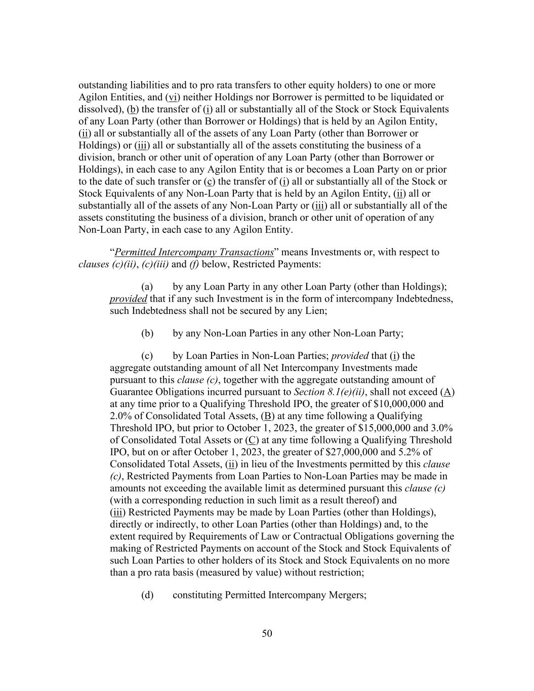 50 outstanding liabilities and to pro rata transfers to other equity holders) to one or more Agilon Entities, and (vi) neither Holdings nor Borrower is permitted to be liquidated or dissolved), (b) the transfer of (i) all or substantially all of the Stock or Stock Equivalents of any Loan Party (other than Borrower or Holdings) that is held by an Agilon Entity, (ii) all or substantially all of the assets of any Loan Party (other than Borrower or Holdings) or (iii) all or substantially all of the assets constituting the business of a division, branch or other unit of operation of any Loan Party (other than Borrower or Holdings), in each case to any Agilon Entity that is or becomes a Loan Party on or prior to the date of such transfer or (c) the transfer of (i) all or substantially all of the Stock or Stock Equivalents of any Non-Loan Party that is held by an Agilon Entity, (ii) all or substantially all of the assets of any Non-Loan Party or (iii) all or substantially all of the assets constituting the business of a division, branch or other unit of operation of any Non-Loan Party, in each case to any Agilon Entity. “Permitted Intercompany Transactions” means Investments or, with respect to clauses (c)(ii), (c)(iii) and (f) below, Restricted Payments: (a) by any Loan Party in any other Loan Party (other than Holdings); provided that if any such Investment is in the form of intercompany Indebtedness, such Indebtedness shall not be secured by any Lien; (b) by any Non-Loan Parties in any other Non-Loan Party; (c) by Loan Parties in Non-Loan Parties; provided that (i) the aggregate outstanding amount of all Net Intercompany Investments made pursuant to this clause (c), together with the aggregate outstanding amount of Guarantee Obligations incurred pursuant to Section 8.1(e)(ii), shall not exceed (A) at any time prior to a Qualifying Threshold IPO, the greater of $10,000,000 and 2.0% of Consolidated Total Assets, (B) at any time following a Qualifying Threshold IPO, but prior to October 1, 2023, the greater of $15,000,000 and 3.0% of Consolidated Total Assets or (C) at any time following a Qualifying Threshold IPO, but on or after October 1, 2023, the greater of $27,000,000 and 5.2% of Consolidated Total Assets, (ii) in lieu of the Investments permitted by this clause (c), Restricted Payments from Loan Parties to Non-Loan Parties may be made in amounts not exceeding the available limit as determined pursuant this clause (c) (with a corresponding reduction in such limit as a result thereof) and (iii) Restricted Payments may be made by Loan Parties (other than Holdings), directly or indirectly, to other Loan Parties (other than Holdings) and, to the extent required by Requirements of Law or Contractual Obligations governing the making of Restricted Payments on account of the Stock and Stock Equivalents of such Loan Parties to other holders of its Stock and Stock Equivalents on no more than a pro rata basis (measured by value) without restriction; (d) constituting Permitted Intercompany Mergers;