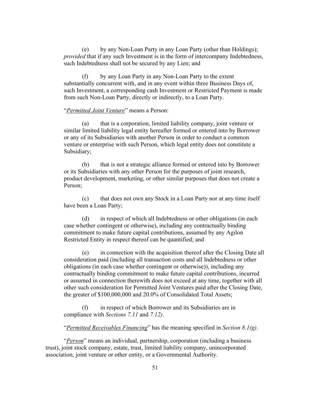 51 (e) by any Non-Loan Party in any Loan Party (other than Holdings); provided that if any such Investment is in the form of intercompany Indebtedness, such Indebtedness shall not be secured by any Lien; and (f) by any Loan Party in any Non-Loan Party to the extent substantially concurrent with, and in any event within three Business Days of, such Investment, a corresponding cash Investment or Restricted Payment is made from such Non-Loan Party, directly or indirectly, to a Loan Party. “Permitted Joint Venture” means a Person: (a) that is a corporation, limited liability company, joint venture or similar limited liability legal entity hereafter formed or entered into by Borrower or any of its Subsidiaries with another Person in order to conduct a common venture or enterprise with such Person, which legal entity does not constitute a Subsidiary; (b) that is not a strategic alliance formed or entered into by Borrower or its Subsidiaries with any other Person for the purposes of joint research, product development, marketing, or other similar purposes that does not create a Person; (c) that does not own any Stock in a Loan Party nor at any time itself have been a Loan Party; (d) in respect of which all Indebtedness or other obligations (in each case whether contingent or otherwise), including any contractually binding commitment to make future capital contributions, assumed by any Agilon Restricted Entity in respect thereof can be quantified; and (e) in connection with the acquisition thereof after the Closing Date all consideration paid (including all transaction costs and all Indebtedness or other obligations (in each case whether contingent or otherwise)), including any contractually binding commitment to make future capital contributions, incurred or assumed in connection therewith does not exceed at any time, together with all other such consideration for Permitted Joint Ventures paid after the Closing Date, the greater of $100,000,000 and 20.0% of Consolidated Total Assets; (f) in respect of which Borrower and its Subsidiaries are in compliance with Sections 7.11 and 7.12). “Permitted Receivables Financing” has the meaning specified in Section 8.1(g). “Person” means an individual, partnership, corporation (including a business trust), joint stock company, estate, trust, limited liability company, unincorporated association, joint venture or other entity, or a Governmental Authority.