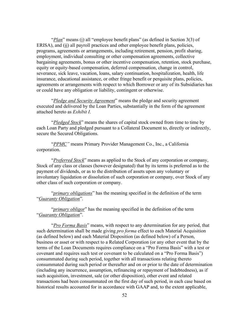 52 “Plan” means (i) all “employee benefit plans” (as defined in Section 3(3) of ERISA), and (ii) all payroll practices and other employee benefit plans, policies, programs, agreements or arrangements, including retirement, pension, profit sharing, employment, individual consulting or other compensation agreements, collective bargaining agreements, bonus or other incentive compensation, retention, stock purchase, equity or equity-based compensation, deferred compensation, change in control, severance, sick leave, vacation, loans, salary continuation, hospitalization, health, life insurance, educational assistance, or other fringe benefit or perquisite plans, policies, agreements or arrangements with respect to which Borrower or any of its Subsidiaries has or could have any obligation or liability, contingent or otherwise. “Pledge and Security Agreement” means the pledge and security agreement executed and delivered by the Loan Parties, substantially in the form of the agreement attached hereto as Exhibit I. “Pledged Stock” means the shares of capital stock owned from time to time by each Loan Party and pledged pursuant to a Collateral Document to, directly or indirectly, secure the Secured Obligations. “PPMC” means Primary Provider Management Co., Inc., a California corporation. “Preferred Stock” means as applied to the Stock of any corporation or company, Stock of any class or classes (however designated) that by its terms is preferred as to the payment of dividends, or as to the distribution of assets upon any voluntary or involuntary liquidation or dissolution of such corporation or company, over Stock of any other class of such corporation or company. “primary obligations” has the meaning specified in the definition of the term “Guaranty Obligation”. “primary obligor” has the meaning specified in the definition of the term “Guaranty Obligation”. “Pro Forma Basis” means, with respect to any determination for any period, that such determination shall be made giving pro forma effect to each Material Acquisition (as defined below) and each Material Disposition (as defined below) of a Person, business or asset or with respect to a Related Corporation (or any other event that by the terms of the Loan Documents requires compliance on a “Pro Forma Basis” with a test or covenant and requires such test or covenant to be calculated on a “Pro Forma Basis”) consummated during such period, together with all transactions relating thereto consummated during such period or thereafter and on or prior to the date of determination (including any incurrence, assumption, refinancing or repayment of Indebtedness), as if such acquisition, investment, sale (or other disposition), other event and related transactions had been consummated on the first day of such period, in each case based on historical results accounted for in accordance with GAAP and, to the extent applicable,