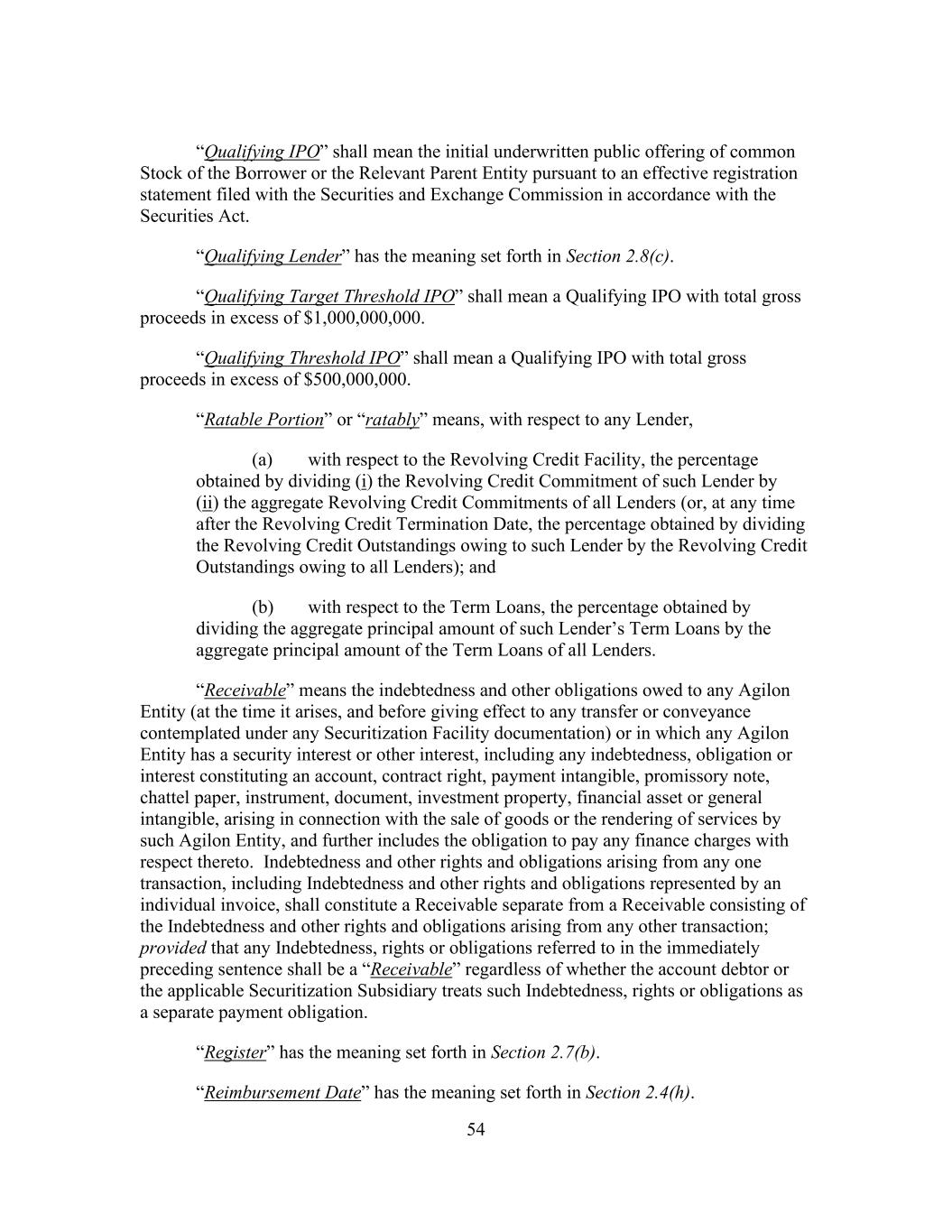 54 “Qualifying IPO” shall mean the initial underwritten public offering of common Stock of the Borrower or the Relevant Parent Entity pursuant to an effective registration statement filed with the Securities and Exchange Commission in accordance with the Securities Act. “Qualifying Lender” has the meaning set forth in Section 2.8(c). “Qualifying Target Threshold IPO” shall mean a Qualifying IPO with total gross proceeds in excess of $1,000,000,000. “Qualifying Threshold IPO” shall mean a Qualifying IPO with total gross proceeds in excess of $500,000,000. “Ratable Portion” or “ratably” means, with respect to any Lender, (a) with respect to the Revolving Credit Facility, the percentage obtained by dividing (i) the Revolving Credit Commitment of such Lender by (ii) the aggregate Revolving Credit Commitments of all Lenders (or, at any time after the Revolving Credit Termination Date, the percentage obtained by dividing the Revolving Credit Outstandings owing to such Lender by the Revolving Credit Outstandings owing to all Lenders); and (b) with respect to the Term Loans, the percentage obtained by dividing the aggregate principal amount of such Lender’s Term Loans by the aggregate principal amount of the Term Loans of all Lenders. “Receivable” means the indebtedness and other obligations owed to any Agilon Entity (at the time it arises, and before giving effect to any transfer or conveyance contemplated under any Securitization Facility documentation) or in which any Agilon Entity has a security interest or other interest, including any indebtedness, obligation or interest constituting an account, contract right, payment intangible, promissory note, chattel paper, instrument, document, investment property, financial asset or general intangible, arising in connection with the sale of goods or the rendering of services by such Agilon Entity, and further includes the obligation to pay any finance charges with respect thereto. Indebtedness and other rights and obligations arising from any one transaction, including Indebtedness and other rights and obligations represented by an individual invoice, shall constitute a Receivable separate from a Receivable consisting of the Indebtedness and other rights and obligations arising from any other transaction; provided that any Indebtedness, rights or obligations referred to in the immediately preceding sentence shall be a “Receivable” regardless of whether the account debtor or the applicable Securitization Subsidiary treats such Indebtedness, rights or obligations as a separate payment obligation. “Register” has the meaning set forth in Section 2.7(b). “Reimbursement Date” has the meaning set forth in Section 2.4(h).