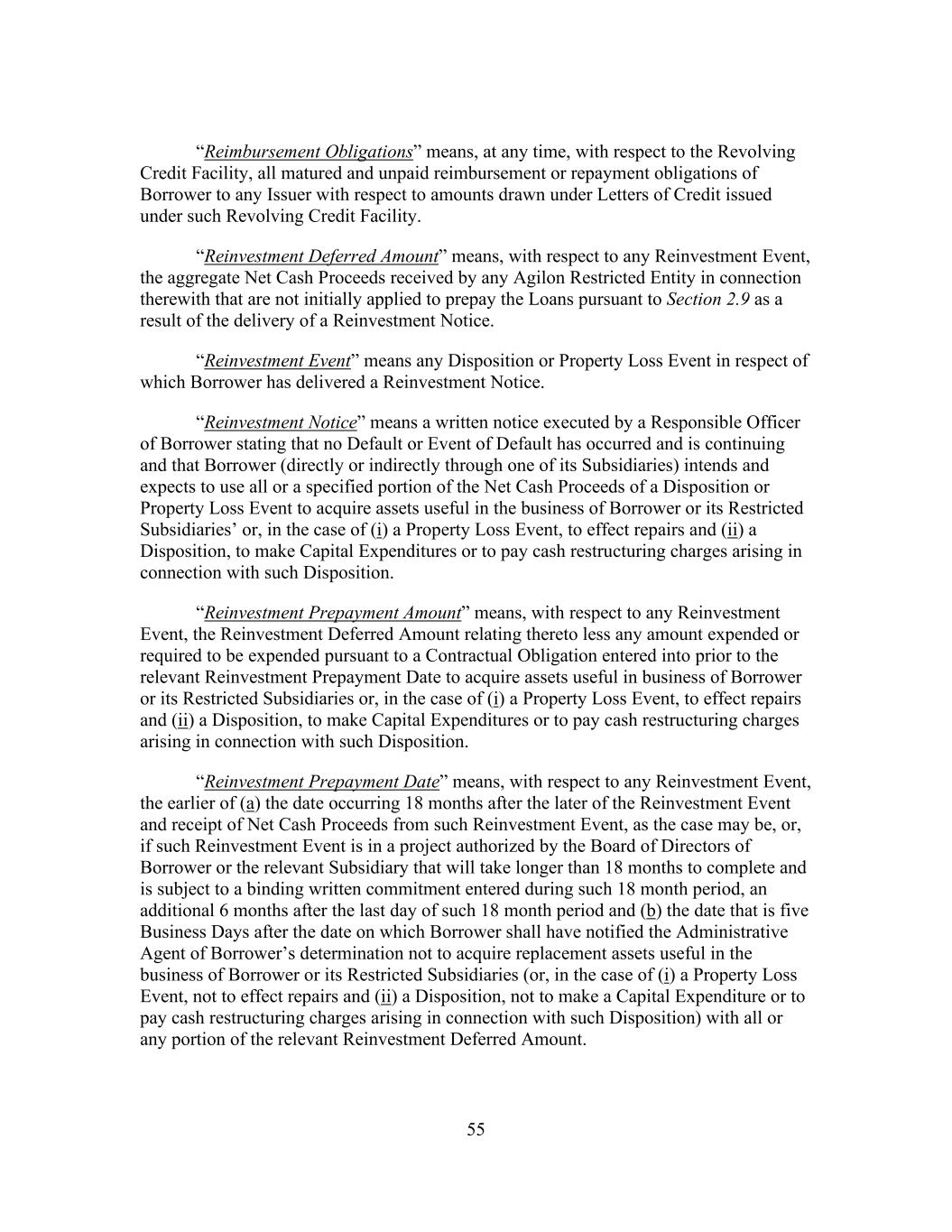 55 “Reimbursement Obligations” means, at any time, with respect to the Revolving Credit Facility, all matured and unpaid reimbursement or repayment obligations of Borrower to any Issuer with respect to amounts drawn under Letters of Credit issued under such Revolving Credit Facility. “Reinvestment Deferred Amount” means, with respect to any Reinvestment Event, the aggregate Net Cash Proceeds received by any Agilon Restricted Entity in connection therewith that are not initially applied to prepay the Loans pursuant to Section 2.9 as a result of the delivery of a Reinvestment Notice. “Reinvestment Event” means any Disposition or Property Loss Event in respect of which Borrower has delivered a Reinvestment Notice. “Reinvestment Notice” means a written notice executed by a Responsible Officer of Borrower stating that no Default or Event of Default has occurred and is continuing and that Borrower (directly or indirectly through one of its Subsidiaries) intends and expects to use all or a specified portion of the Net Cash Proceeds of a Disposition or Property Loss Event to acquire assets useful in the business of Borrower or its Restricted Subsidiaries’ or, in the case of (i) a Property Loss Event, to effect repairs and (ii) a Disposition, to make Capital Expenditures or to pay cash restructuring charges arising in connection with such Disposition. “Reinvestment Prepayment Amount” means, with respect to any Reinvestment Event, the Reinvestment Deferred Amount relating thereto less any amount expended or required to be expended pursuant to a Contractual Obligation entered into prior to the relevant Reinvestment Prepayment Date to acquire assets useful in business of Borrower or its Restricted Subsidiaries or, in the case of (i) a Property Loss Event, to effect repairs and (ii) a Disposition, to make Capital Expenditures or to pay cash restructuring charges arising in connection with such Disposition. “Reinvestment Prepayment Date” means, with respect to any Reinvestment Event, the earlier of (a) the date occurring 18 months after the later of the Reinvestment Event and receipt of Net Cash Proceeds from such Reinvestment Event, as the case may be, or, if such Reinvestment Event is in a project authorized by the Board of Directors of Borrower or the relevant Subsidiary that will take longer than 18 months to complete and is subject to a binding written commitment entered during such 18 month period, an additional 6 months after the last day of such 18 month period and (b) the date that is five Business Days after the date on which Borrower shall have notified the Administrative Agent of Borrower’s determination not to acquire replacement assets useful in the business of Borrower or its Restricted Subsidiaries (or, in the case of (i) a Property Loss Event, not to effect repairs and (ii) a Disposition, not to make a Capital Expenditure or to pay cash restructuring charges arising in connection with such Disposition) with all or any portion of the relevant Reinvestment Deferred Amount.